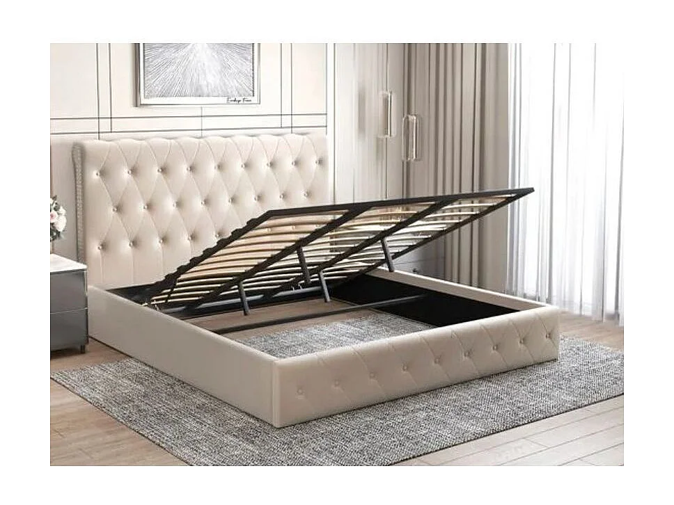 Lit coffre capitonné velours Korzi-Couleur Beige-180x200