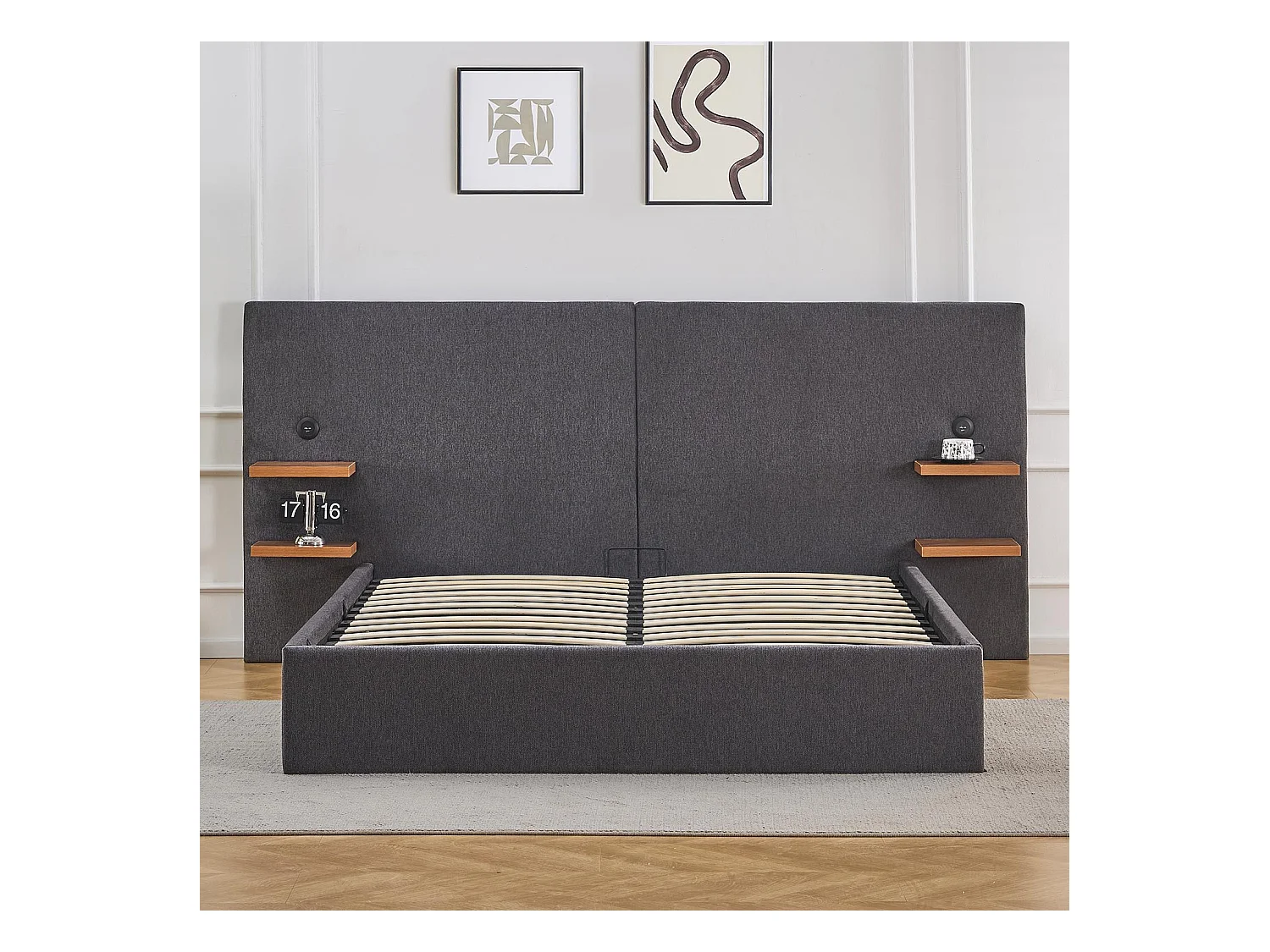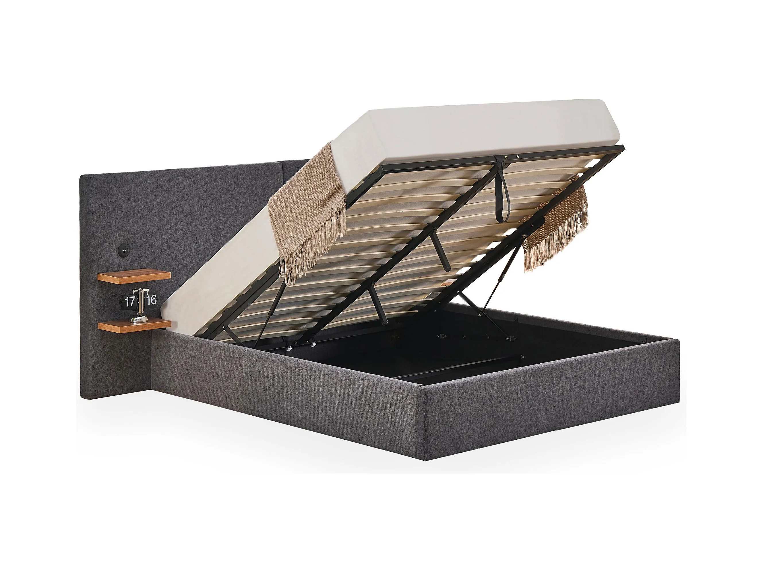 Lit-coffre complet avec tablettes et ports USB intégrés Lukas 140x190cm Tissu Gris
