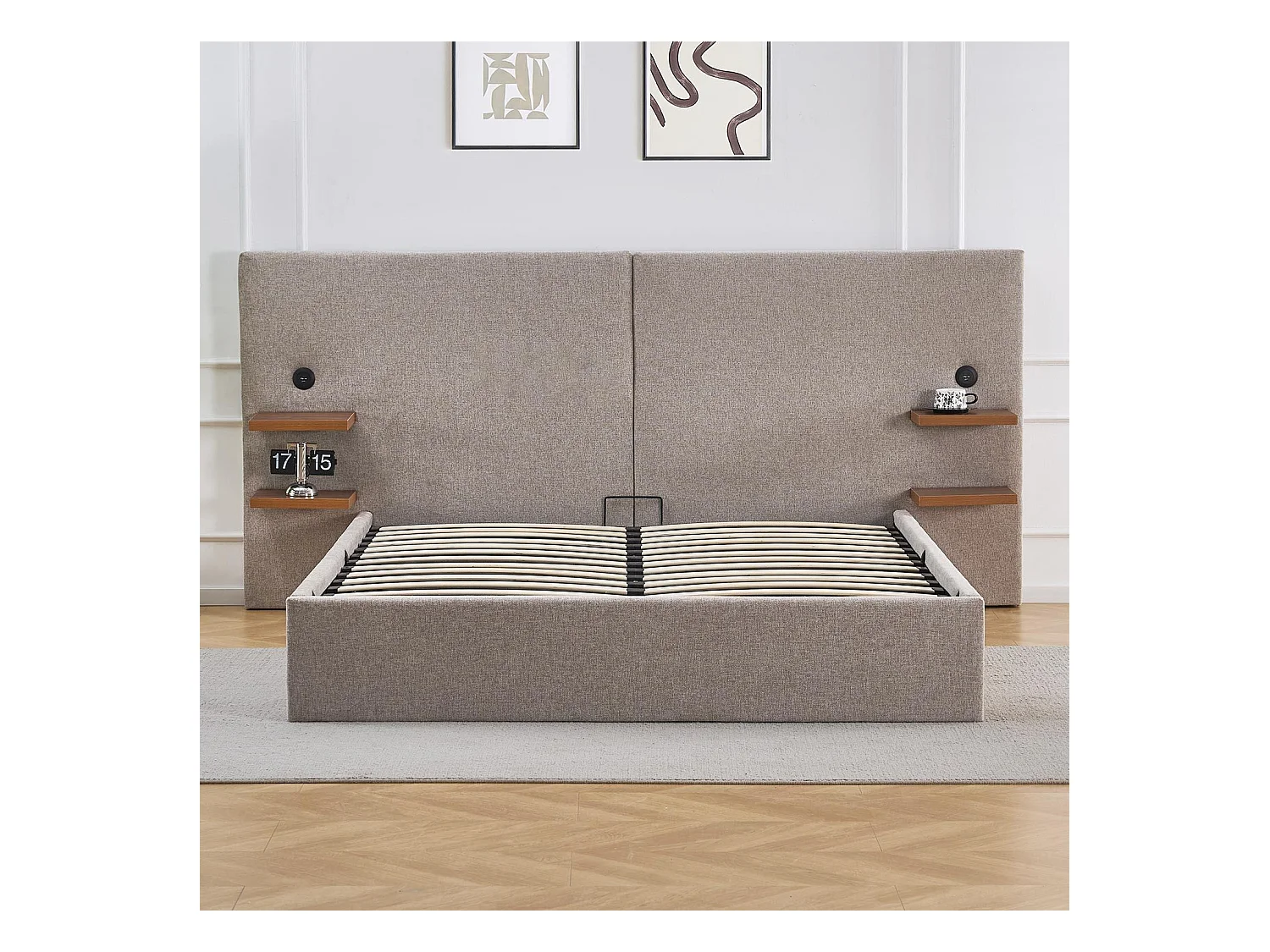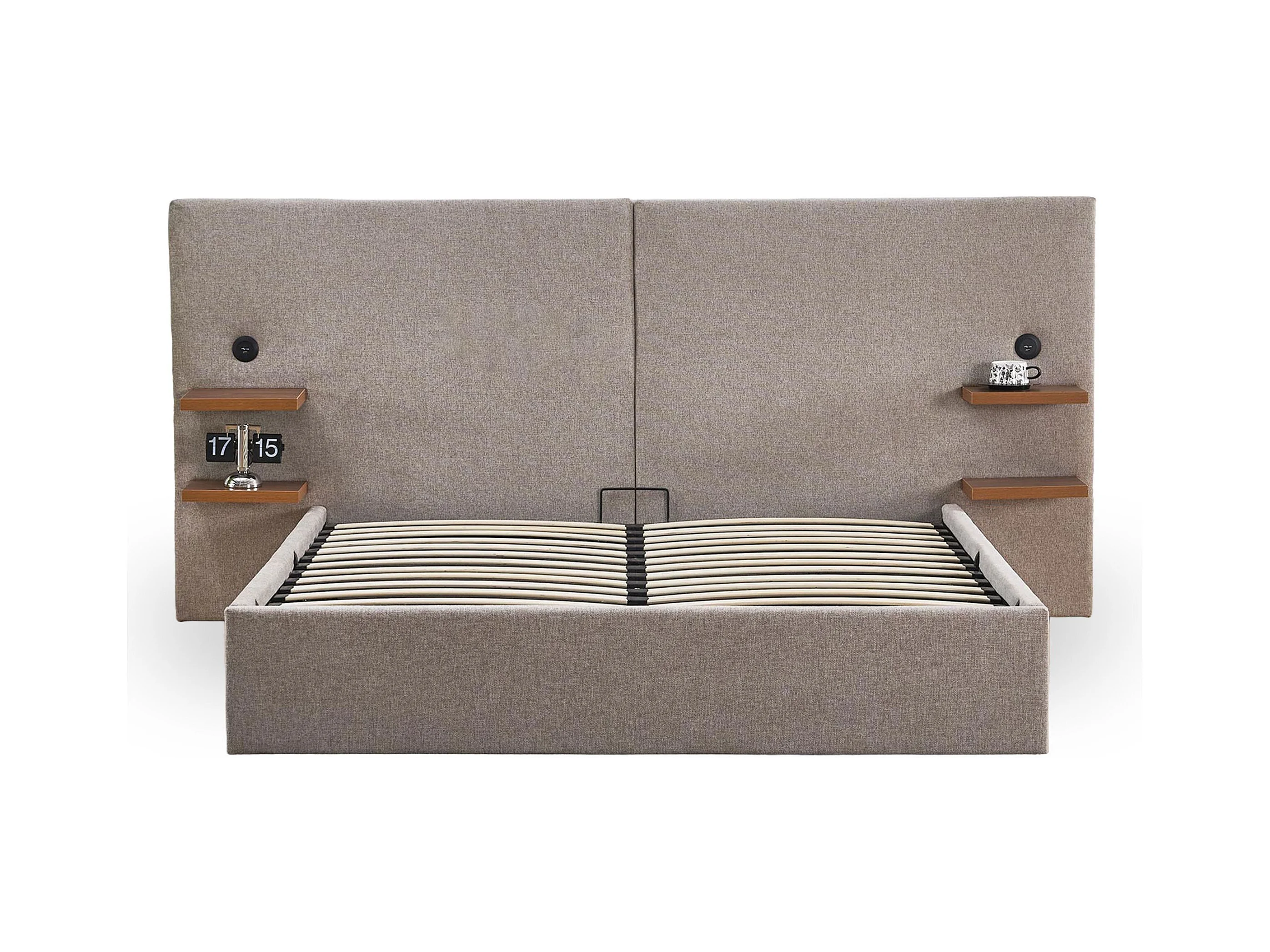 Lit-coffre complet avec tablettes et ports USB intégrés Lukas 140x190cm Tissu Taupe clair