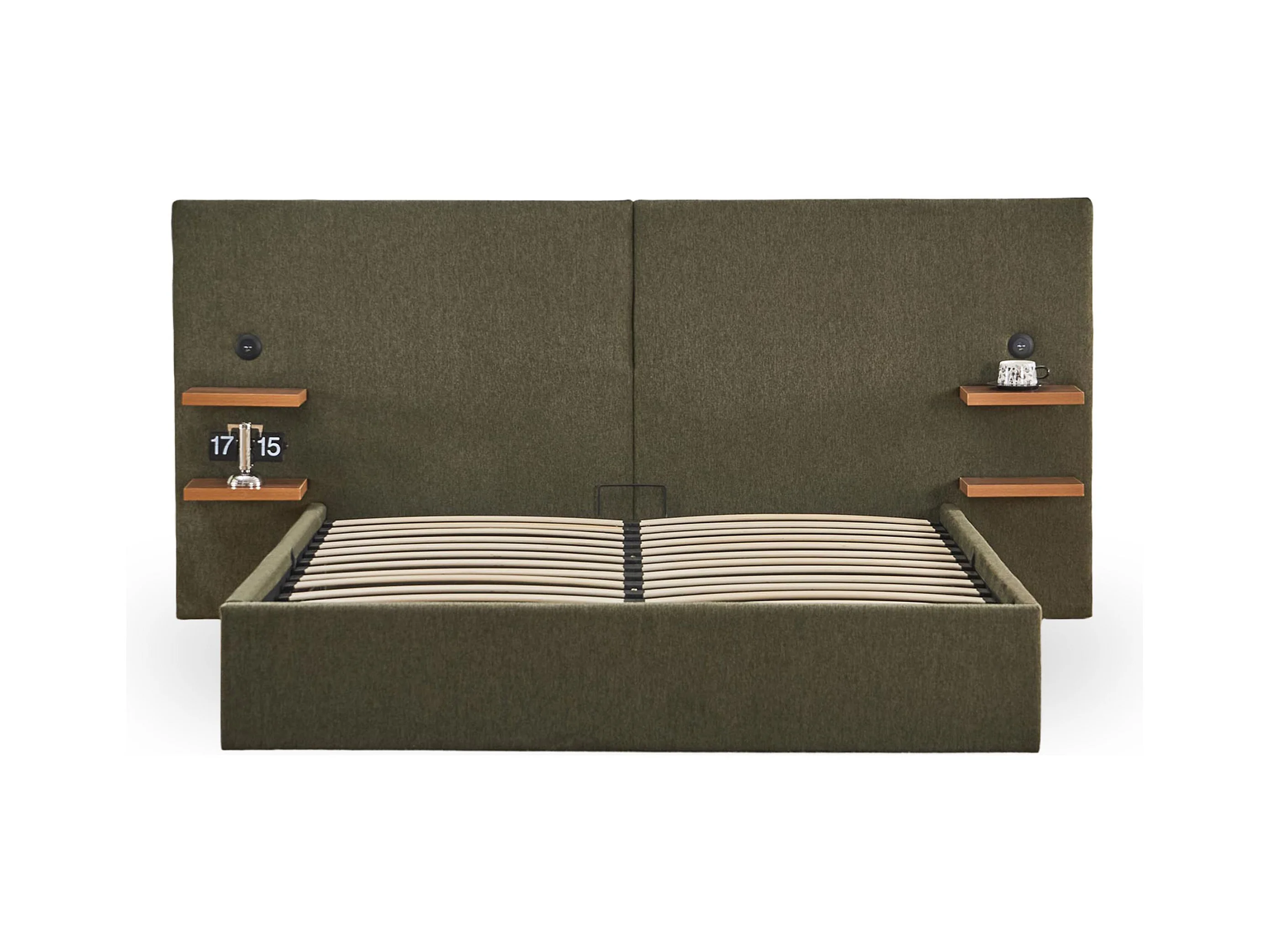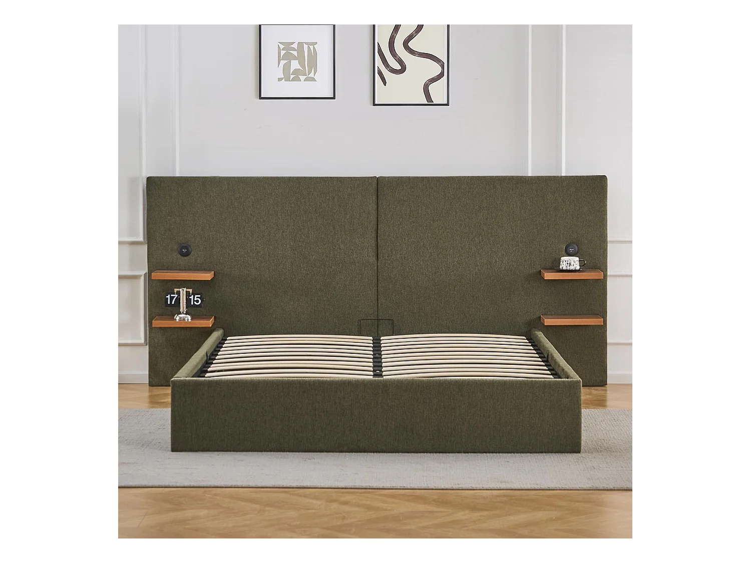 Lit-coffre complet avec tablettes et ports USB intégrés Lukas 140x190cm Tissu Vert