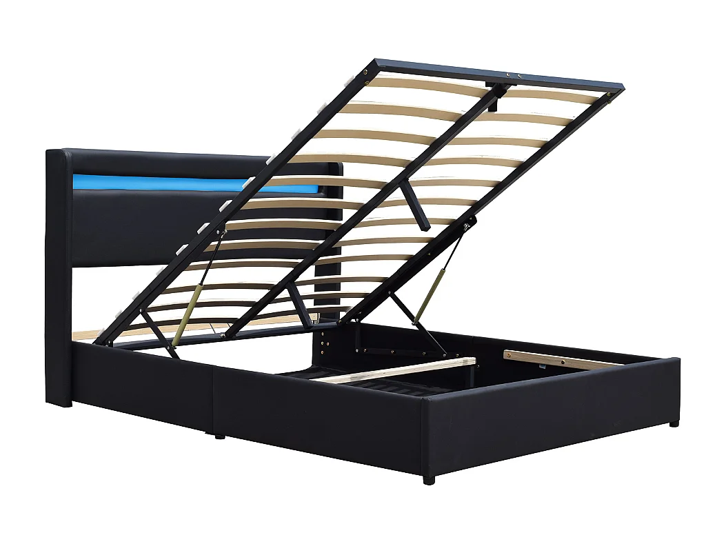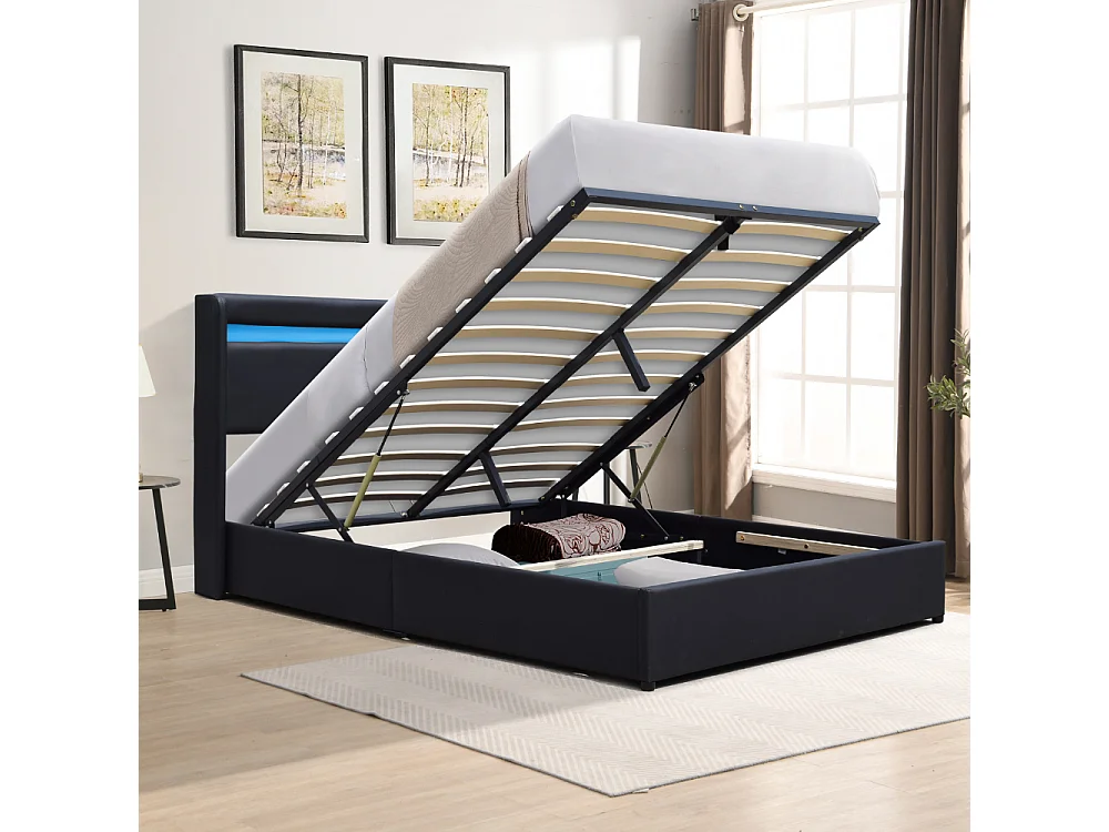 Lit coffre dehoussable 140x200 cm avec tête de lit LED et 14 lattes - Montage rapide - Revêtement PVC simili facile d'entretien