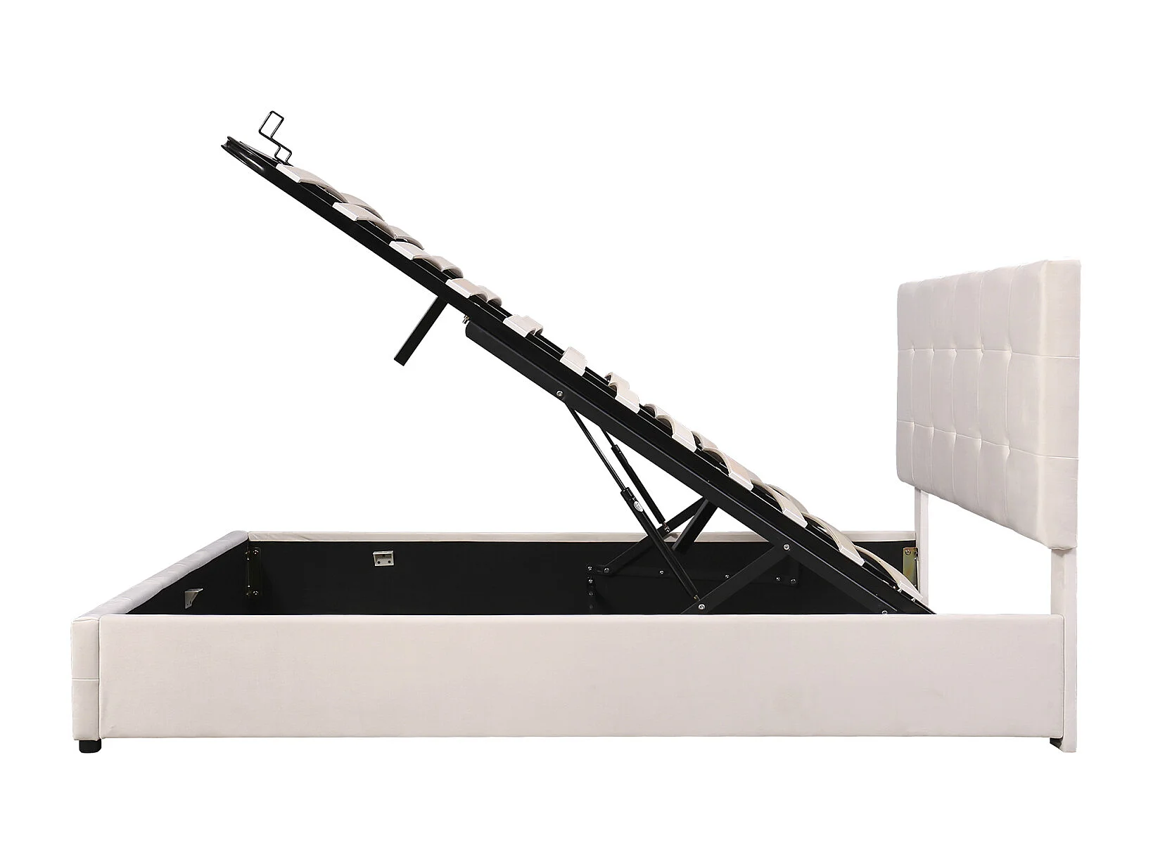 Lit coffre double 140x200 cm - avec tête de lit inclinable, structure métallique, sommier à lattes, lit capitonné velours - Blanc