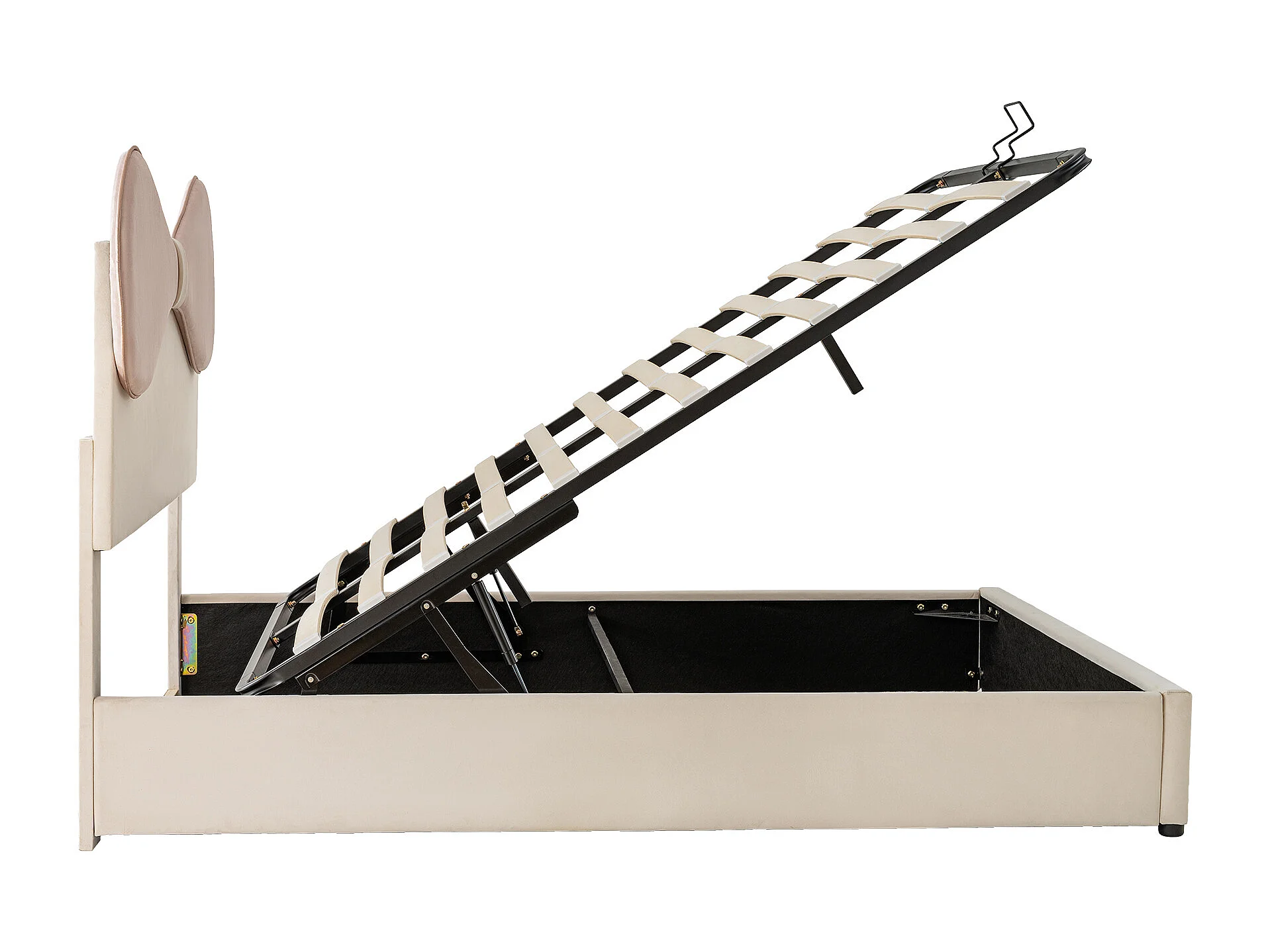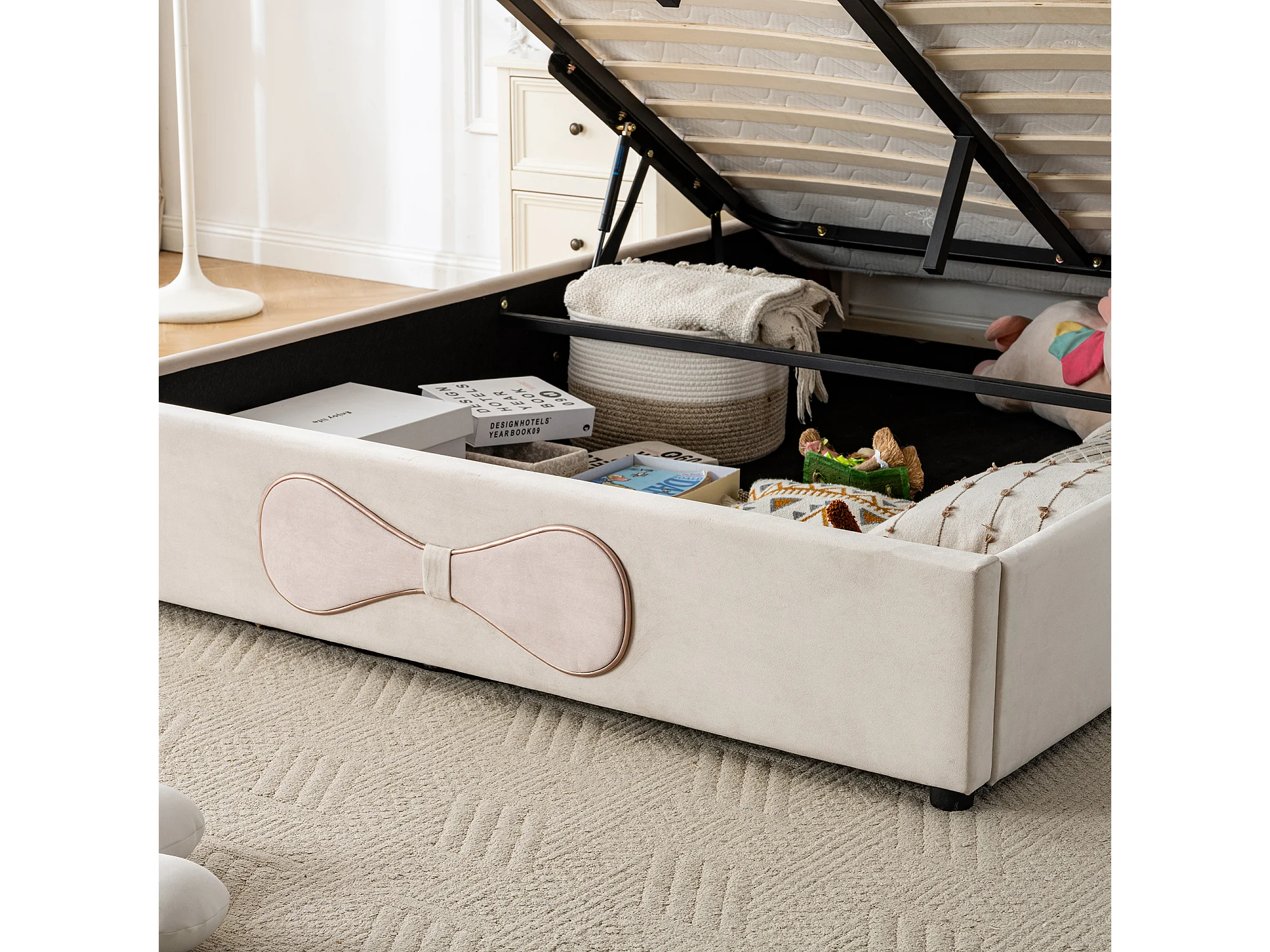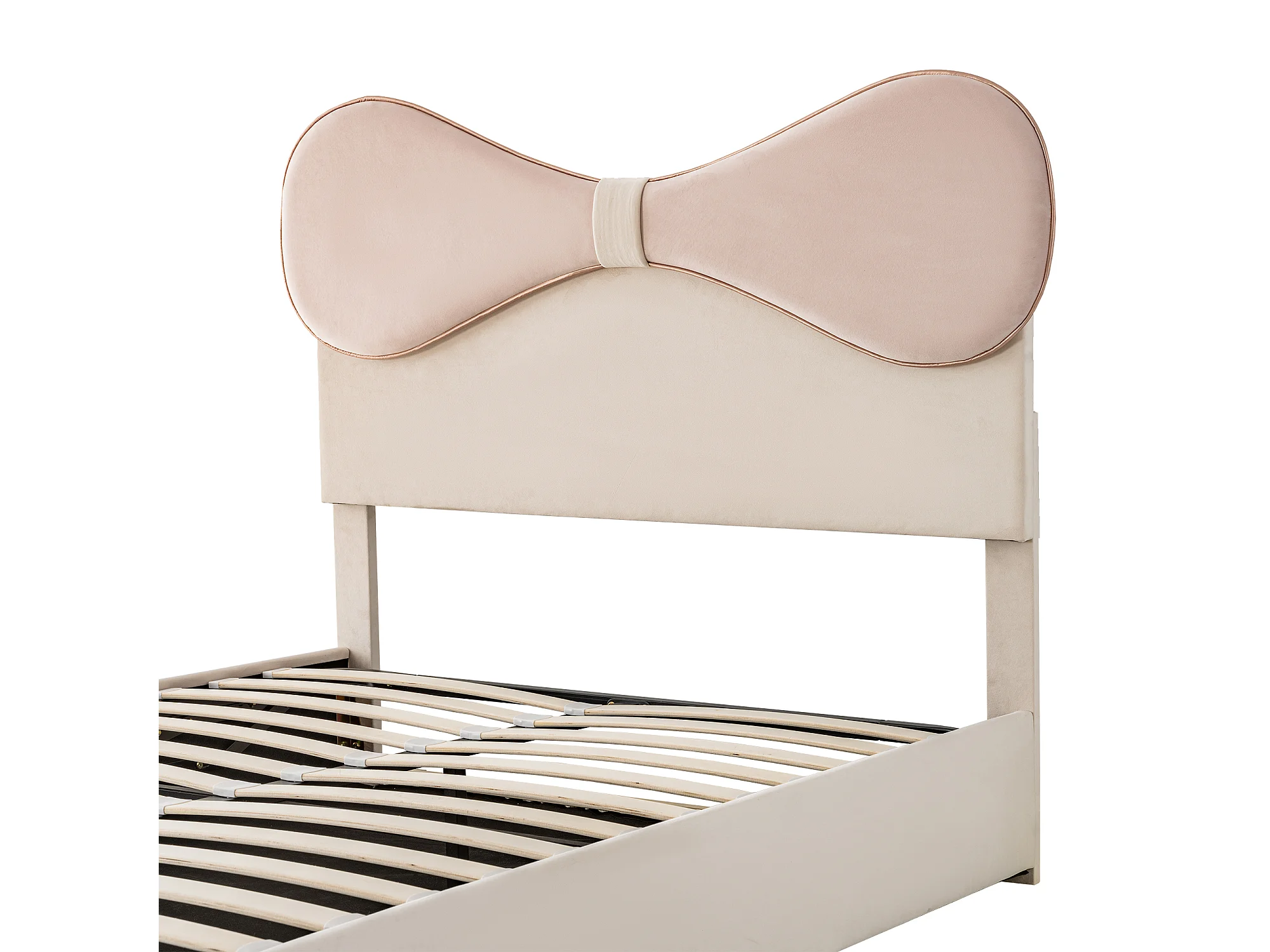 Lit coffre adulte 140x200cm, en velours beige avec nœud papillon rose, tête de lit réglable(sans matelas)
