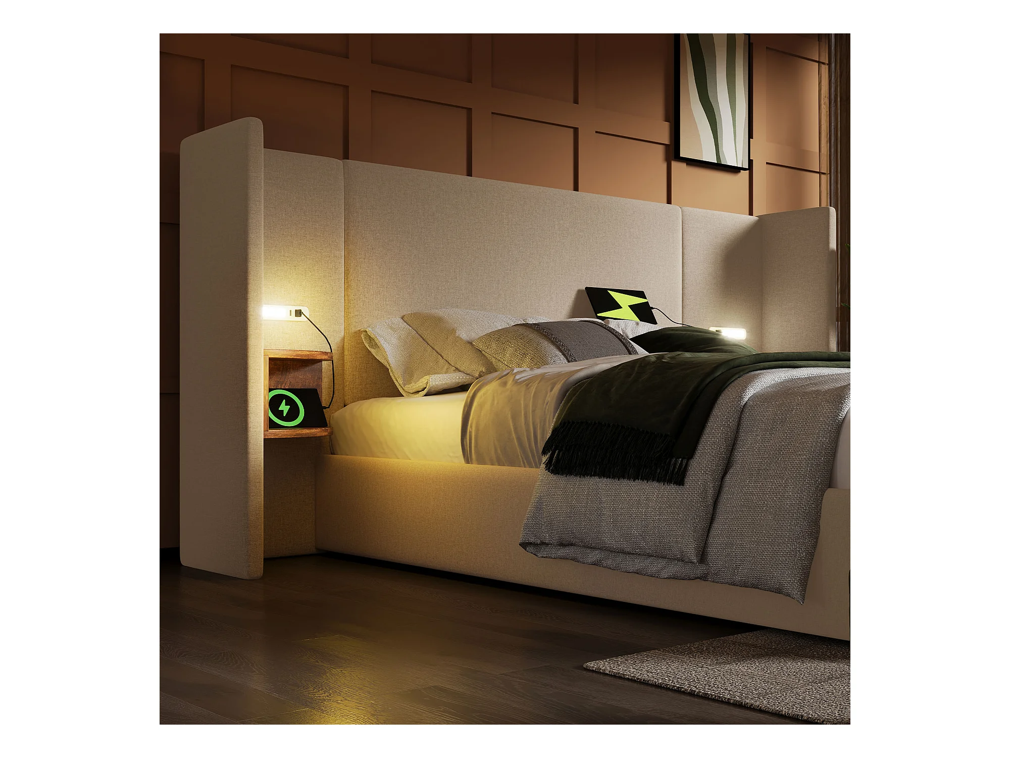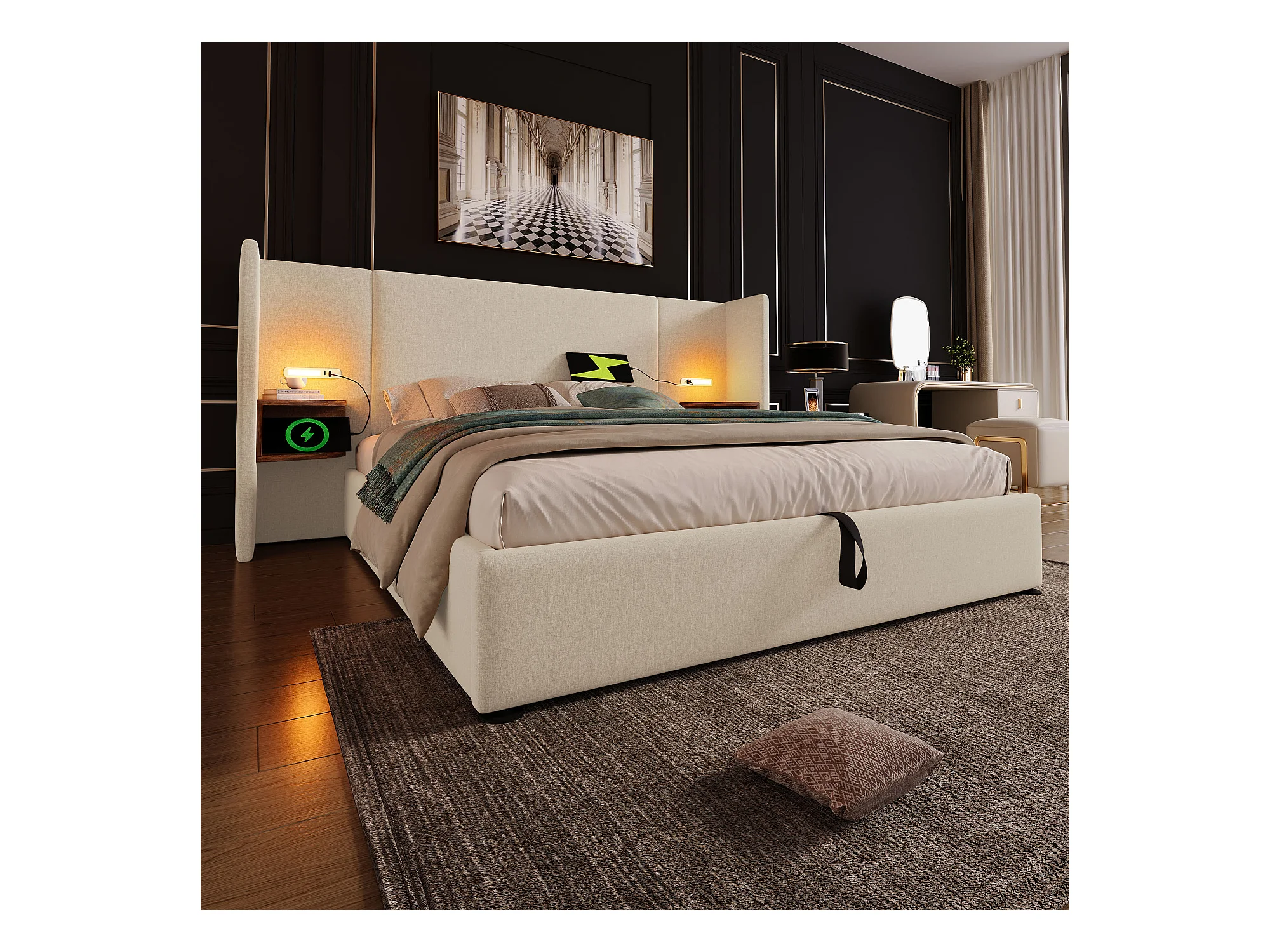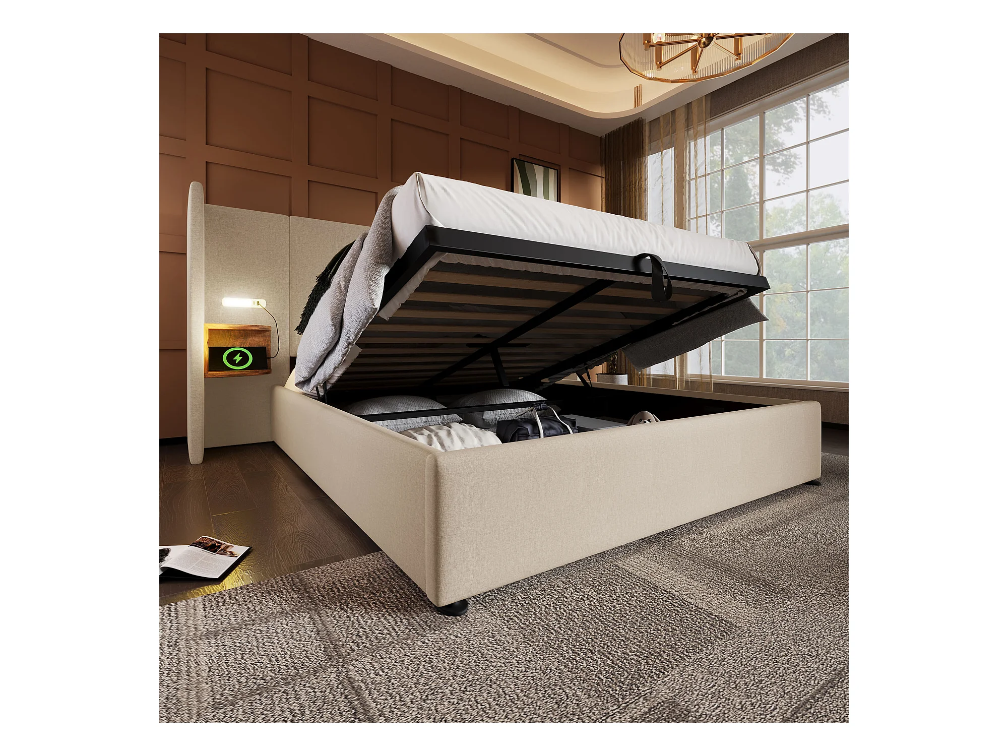Lit coffre adulte 160x200 cm avec 2 compartiments de rangement, lampe de lecture et USB, lin Beige, sans matelas