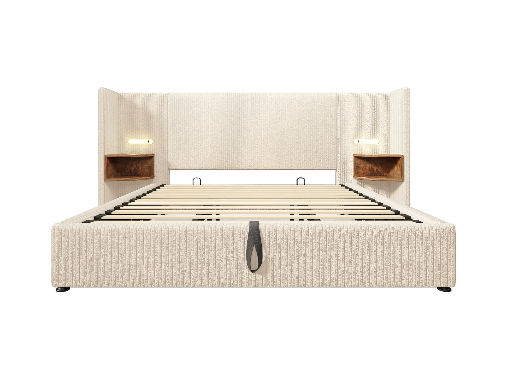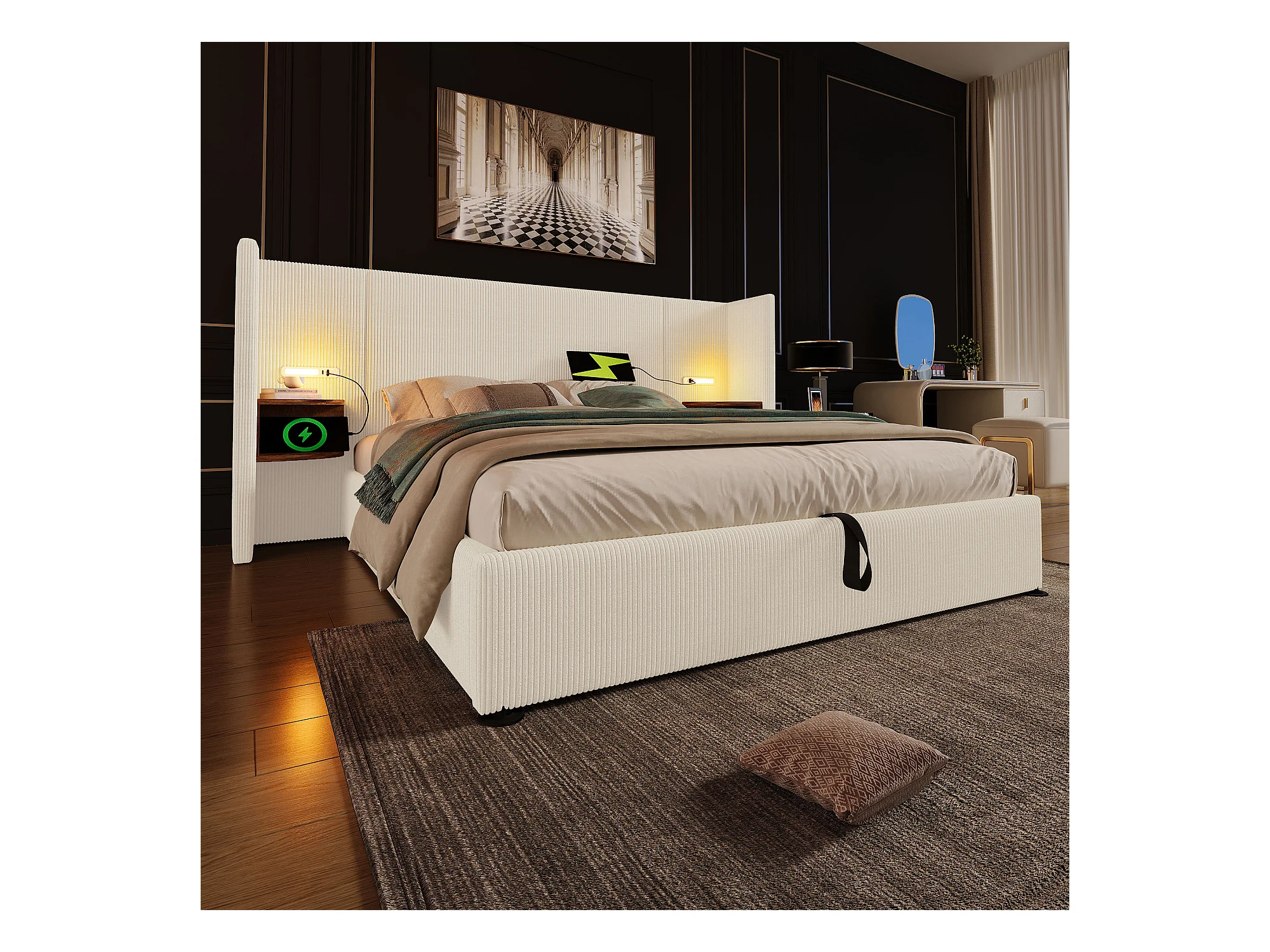 Lit coffre adulte 180x200 cm - Avec 2 compartiments de rangement, LED et USB - en velours beige(sans matelas)