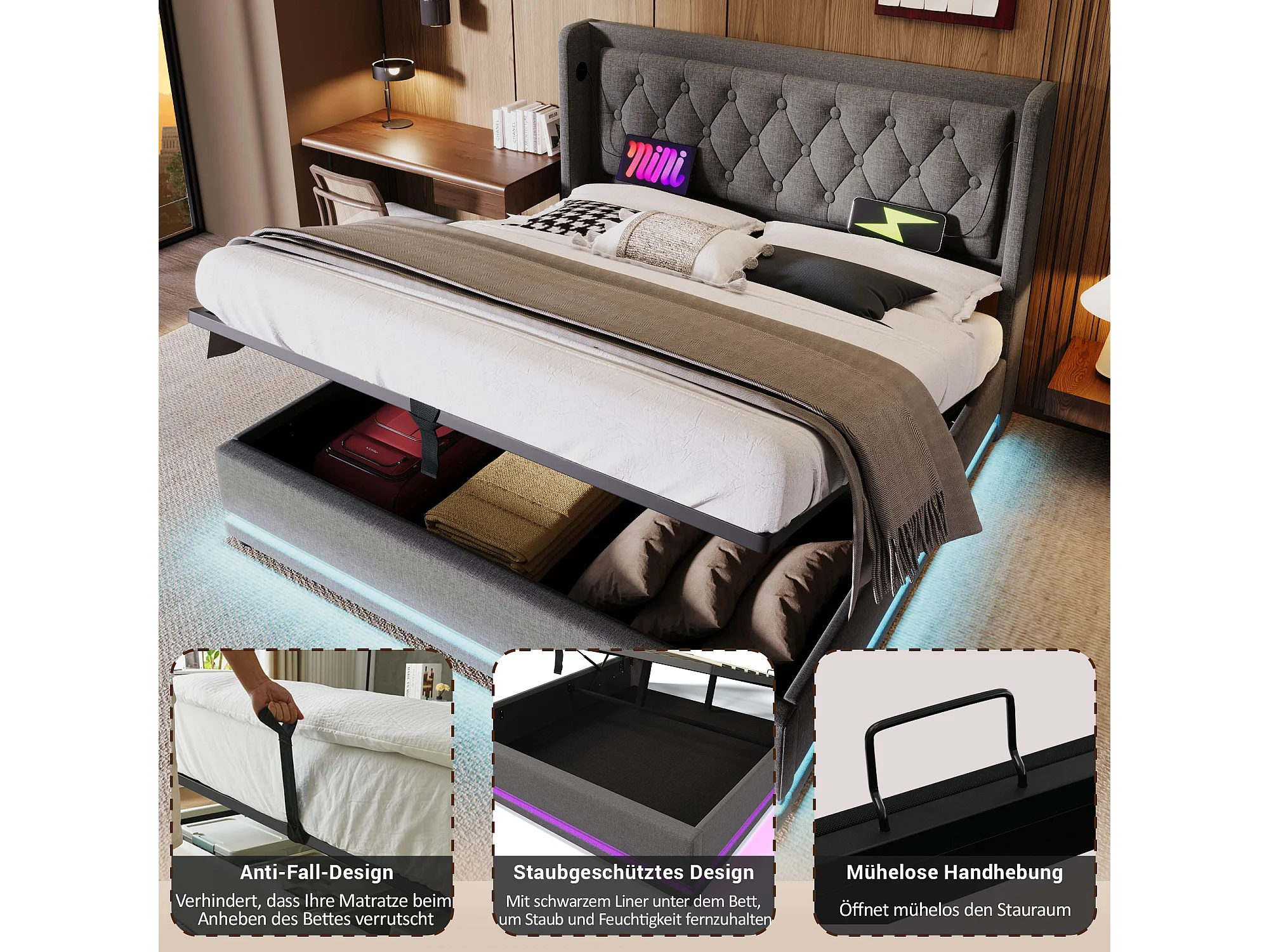 Lit coffre double rembourré - 160 x 200 cm - Matelas + Leds + Tête avec USB - Tissu coton - Gris