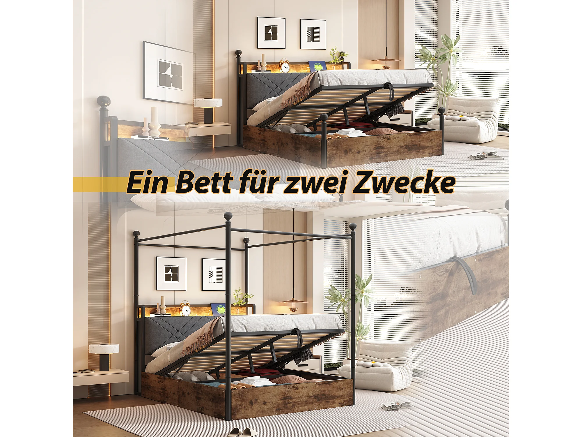 Lit coffre en fer - 140 x 190 cm - avec rangement hydrauliquement + Leds + USB/Type-C - noir
