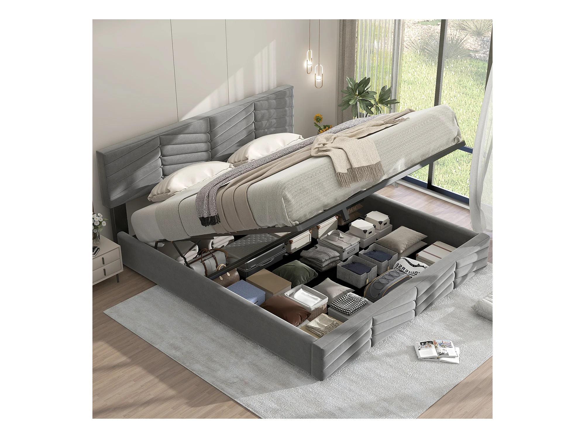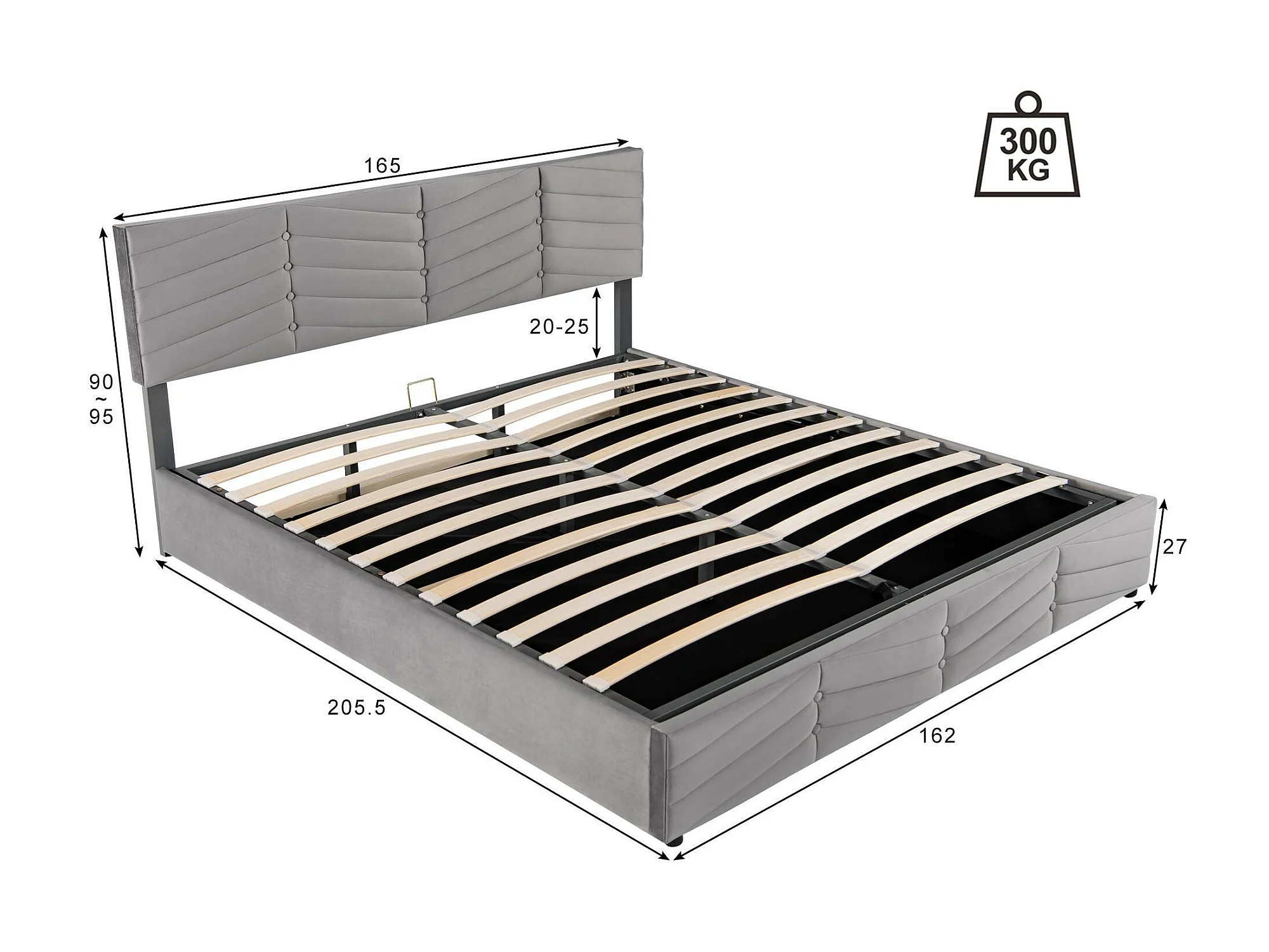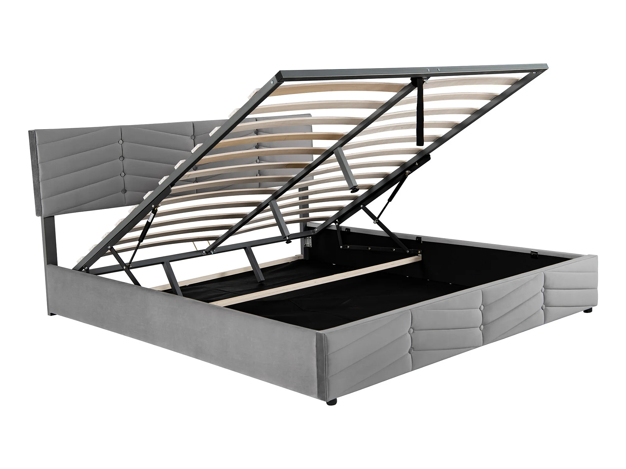 Lit coffre en velours avec sommier à lattes + tête de lit réglable - 160x200cm - Gris