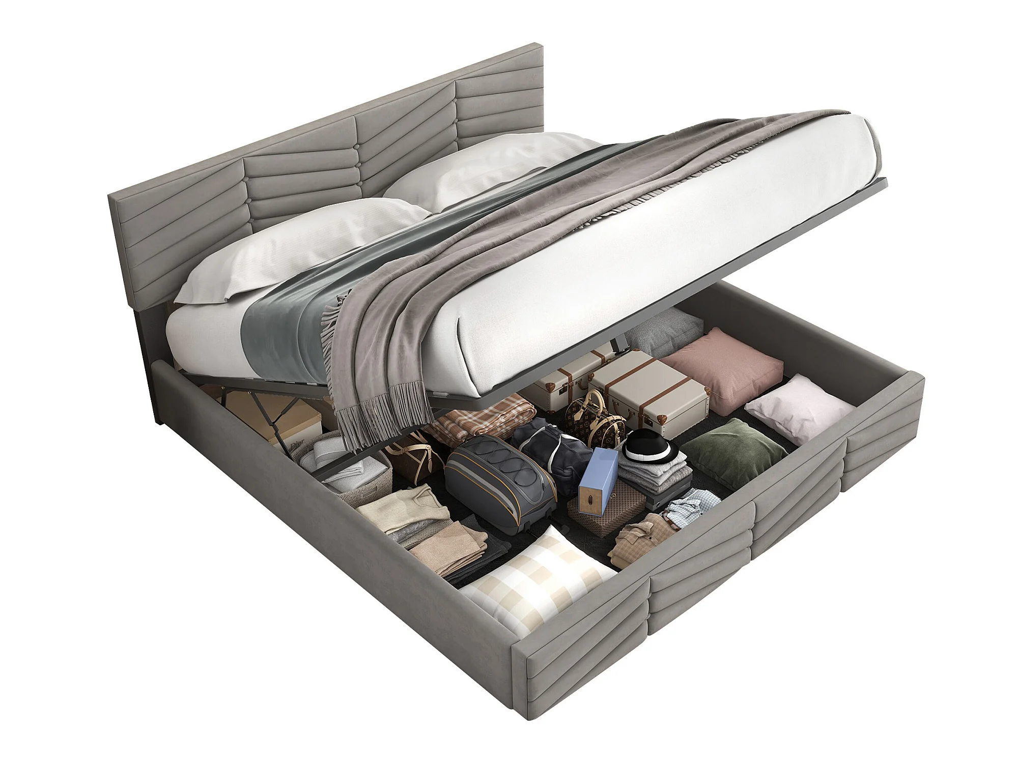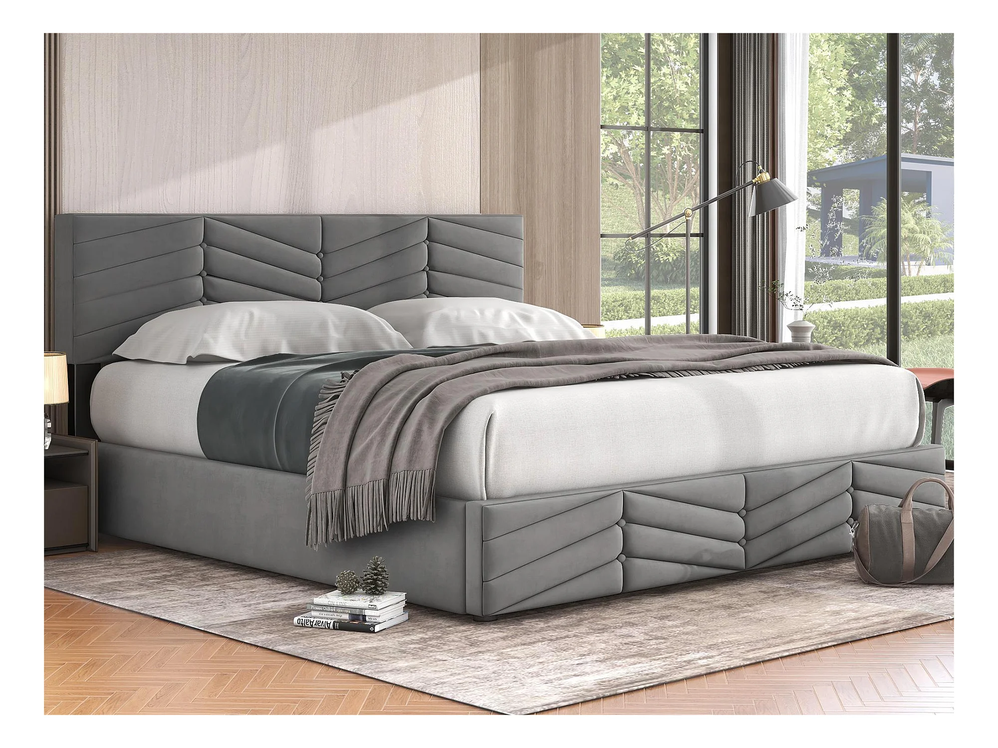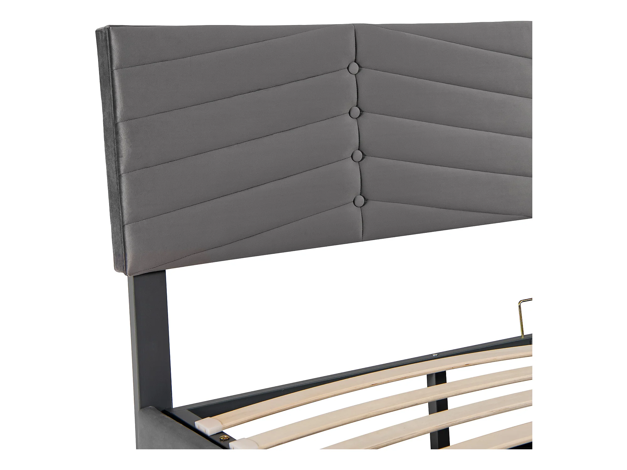 Lit coffre en velours avec sommier à lattes + tête de lit réglable - 160x200cm - Gris