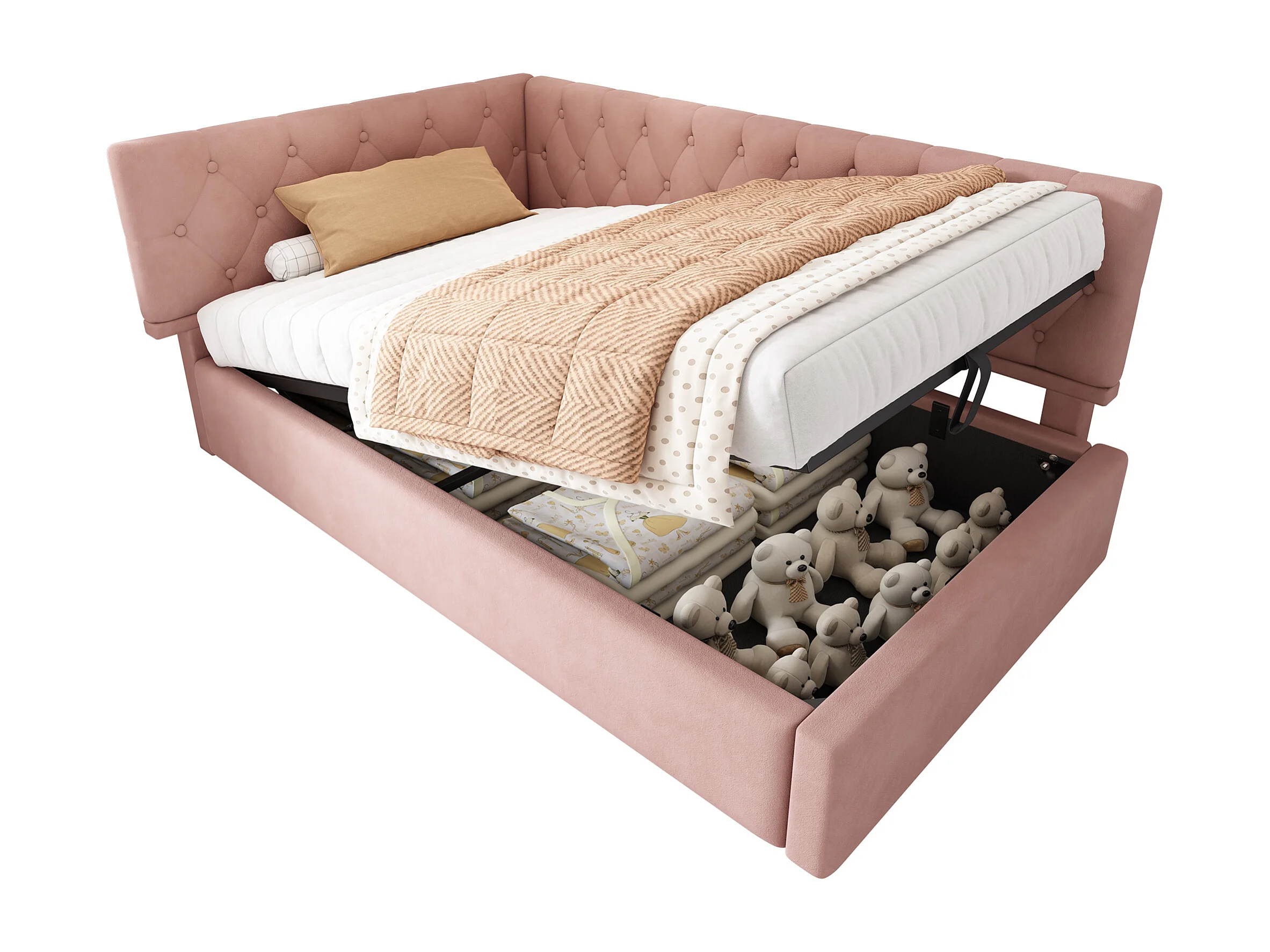 Lit enfant 90x190cm avec sommier - tête de lit capitonnée - cadre de lit en métal - velours rose (sans matelas)