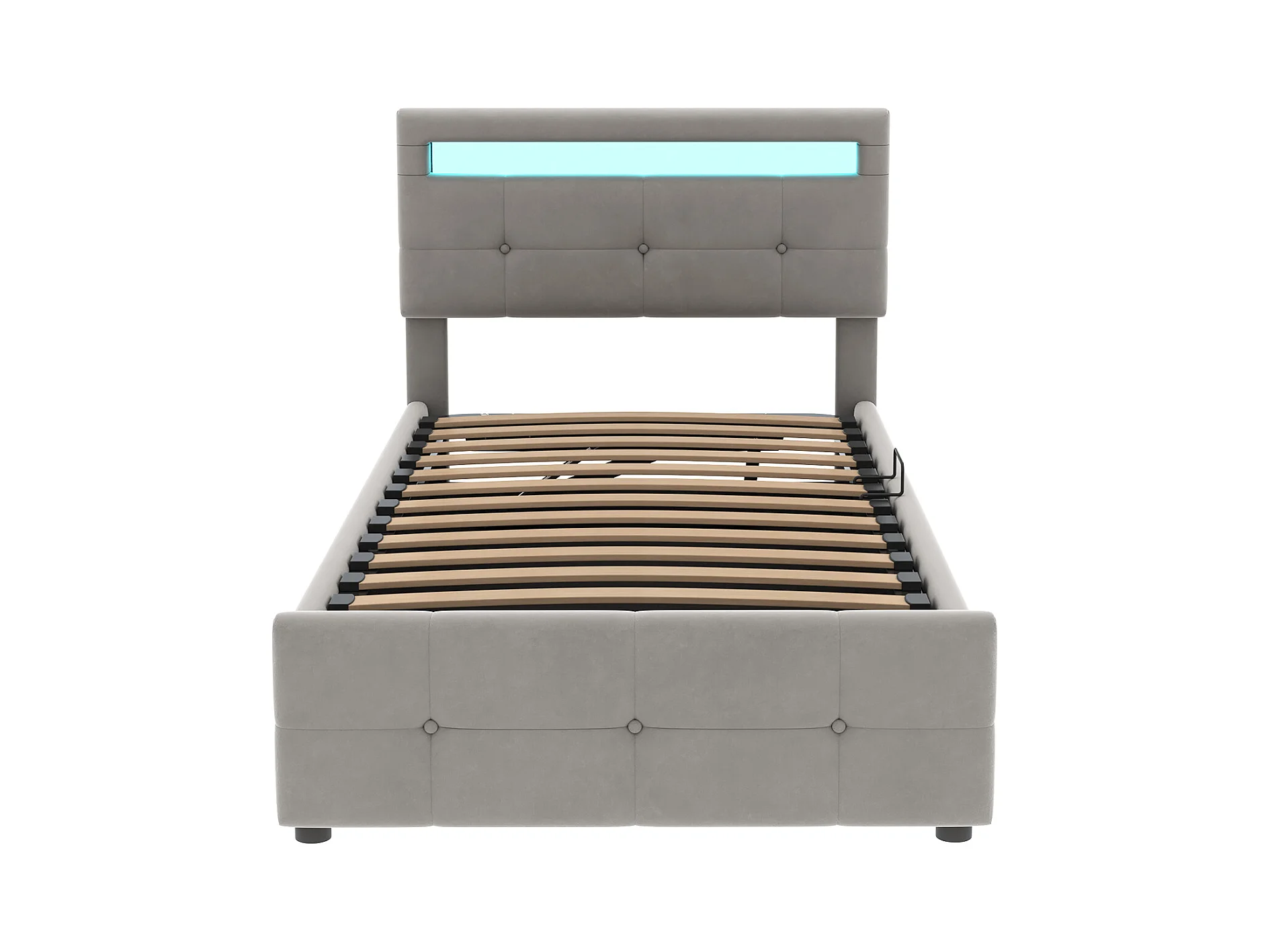 Lit coffre enfant 90x200 cm gris, LED, tête de lit réglable en hauteur, velours, Sommier à lattes, sans matelas