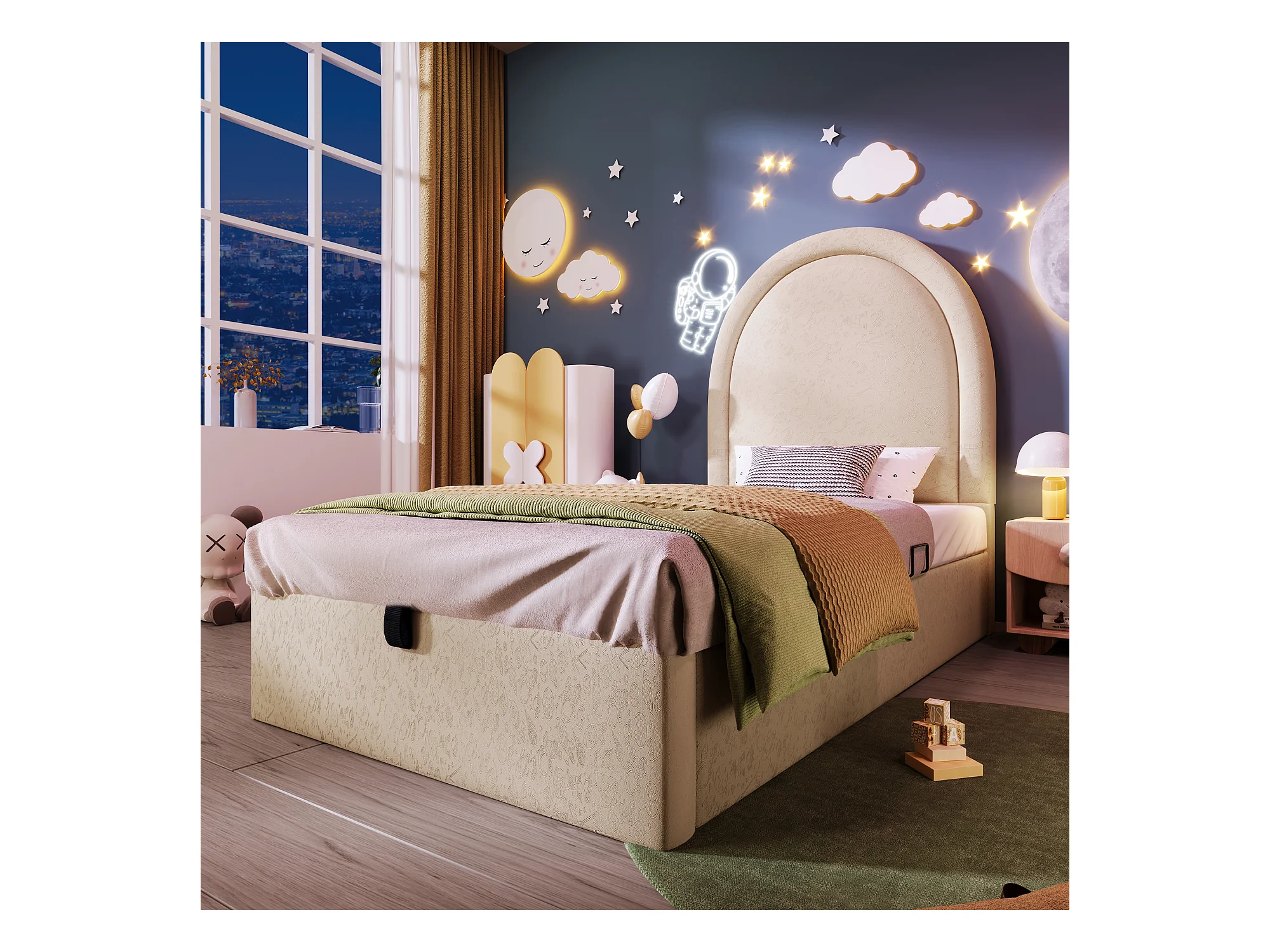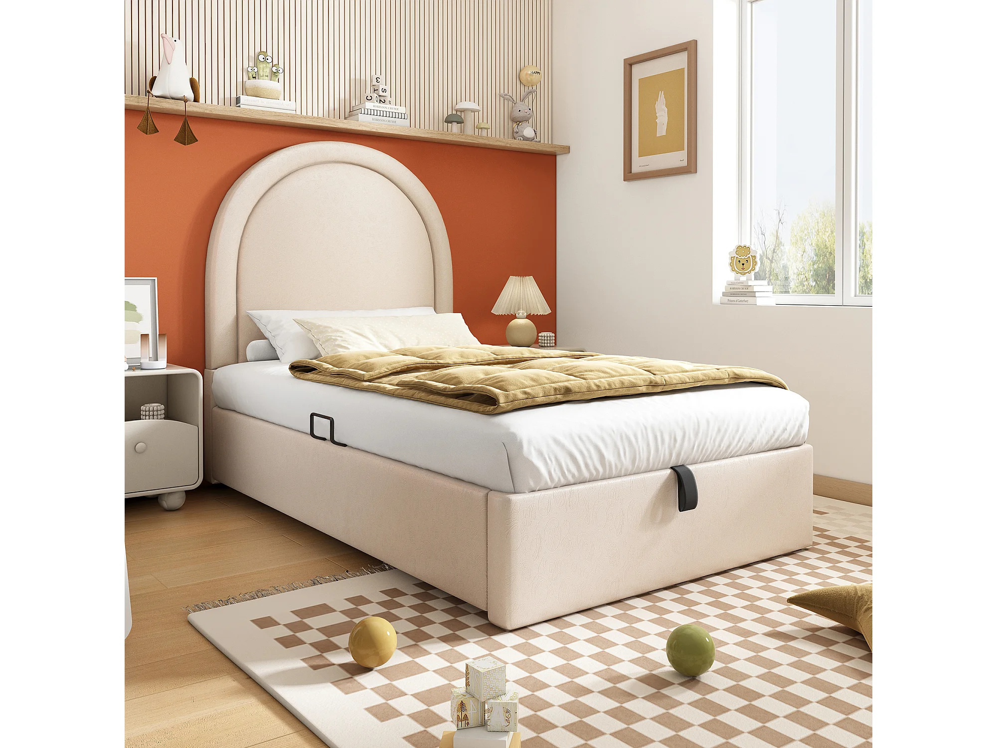 Lit coffre enfant 90x200cm avec Tête de lit en demi-cercle, PU beige, sans matelas