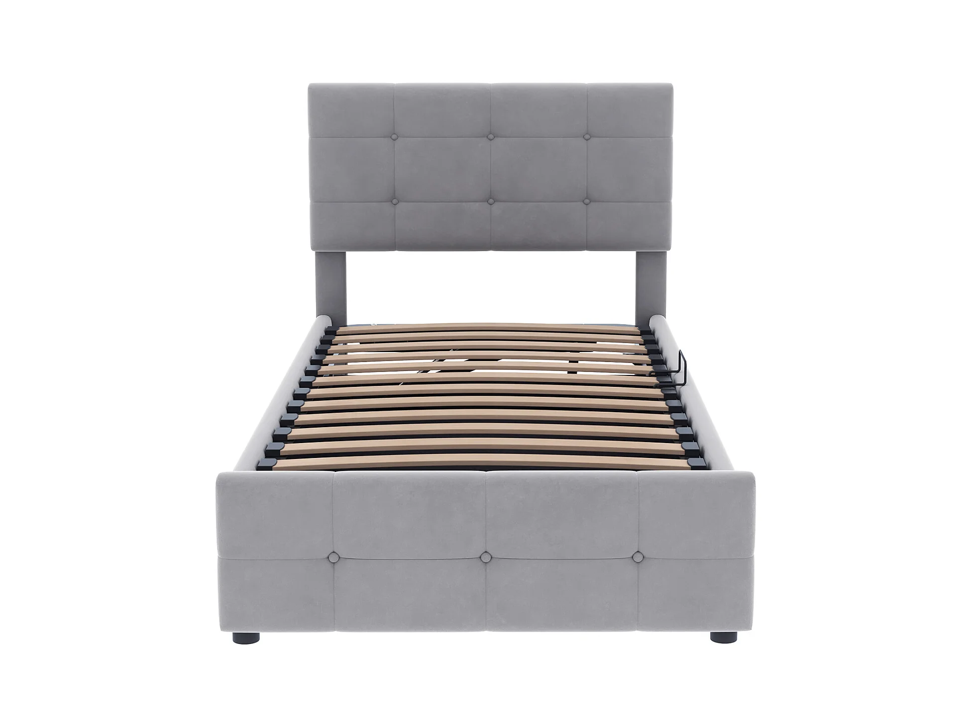 Lit coffre enfant 90x200cm gris en velours, tête de lit réglable en hauteur, sommier à lattes, sans matelas
