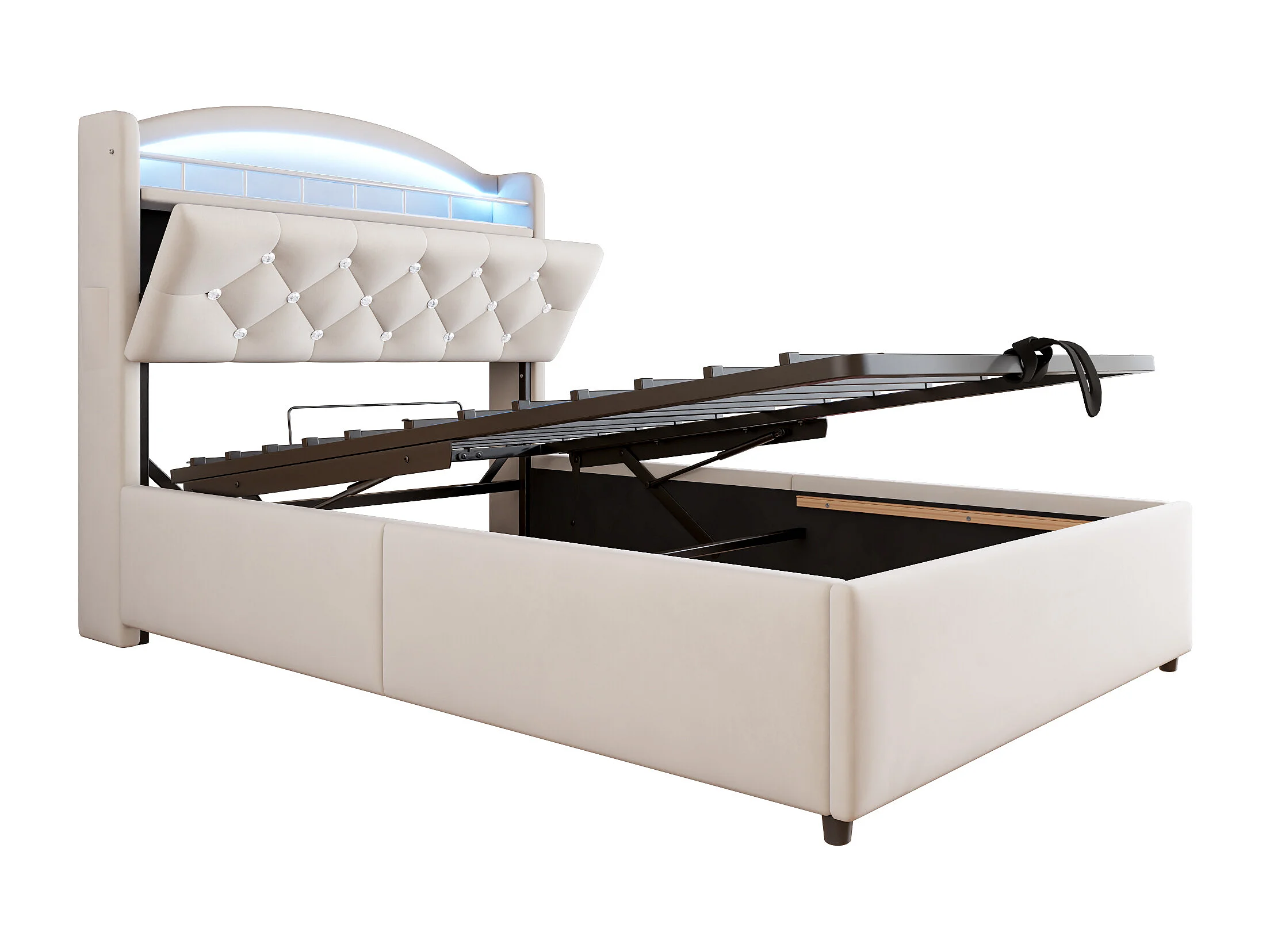 Lit coffre enfant 90x200cm - Velours - - avec LED - avec USB - beige (matelas non inclus)