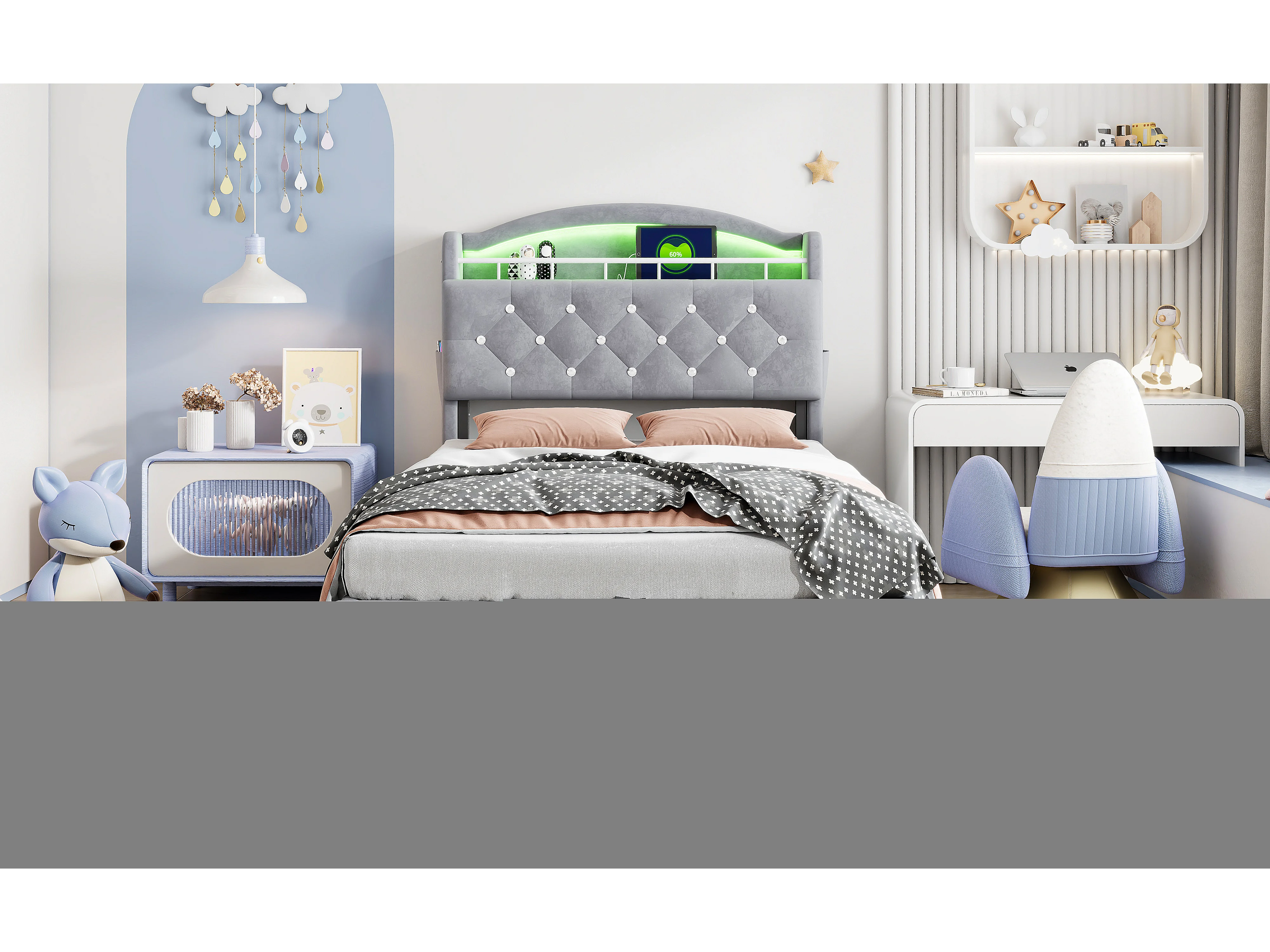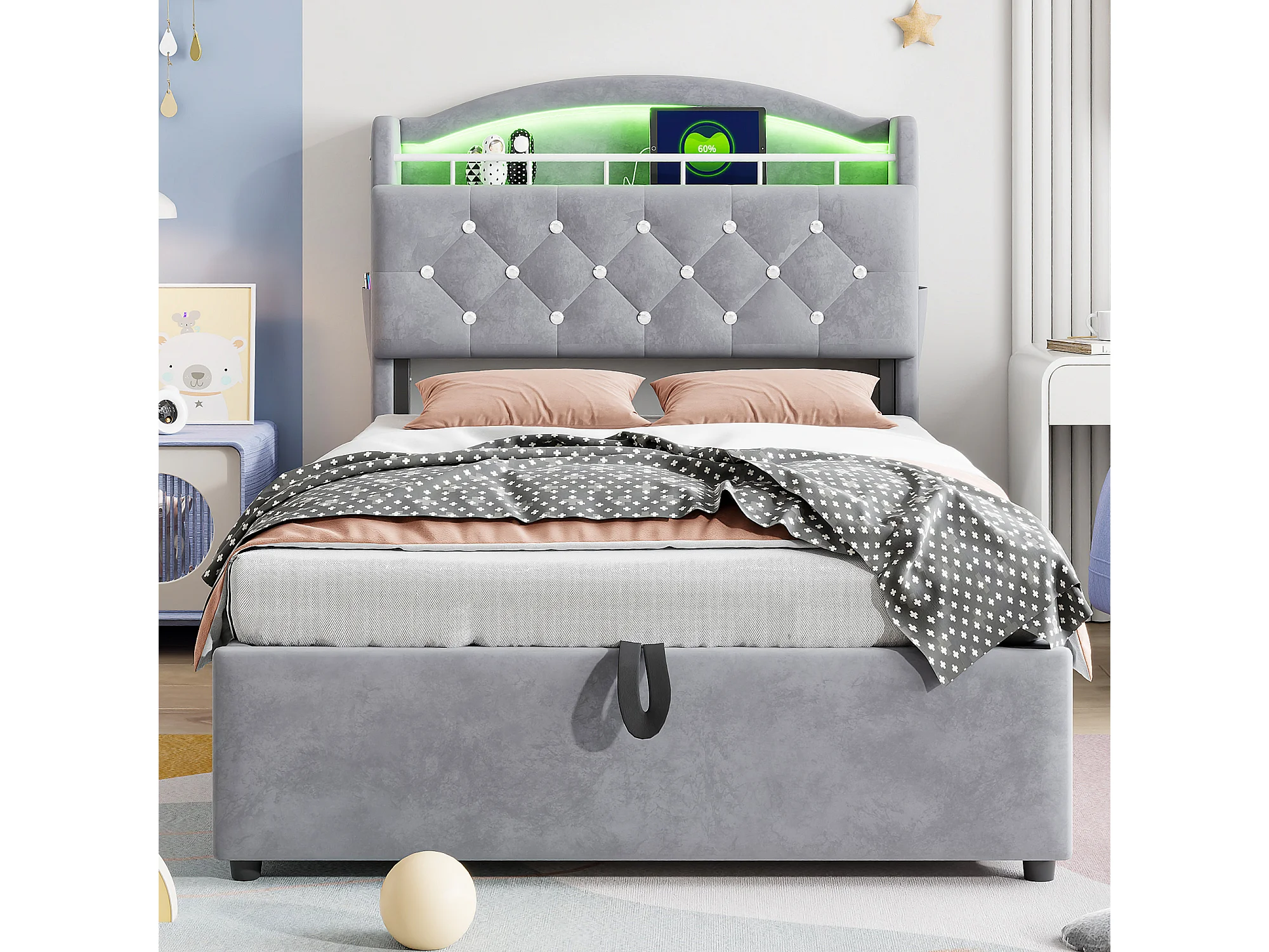 Lit coffre enfant rembourré - 90 x 200 cm - Leds + Tête avec USB - Velours - gris