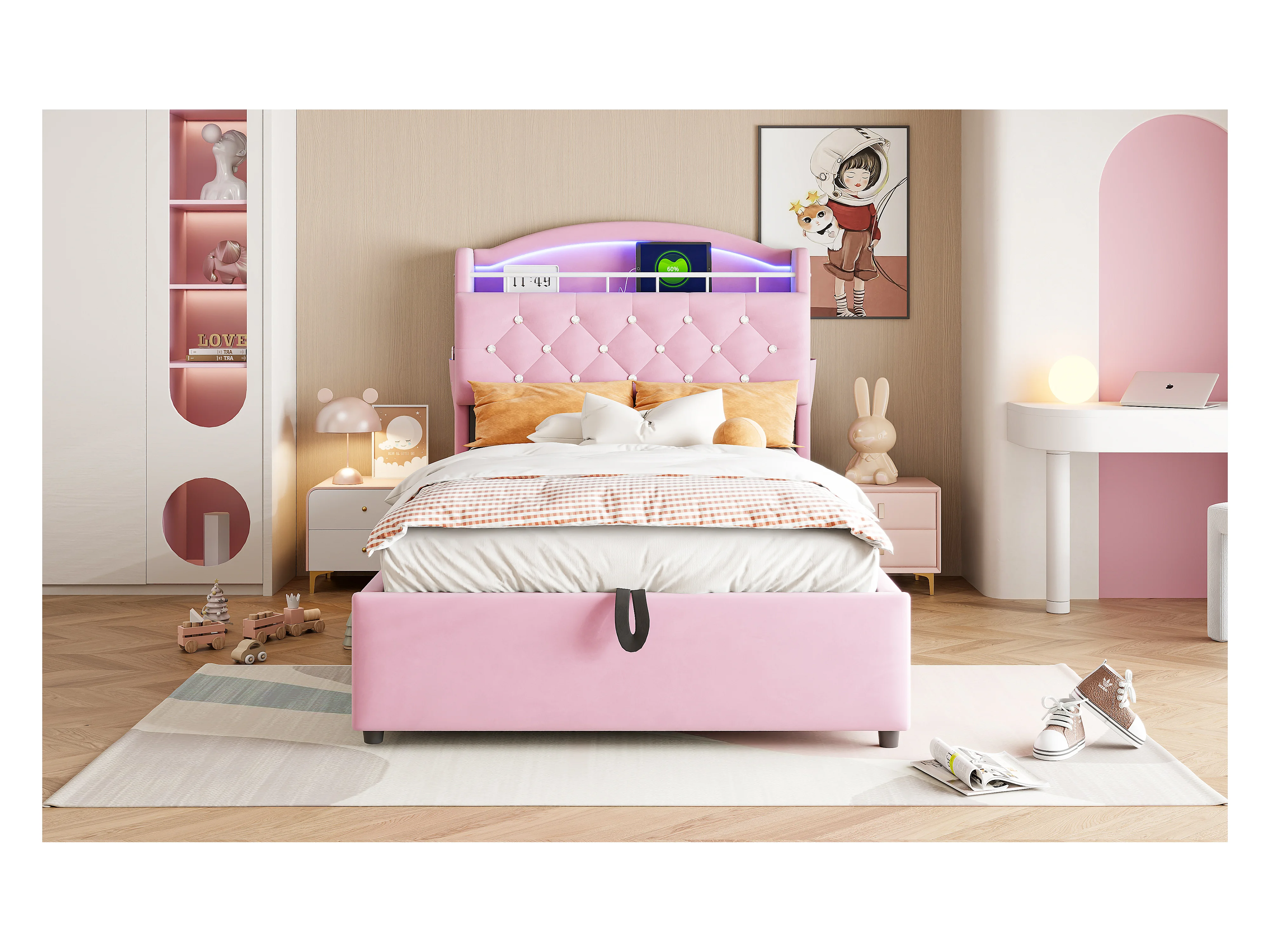 Lit coffre enfant rembourré - 90 x 200 cm - Leds + Tête avec USB - Velours - Rose