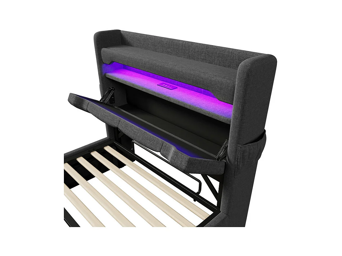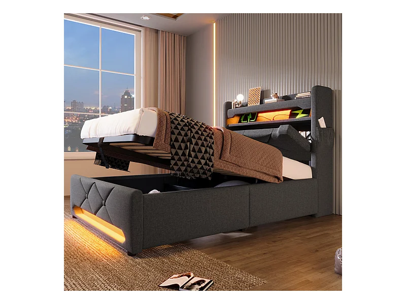 Lit coffre Gris 90x200cm avec tête de lit de rangement - LED et port de USB/Type C - charge max 150kg