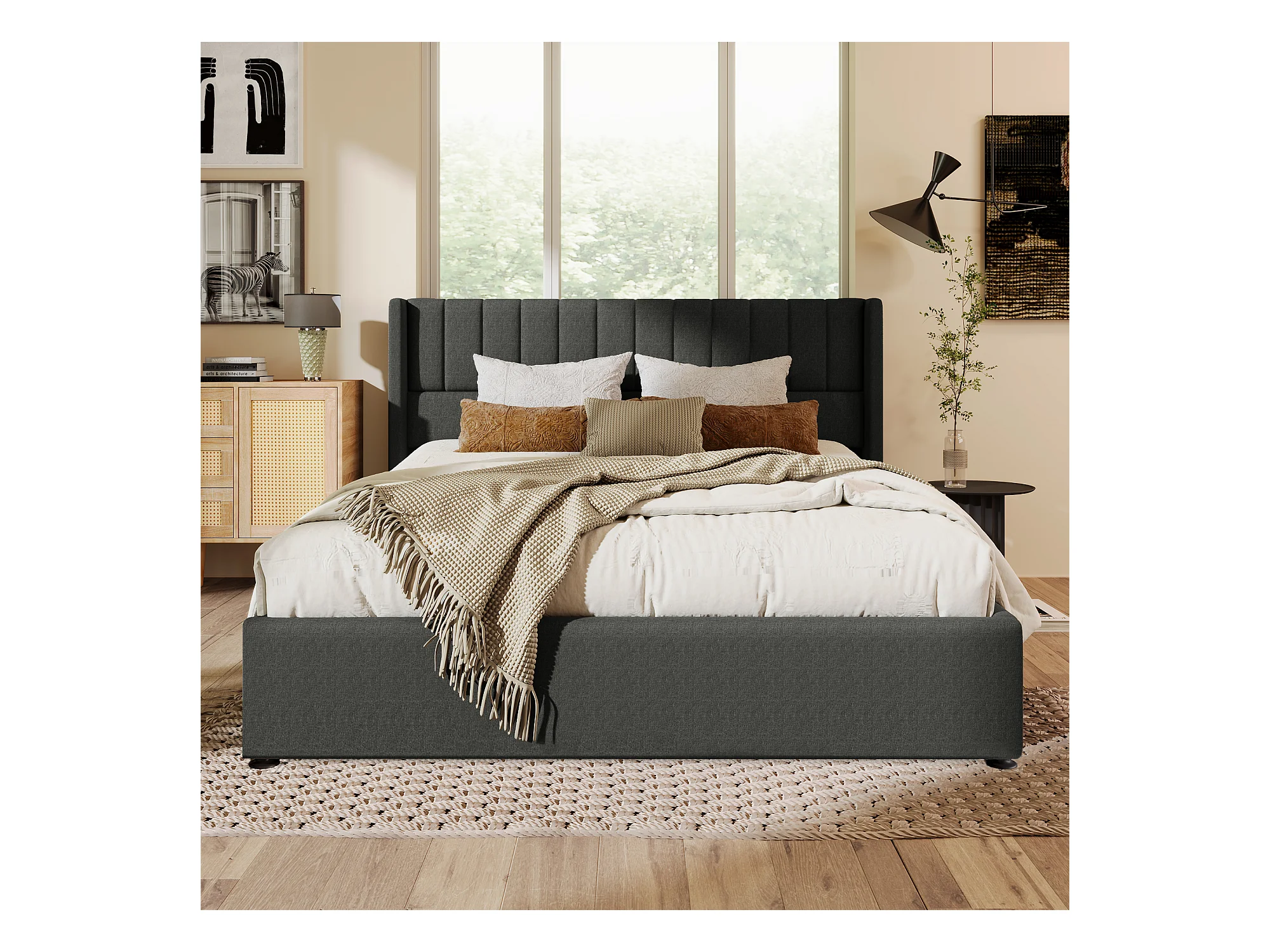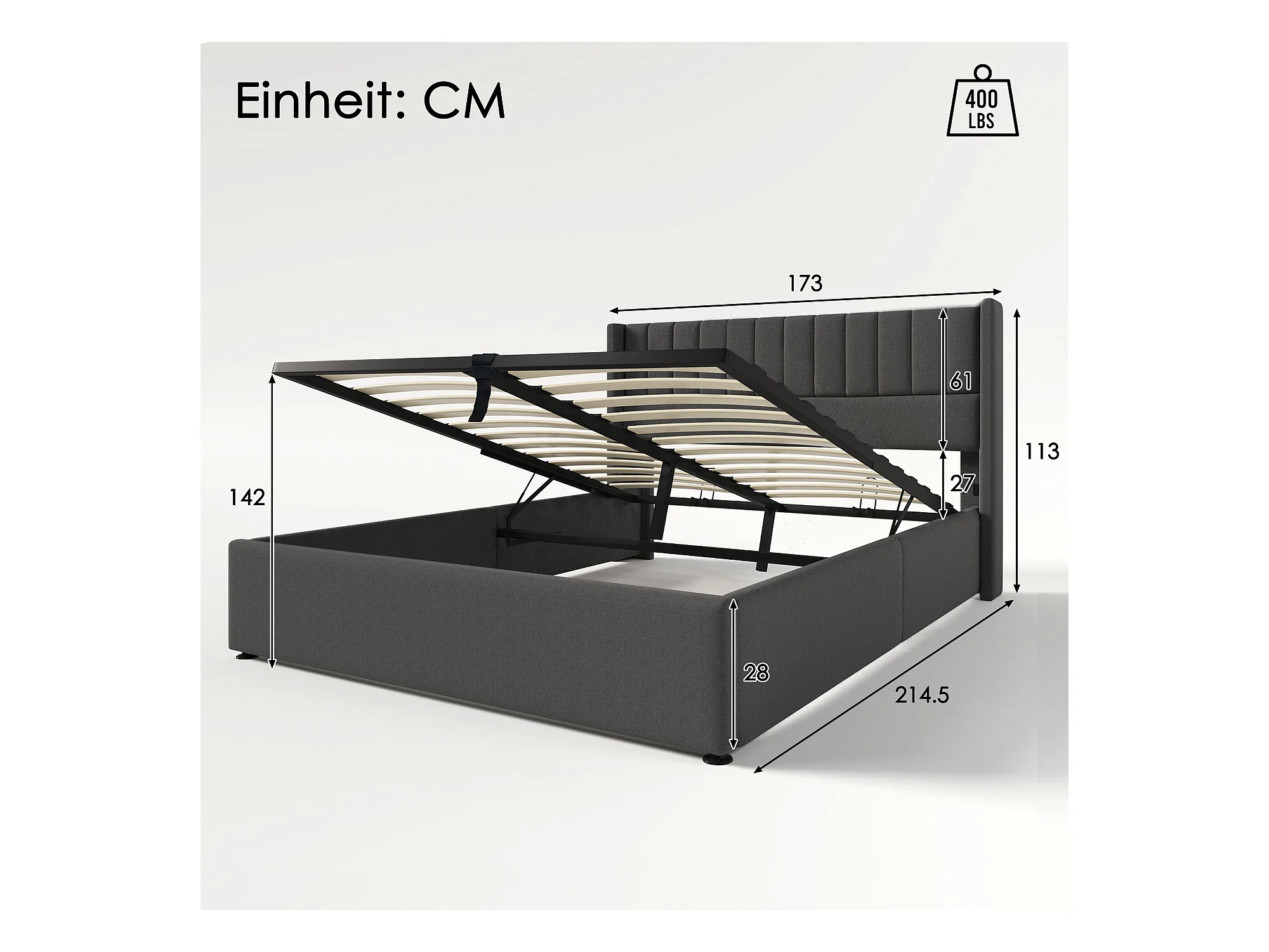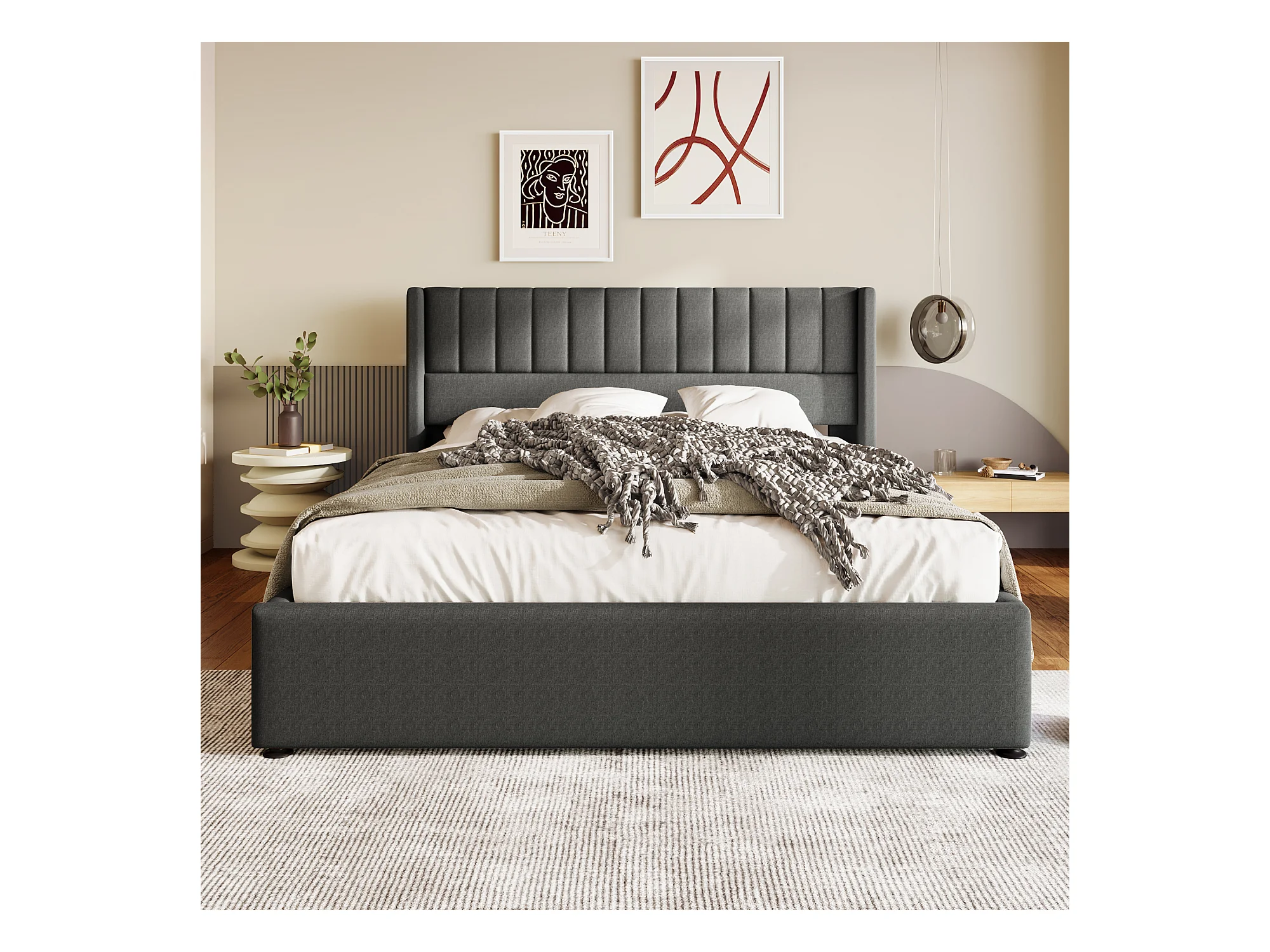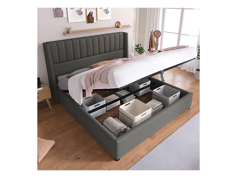 Lit coffre hydraulique 160x200 cm en lin gris avec tête de lit rembourrée et espace de rangement