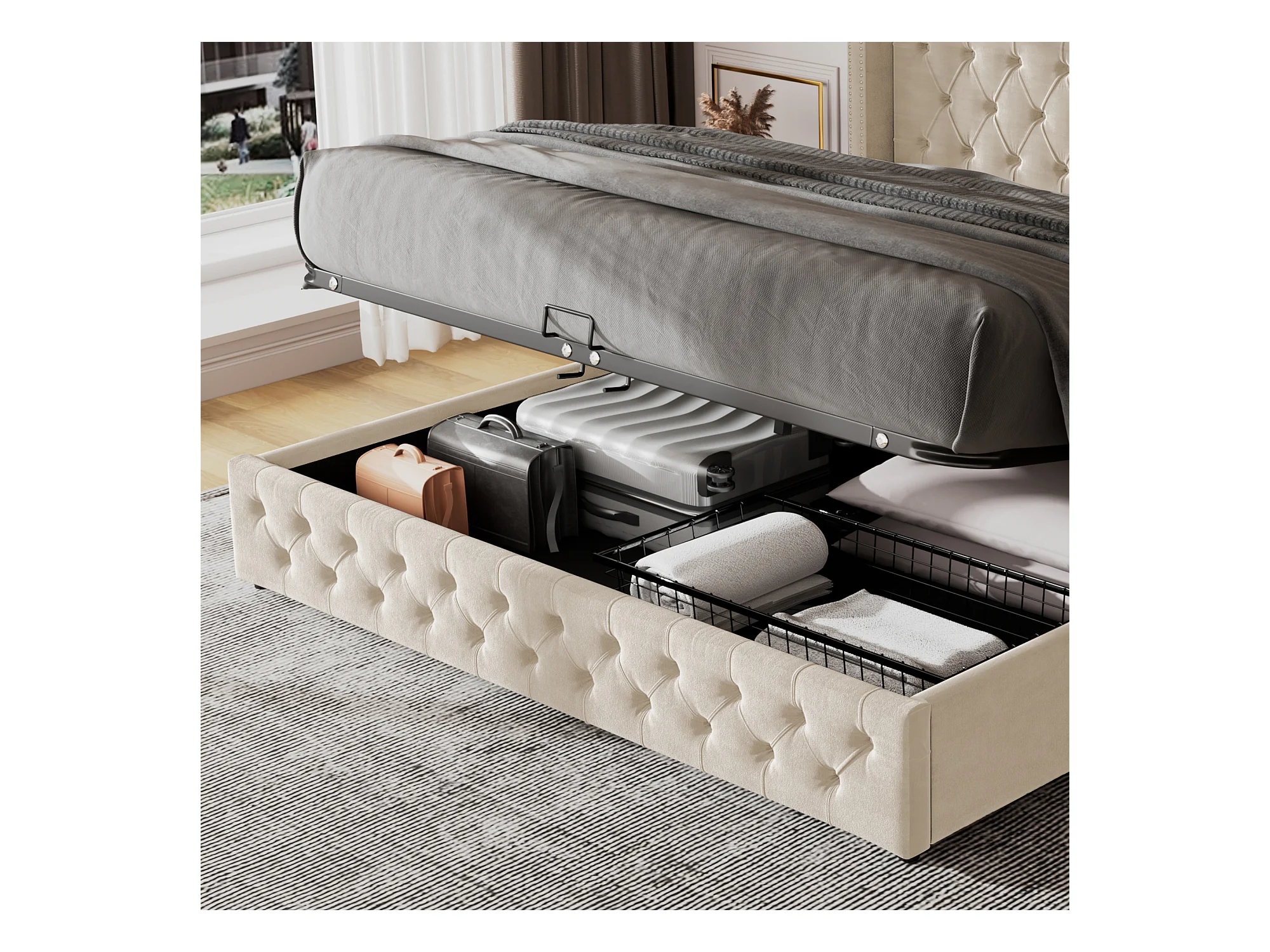 Lit coffre 180x200 cm Lit adulte double avec fond imperméable - velours beige - sans matelas