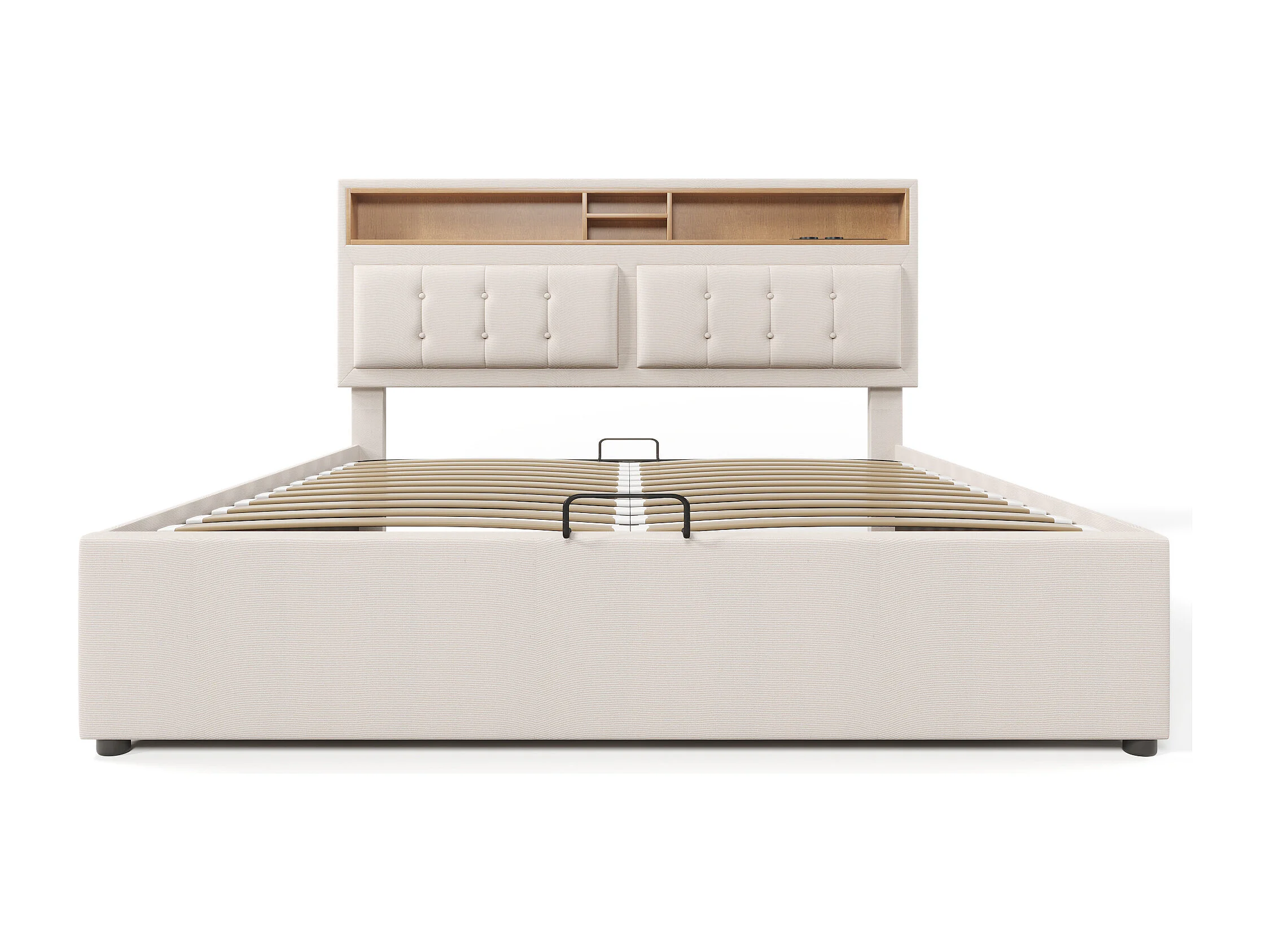 Lit coffre 160x200 cm - lin beige - lit double avec prise de charge - sommier à lattes - sans matelas