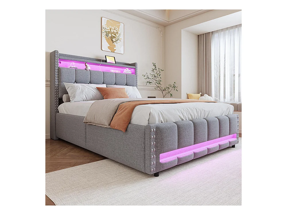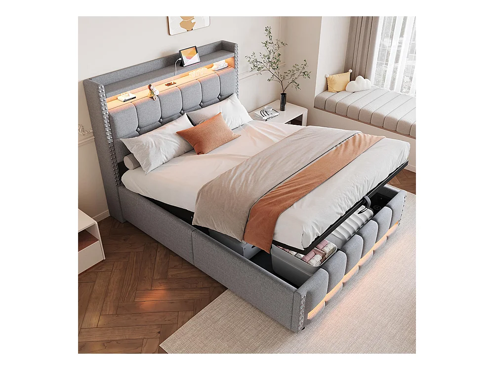 Lit coffre lit rembourré 140x200 avec éclairage LED et prise USB tête de lit avec système hydraulique lit double pour adulte lin gris clair