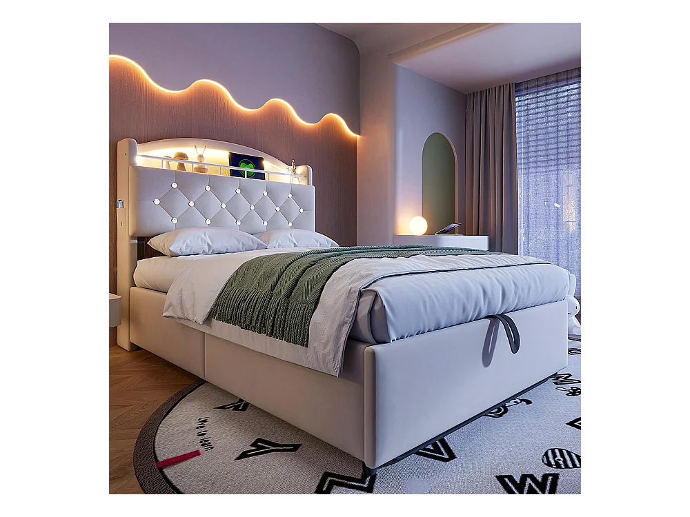 Lit coffre pour enfant 90x200 cm lit simple en velours lit multifonction avec espace de rangement LED et USB Beige
