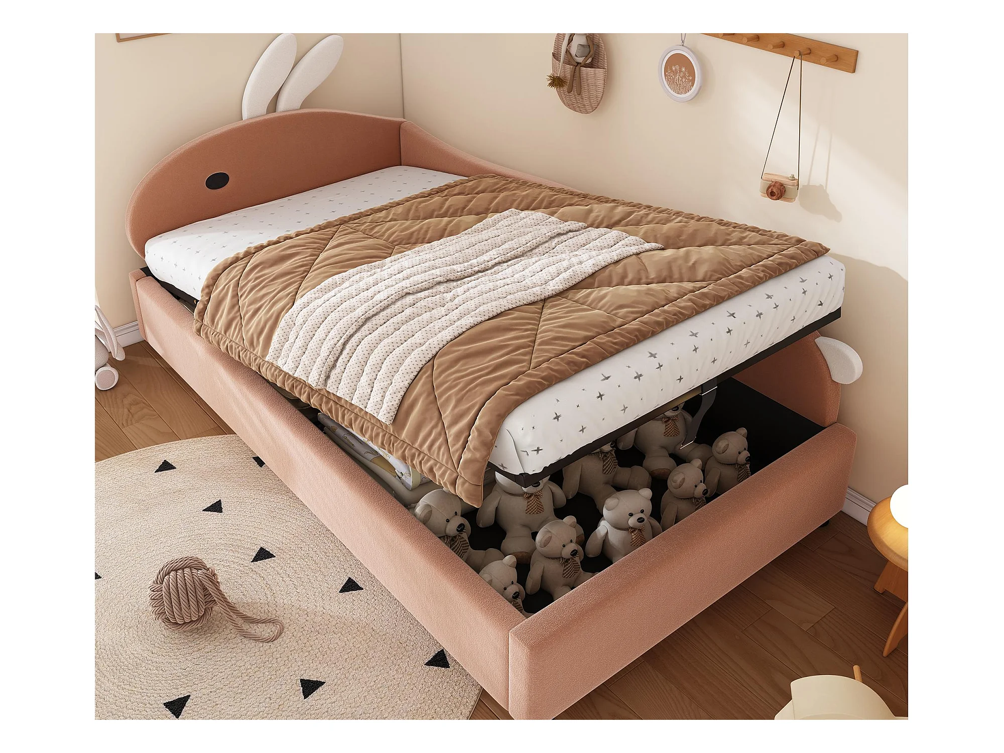 Lit coffre pour enfants 90x200cm - tête de lit en forme de lapin - clôture de droite - avec sommier à lattes - velours + contreplaqué - Rose
