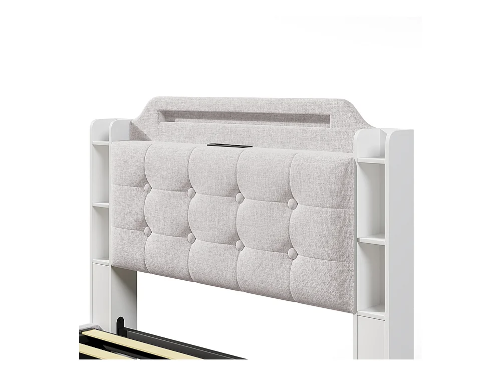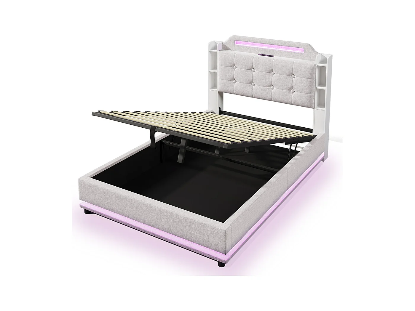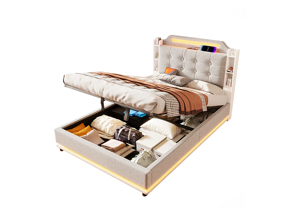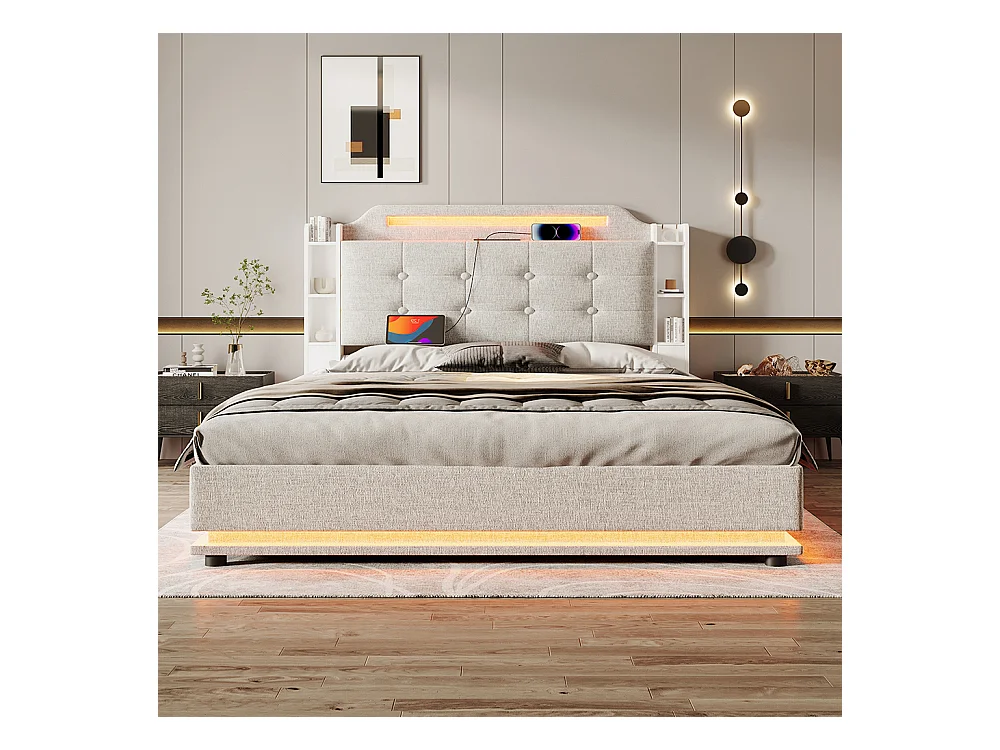 Lit coffre rembourré 140x200 cm bande LED rangement hydraulique plusieurs compartiments USB+TYPE-C lin sans matelas beige