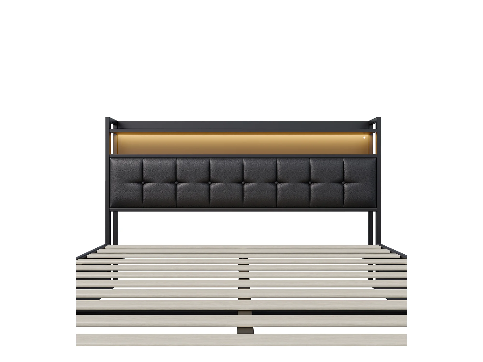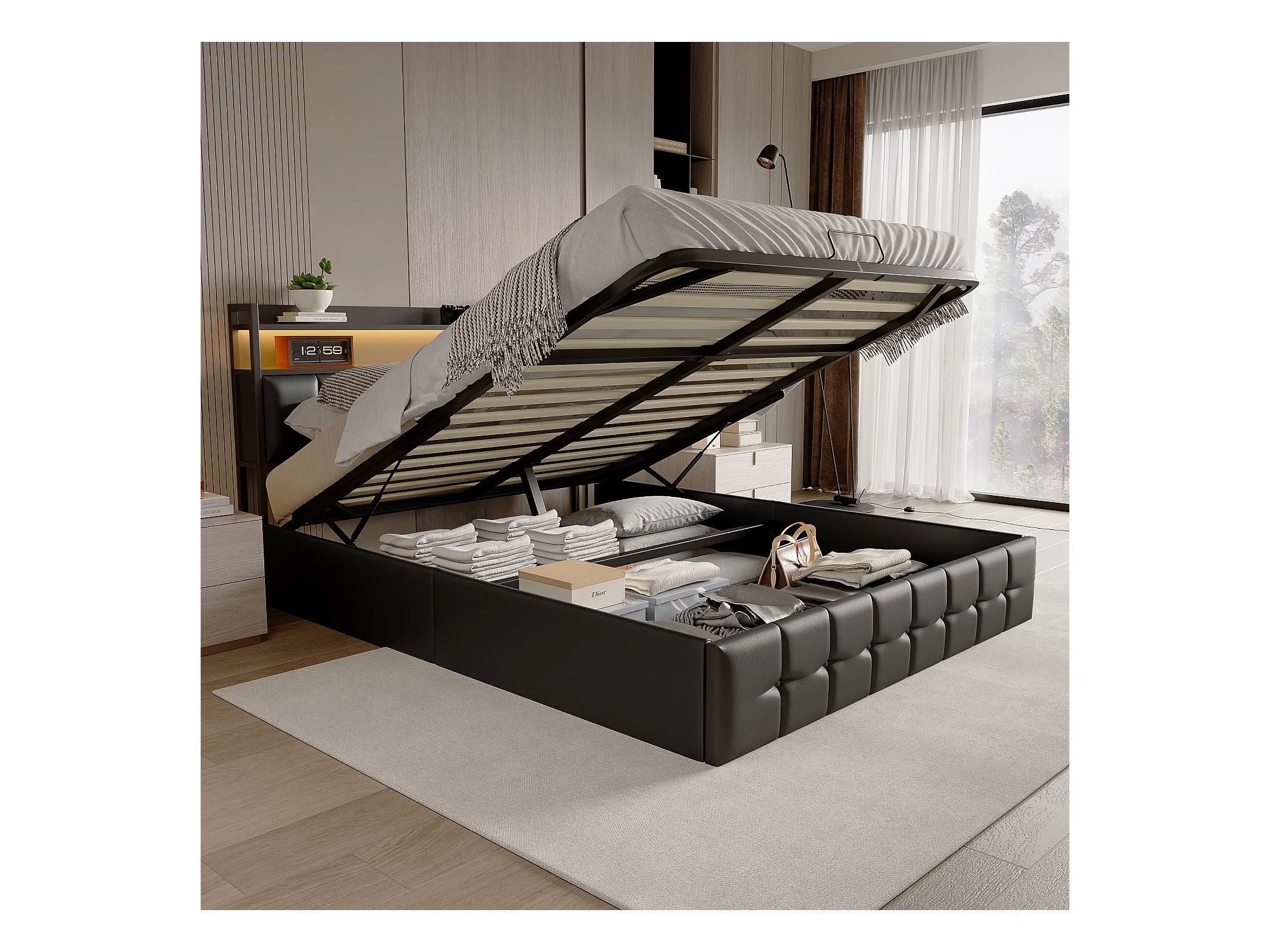 Lit coffre rembourré 140x200cm en tissu de Cuir - avec LED et port de charge - Noir