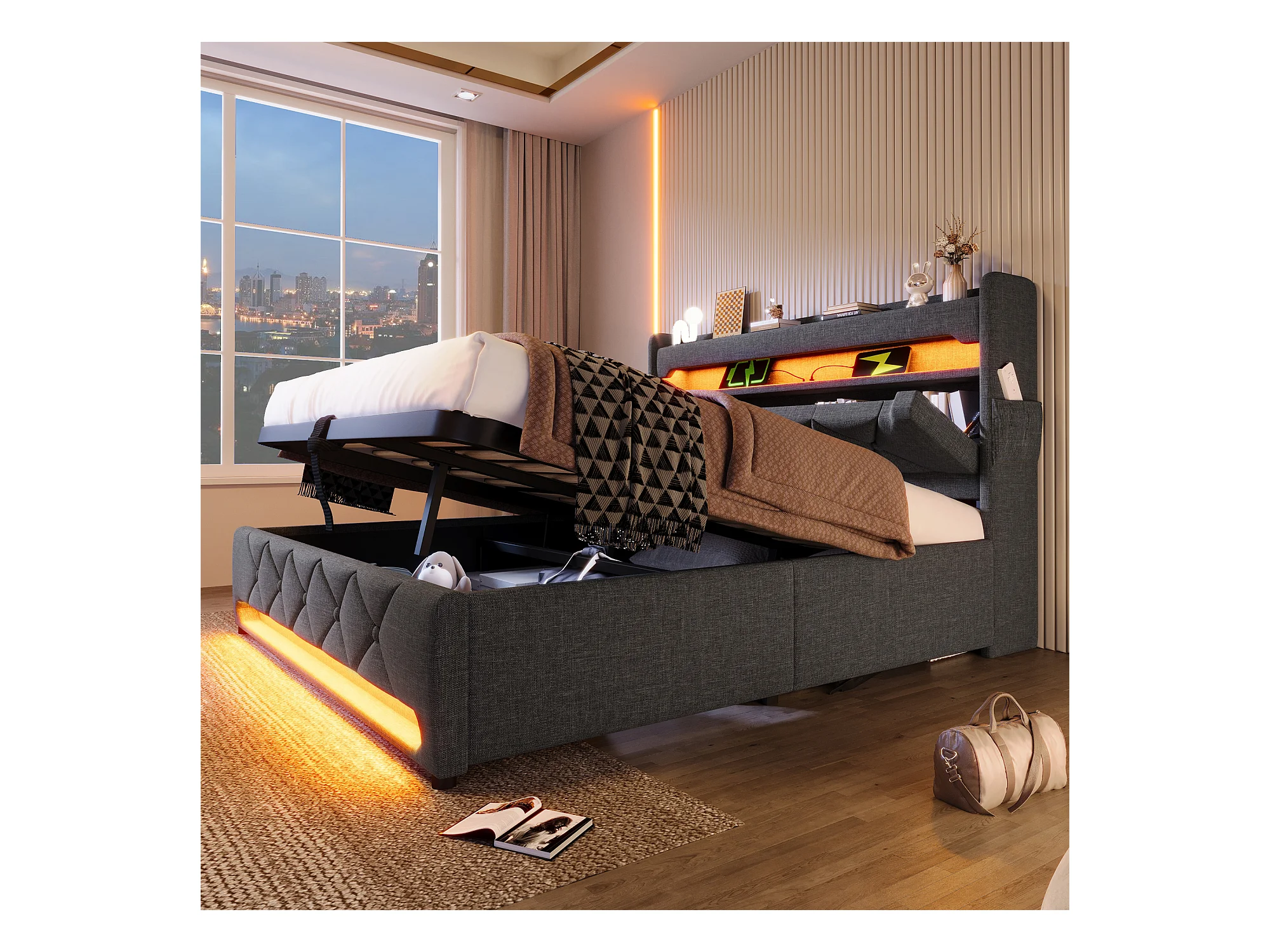 Lit coffre rembourré - 160 x 200 cm - tête de lit avec USB + Type-C + Leds - rangement hydraulique - avec matelas - lin - gris