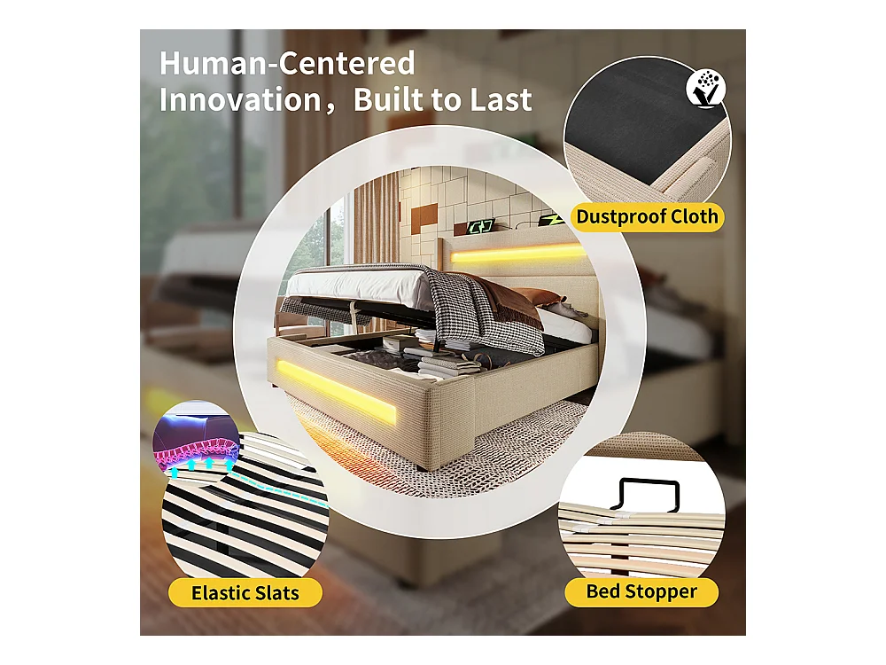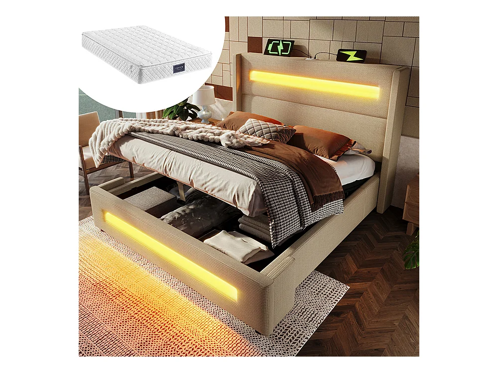 Lit coffre rembourré 160x200 avec LED lit avec espace de rangement hydraulique et recharge USB Type-C cadre de lit en métal lin beige avec matelas