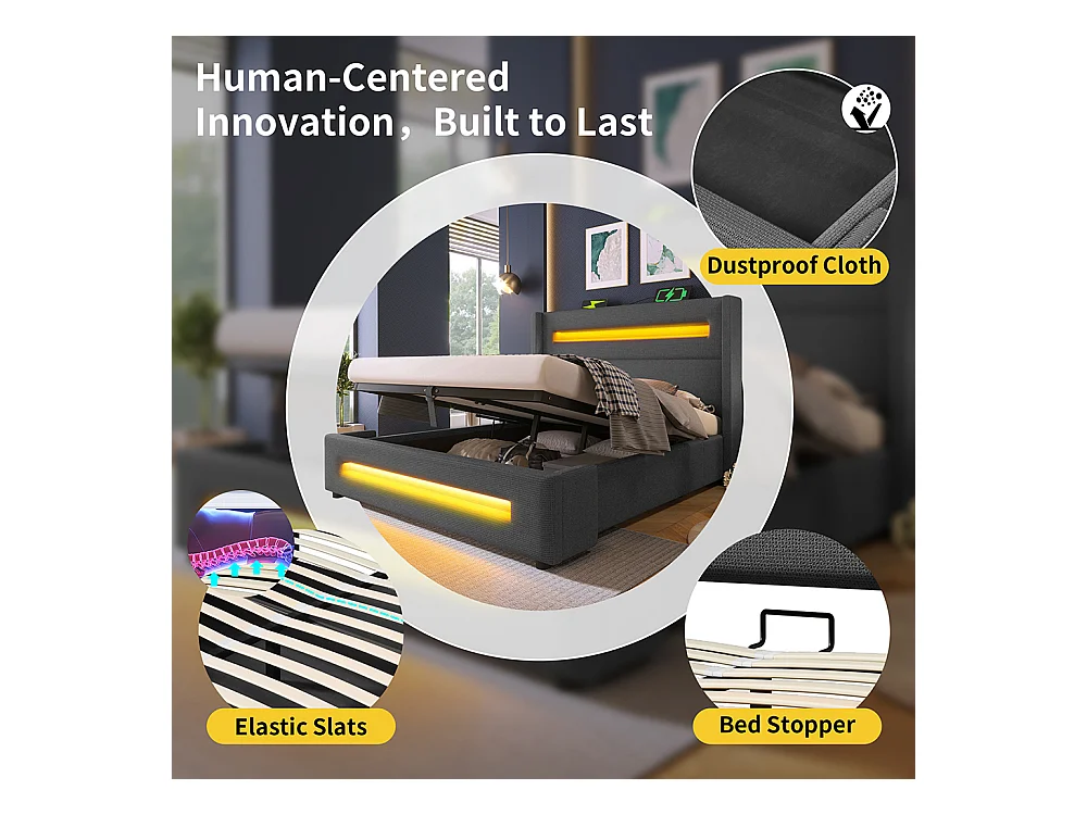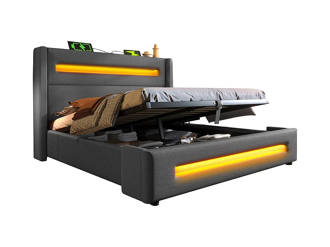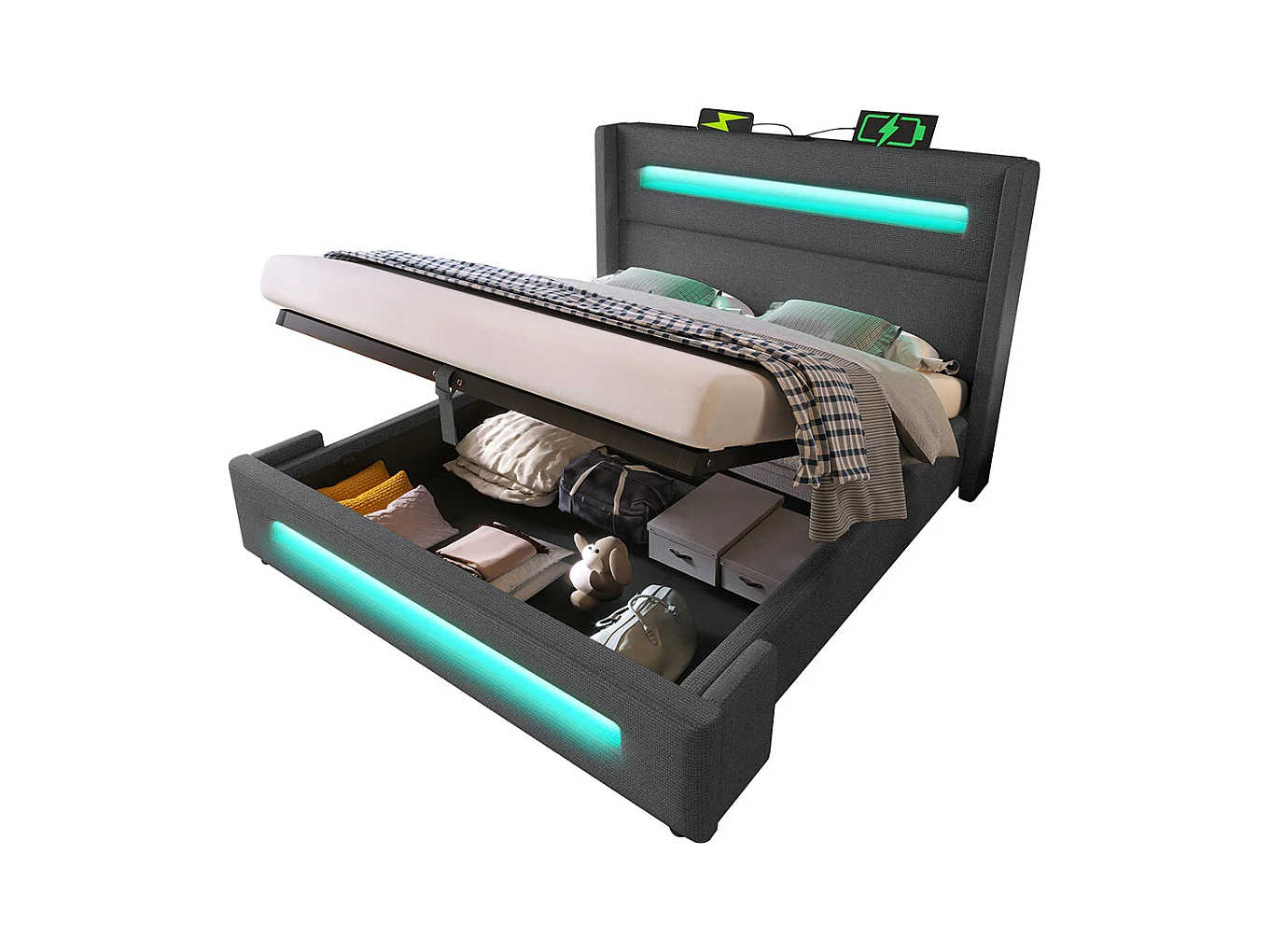 Lit coffre rembourré 160x200 avec LED lit avec espace de rangement hydraulique et recharge USB Type-C cadre de lit en métal lin gris