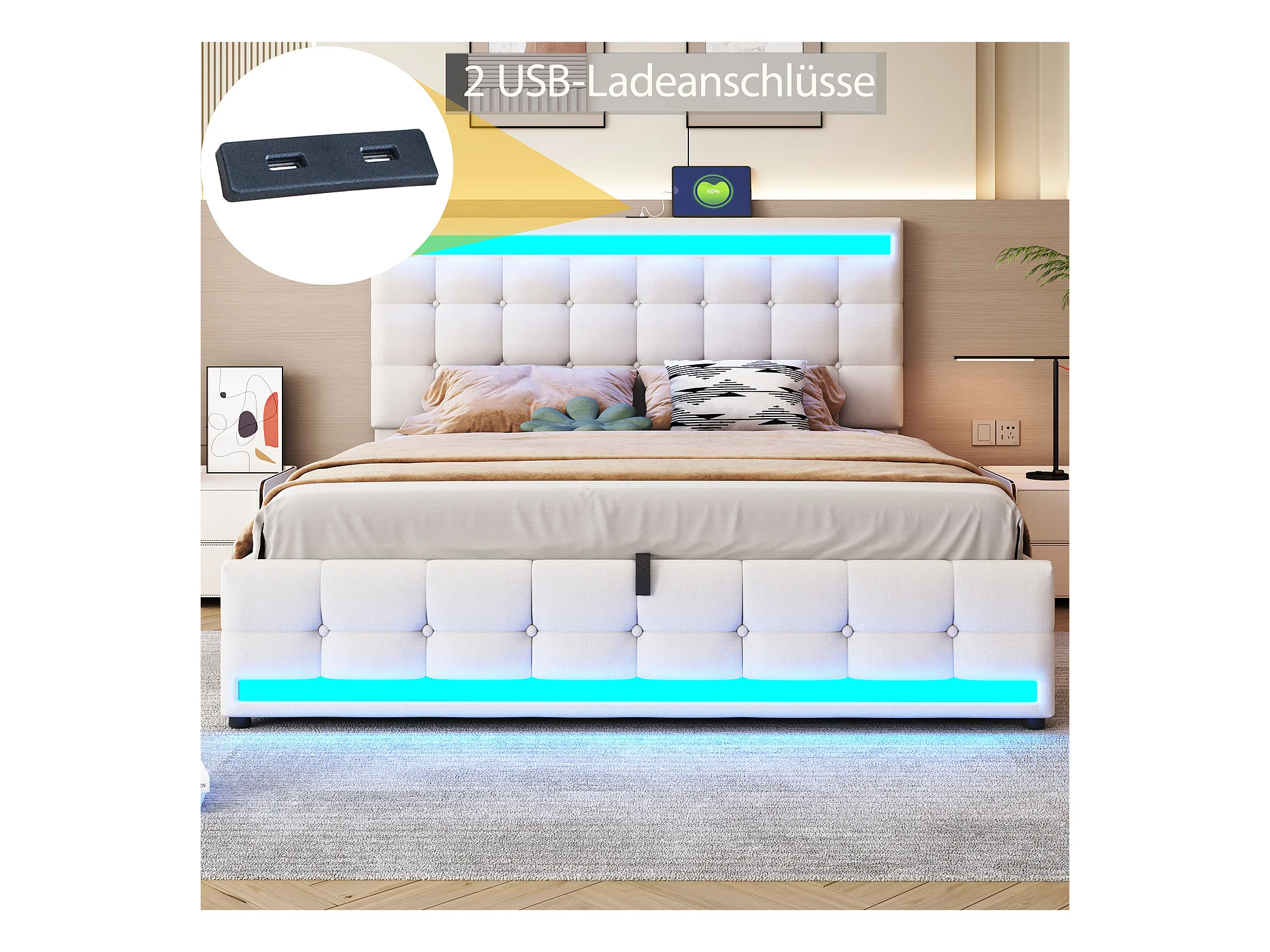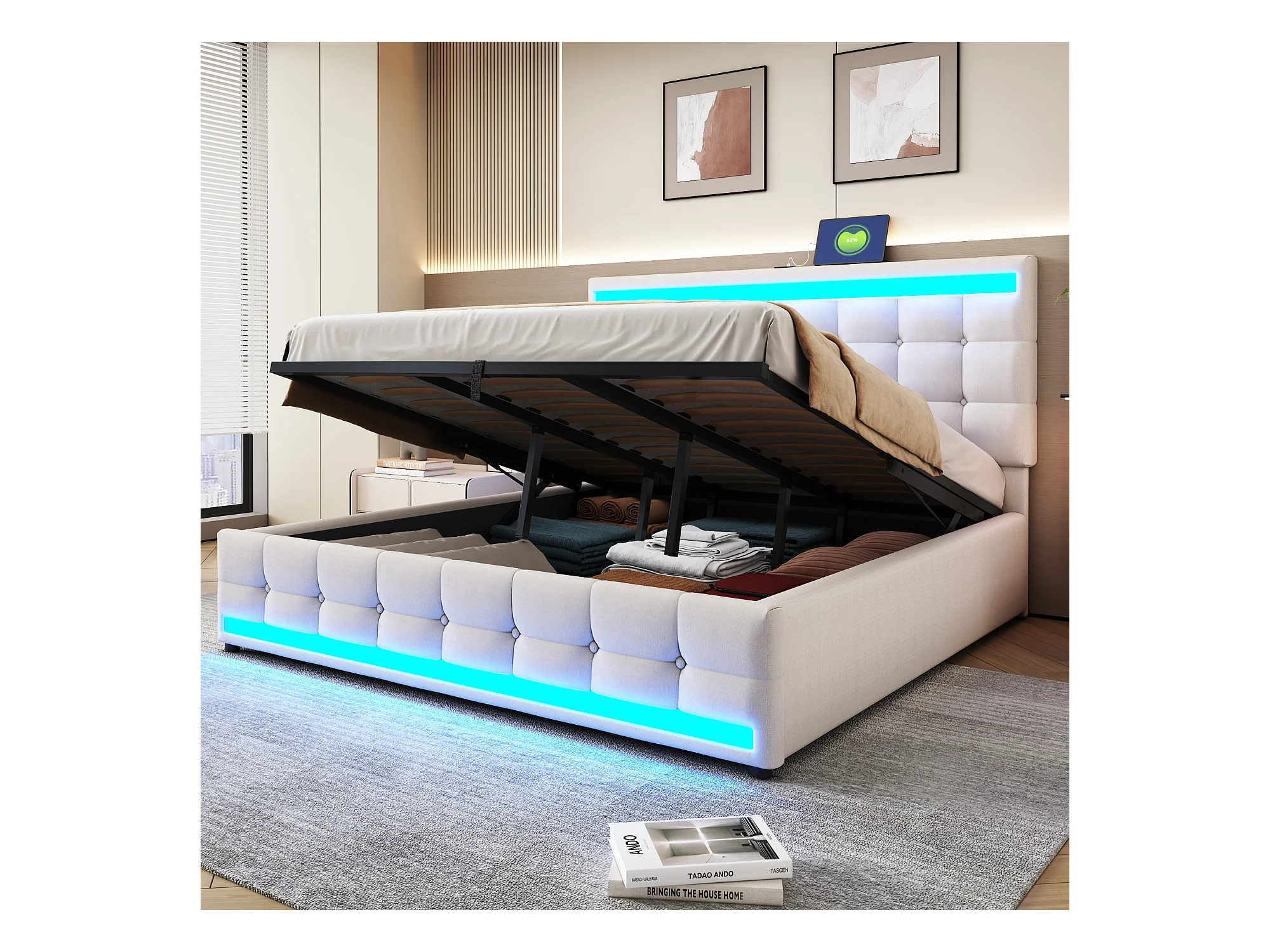 Lit coffre rembourré - 180 x 200 - rangement hydraulique - avec USB + Leds - lin + contreplaqué + MDF - beige