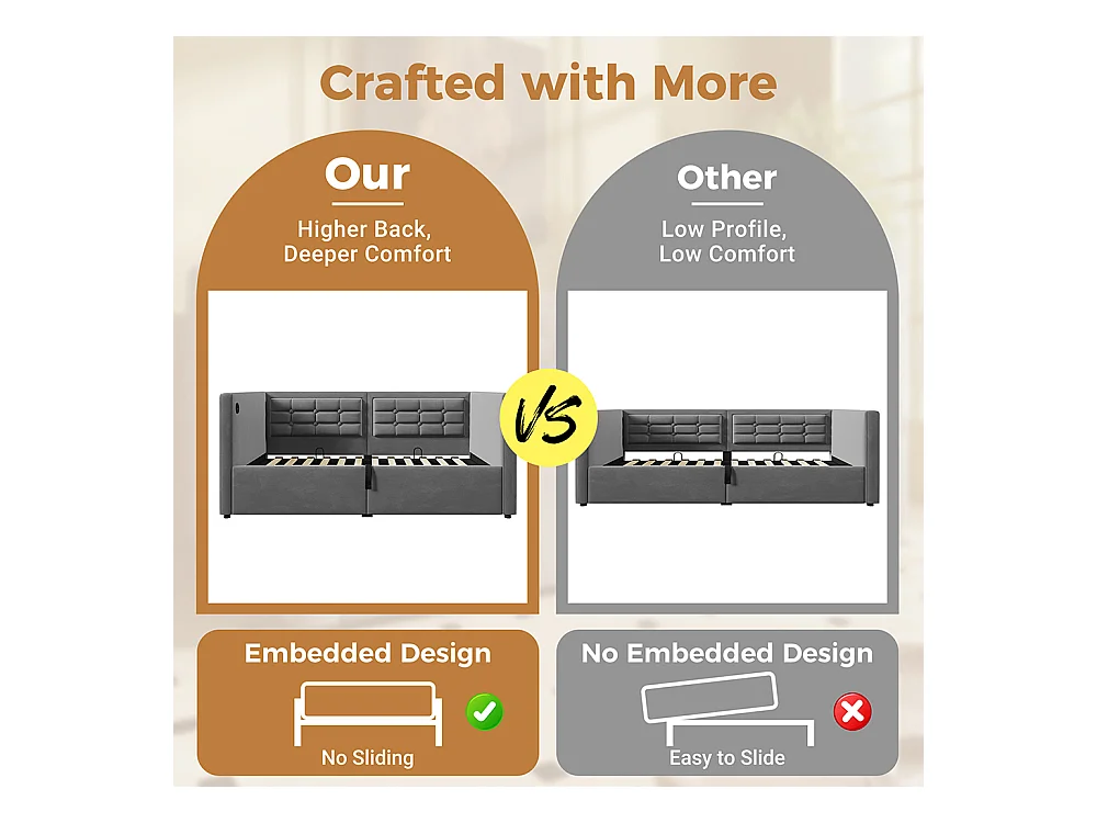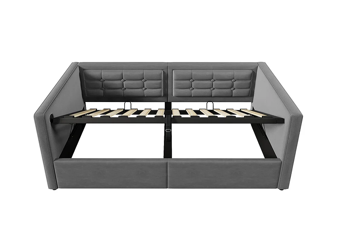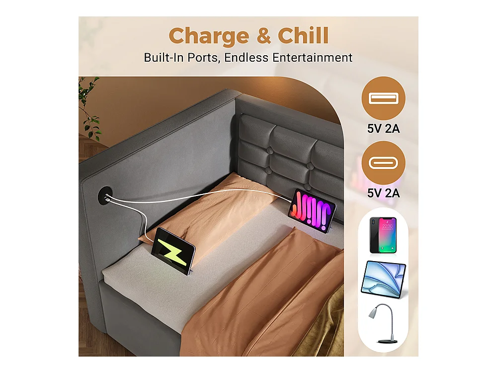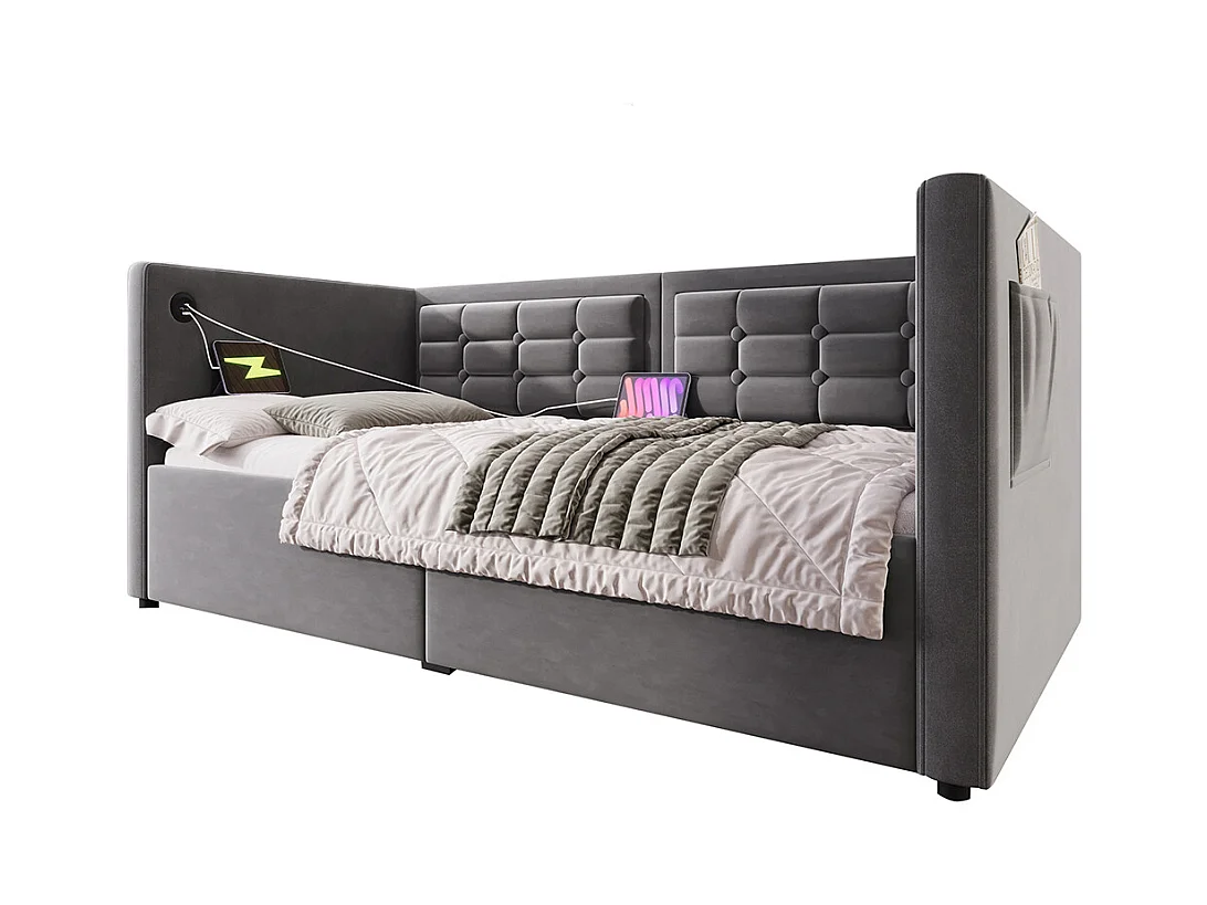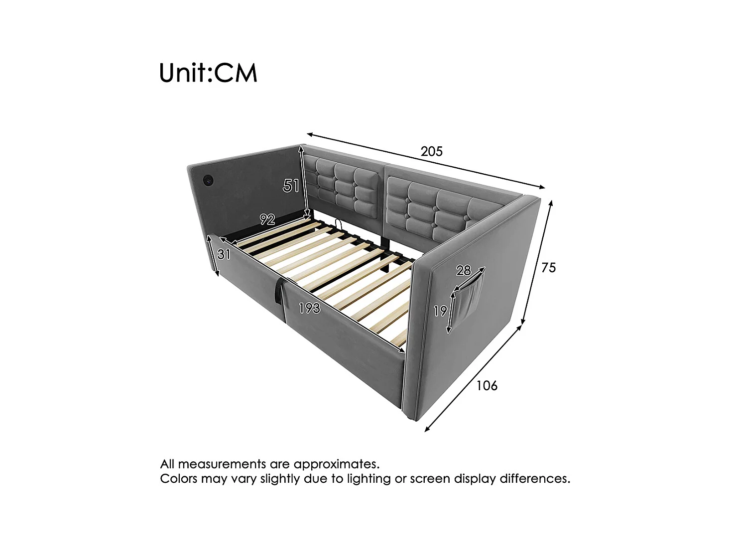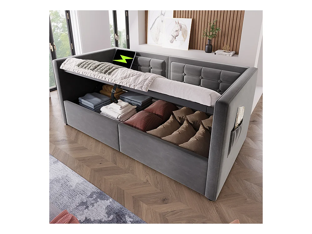 Lit coffre rembourré 90x190 canapé-lit simple avec espace de rangement hydraulique et station de recharge USB et Type-C lit en bois velours gris