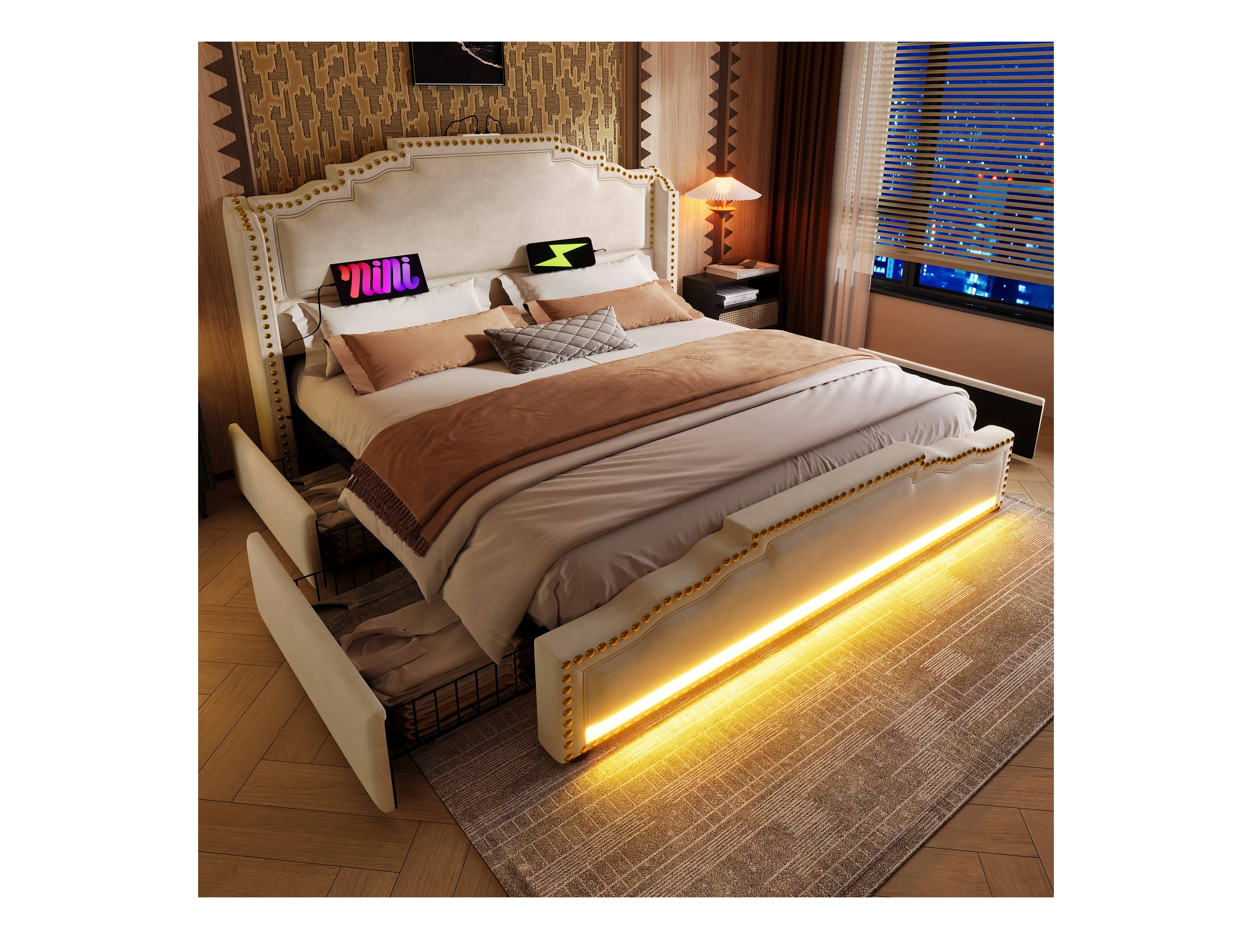 Lit coffre rembourré double - 160 x 200 cm - avec Leds + USB-C + 4 tiroirs - velours - beige