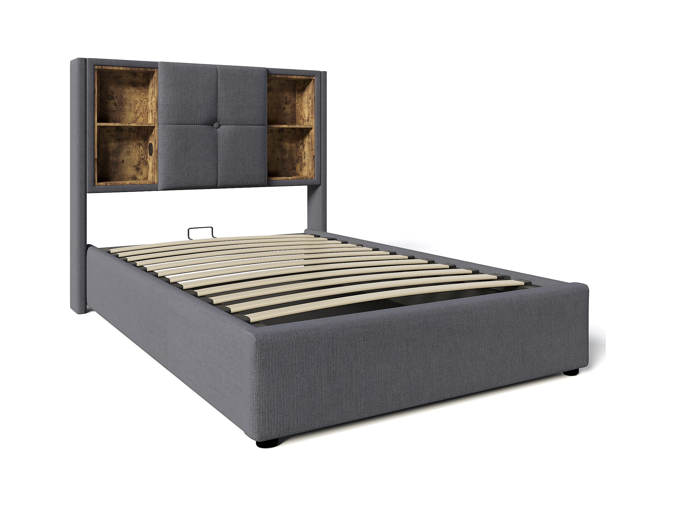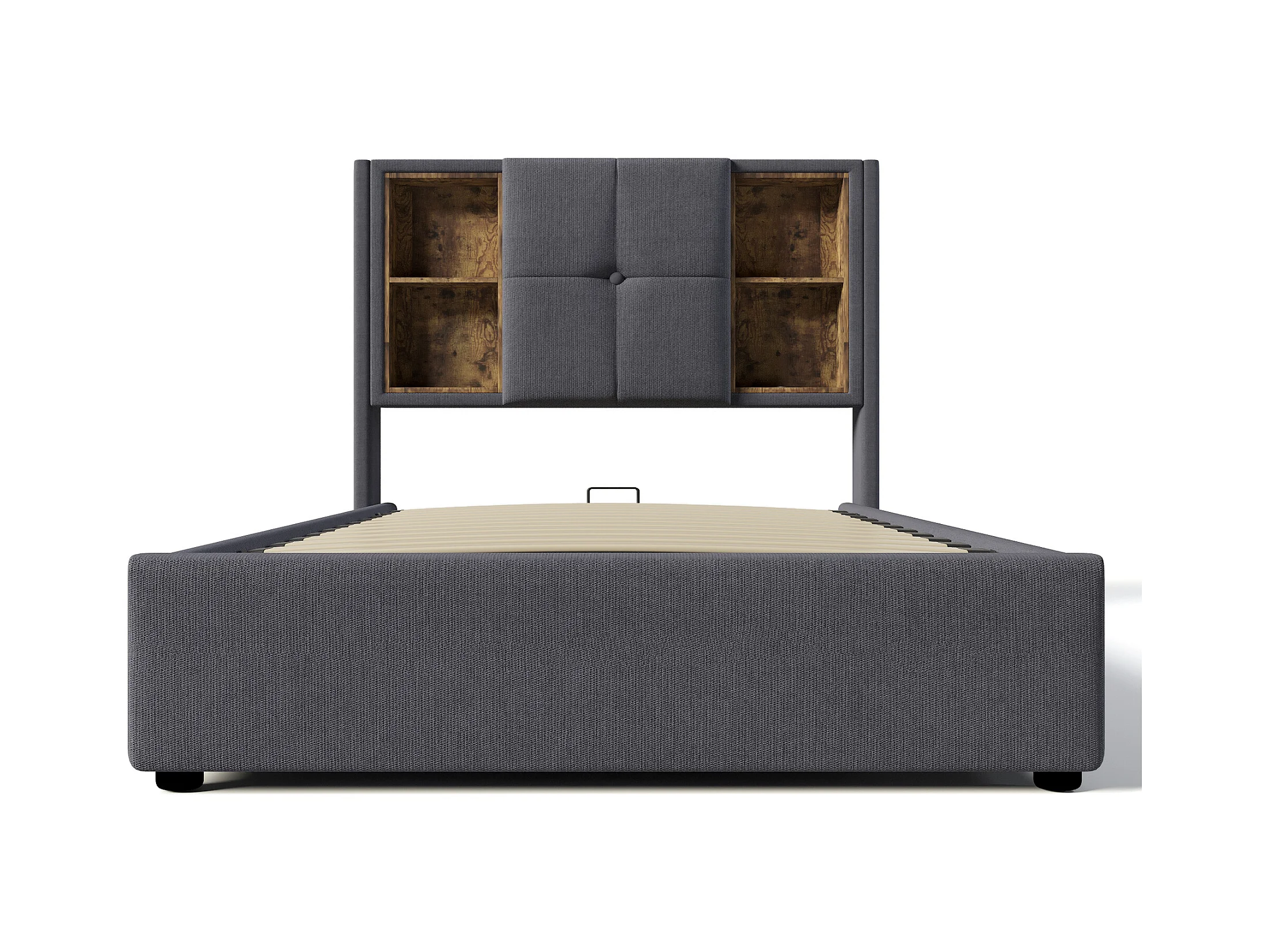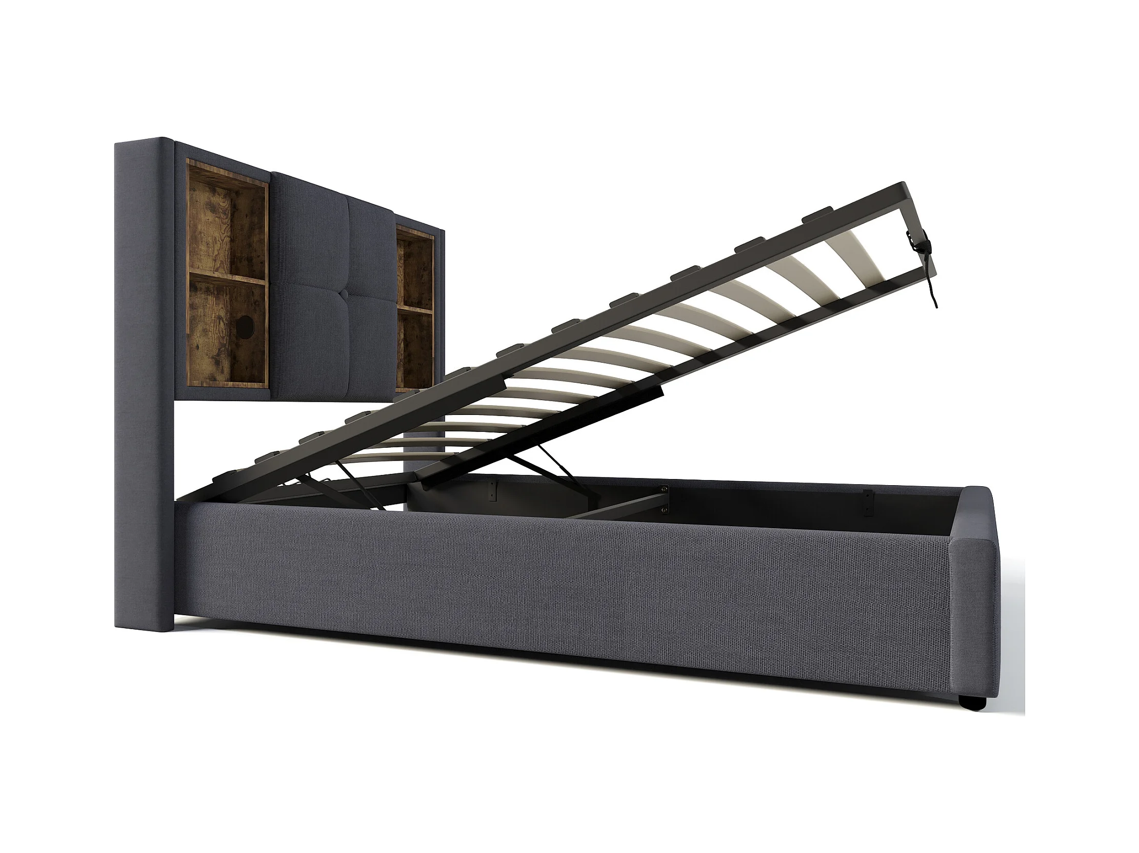 Lit coffre enfant 90x200 cm avec USB-C sans fil - Sommier en bois - Coton gris (sans matelas)
