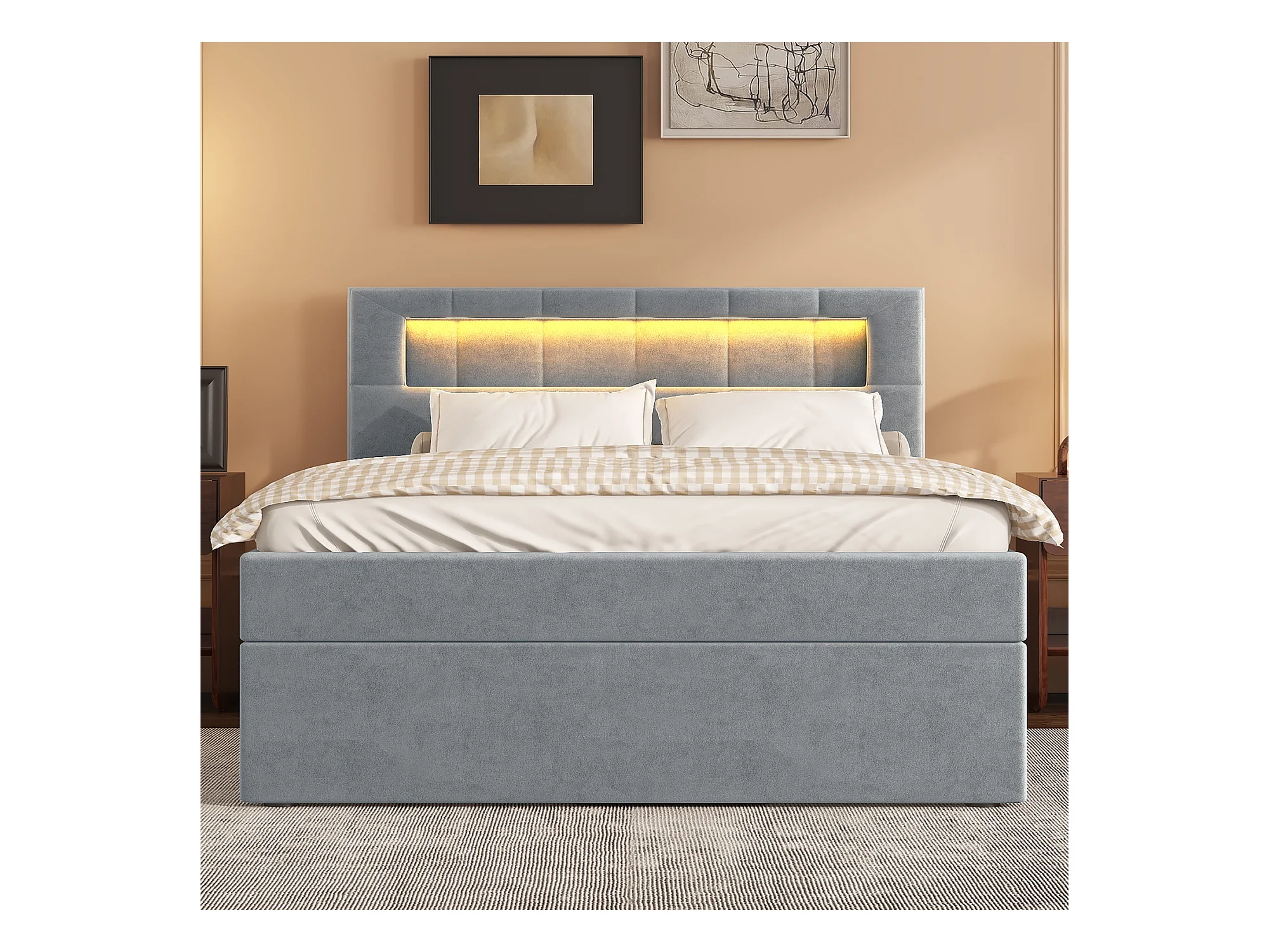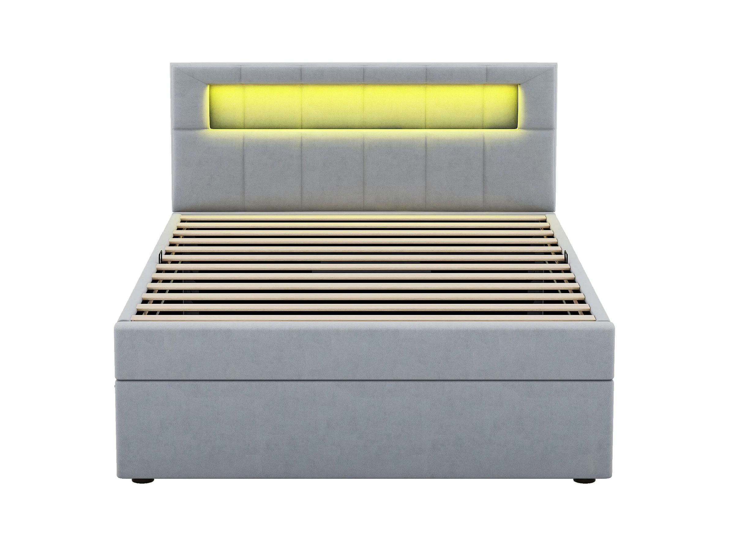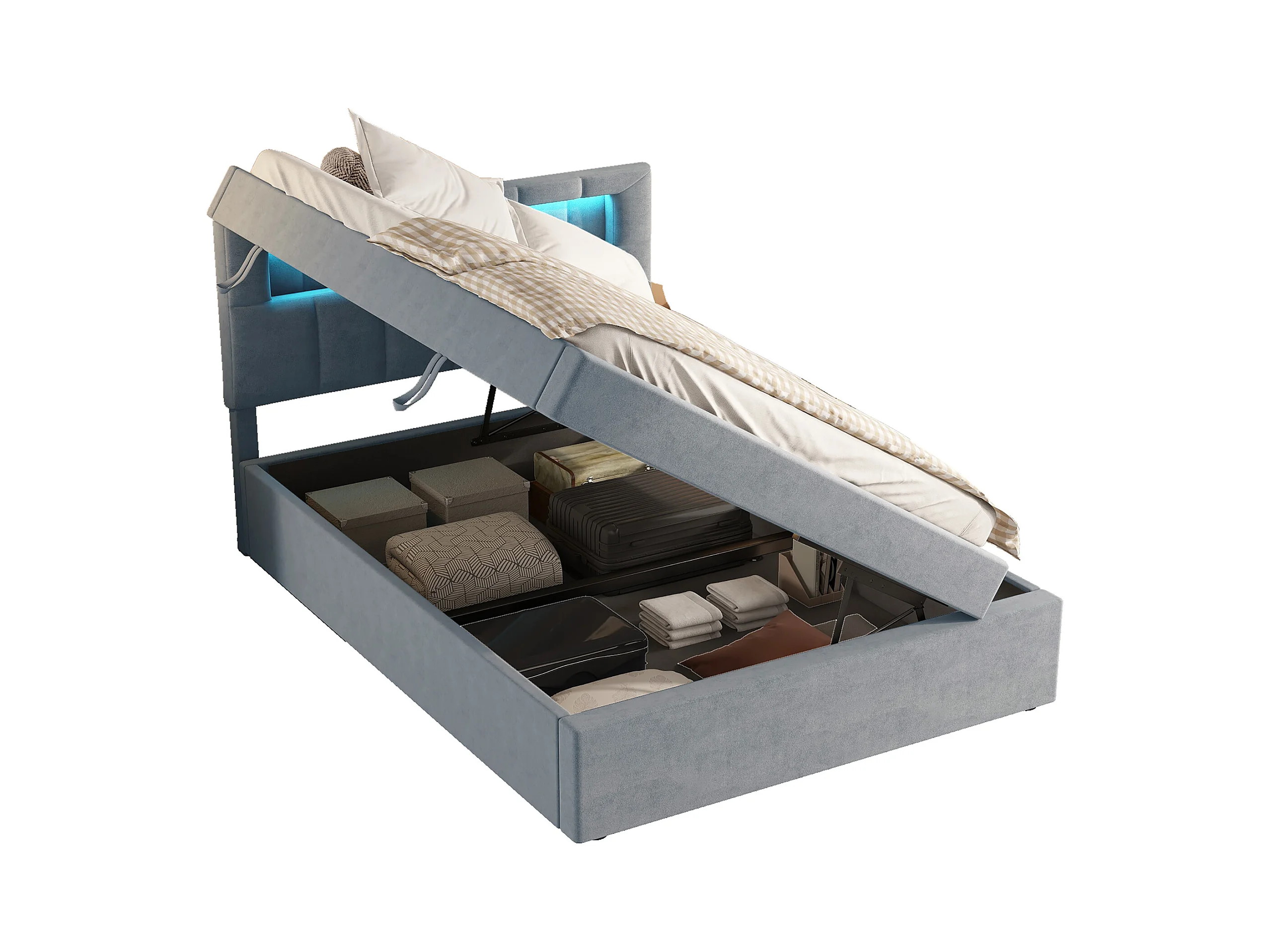 Lit coffre enfant 90x200 cm en velours gris - Lit avec éclairage ambiant, tête de lit réglable(sans matelas)