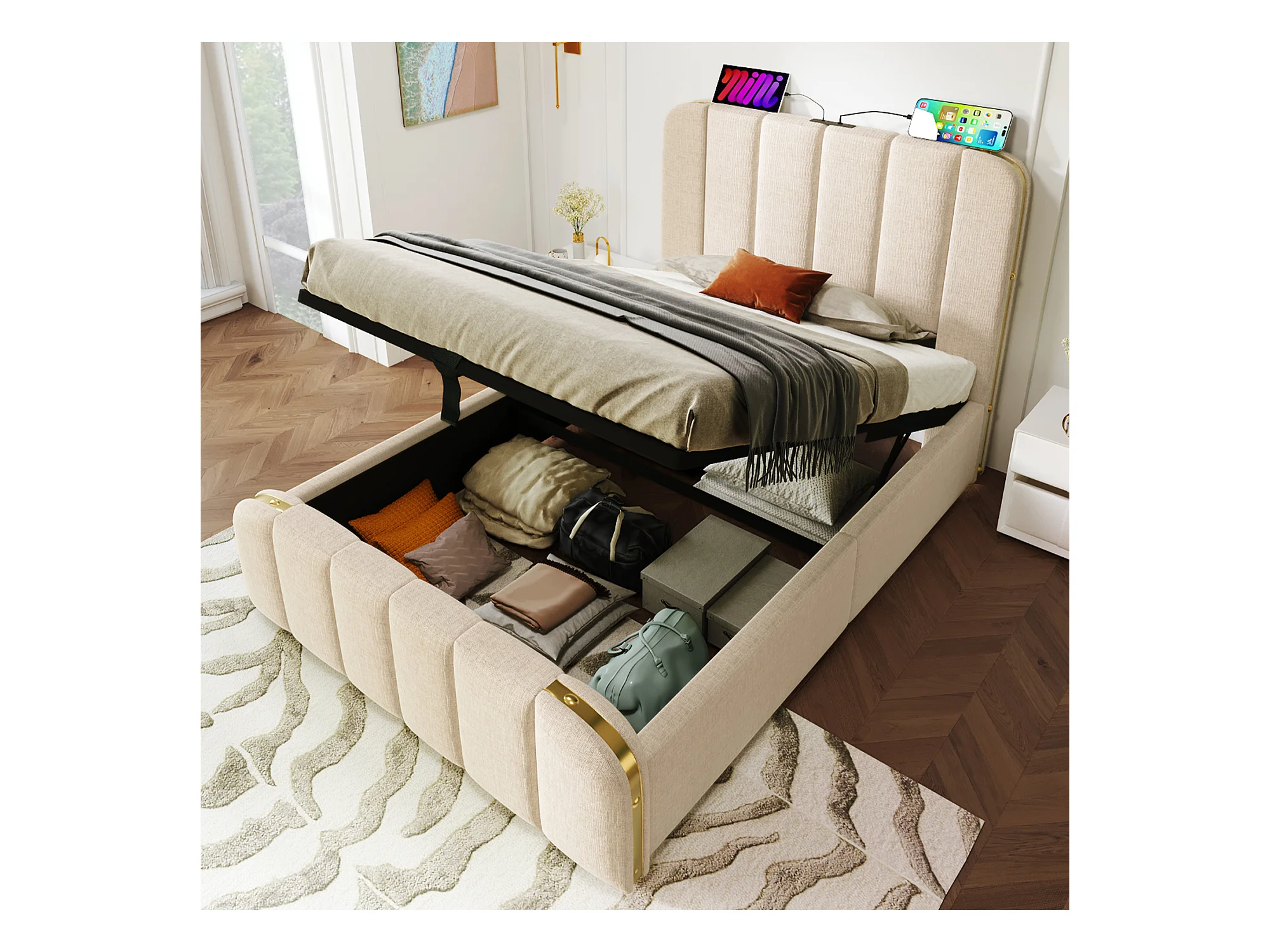 Lit coffre enfant 90x200 cm - Tête de lit avec bandes dorées et Charge USB Type-C - Lin beige (sans matelas)