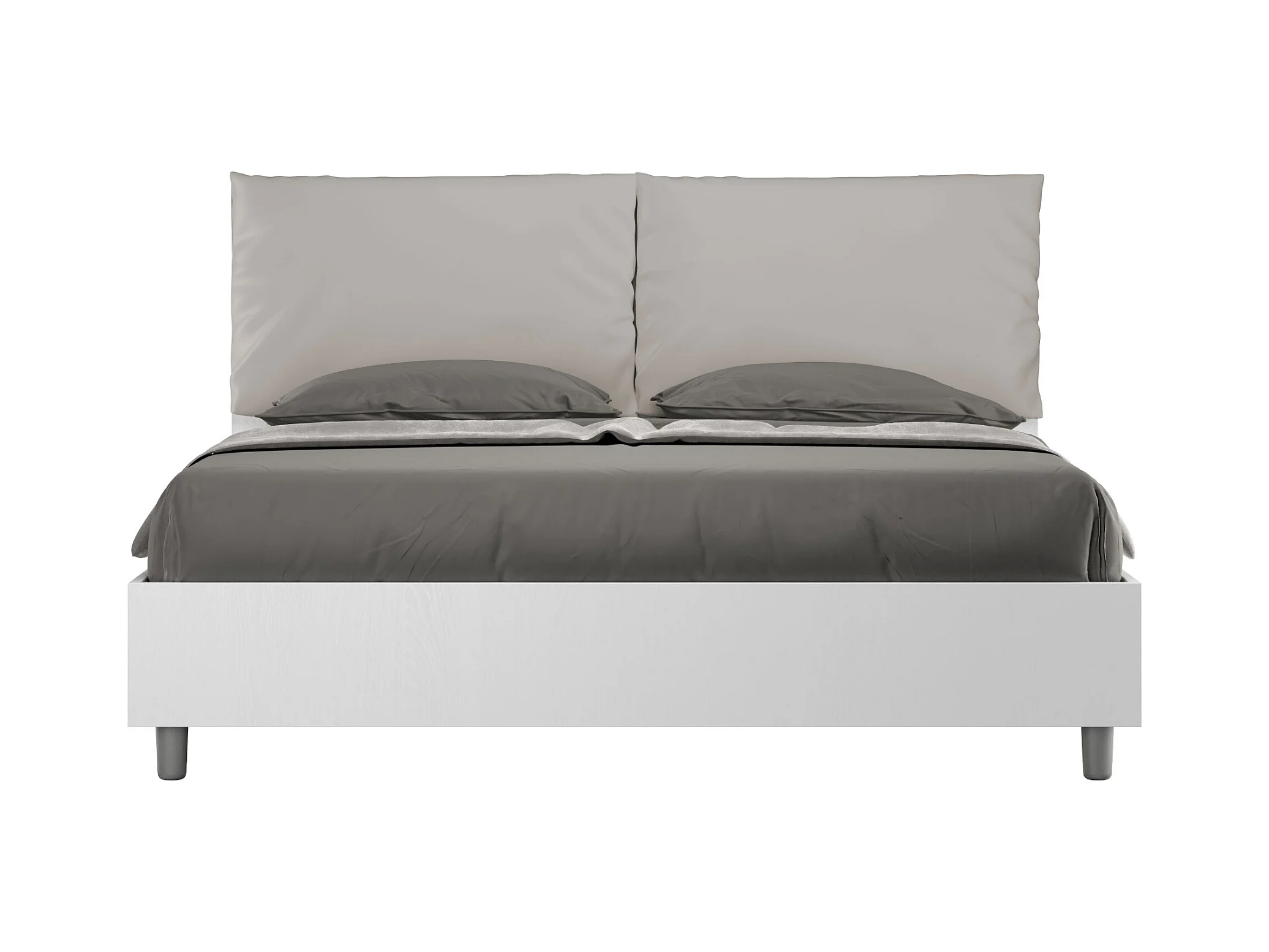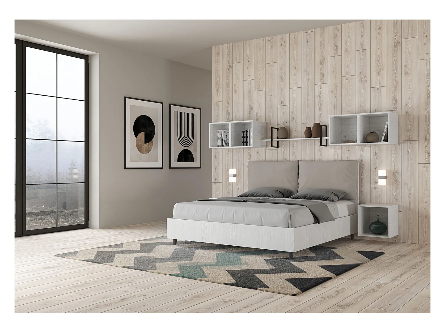 Lit double avec rangement, double relevable, 160x200 cm, bois de frêne blanc, coussins simili cuir gris tourterelle, Egos Antea
