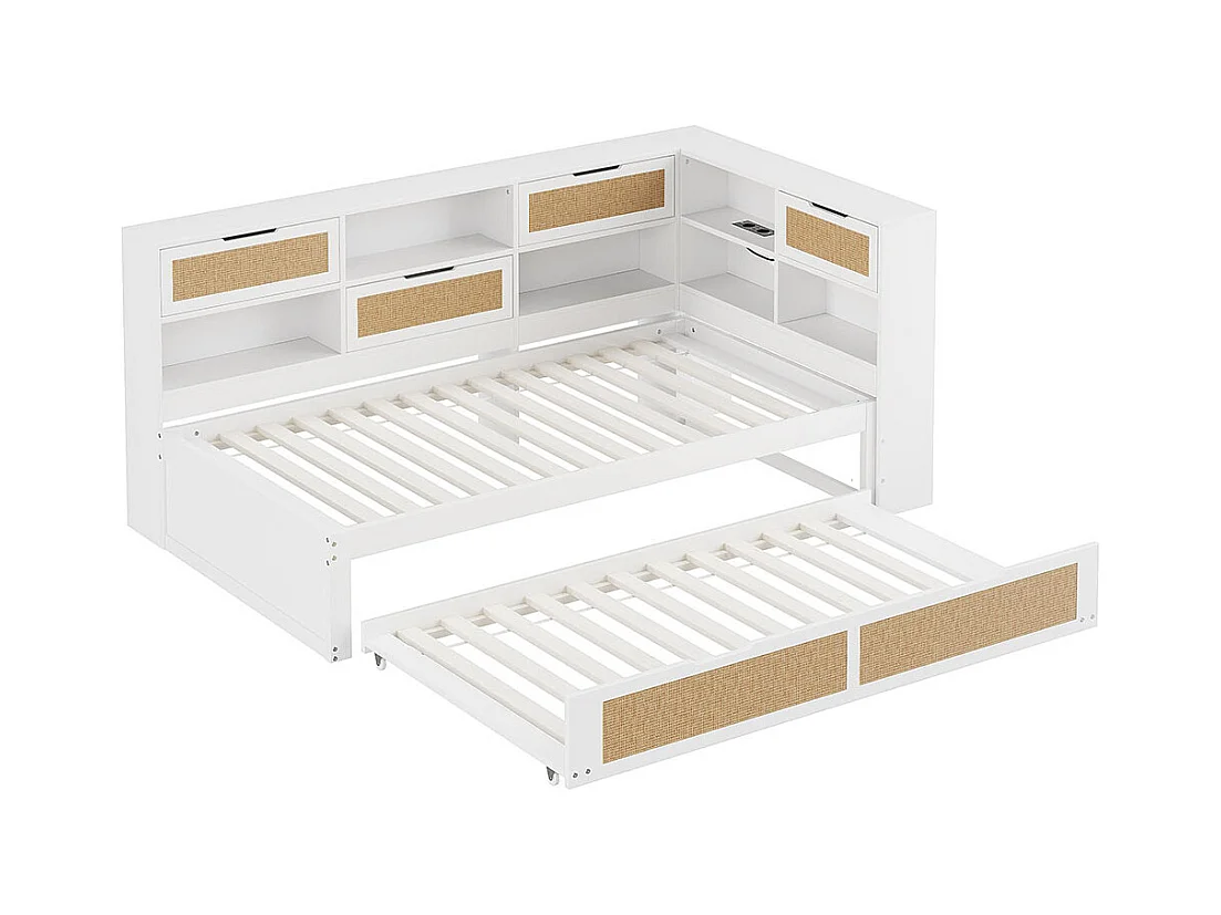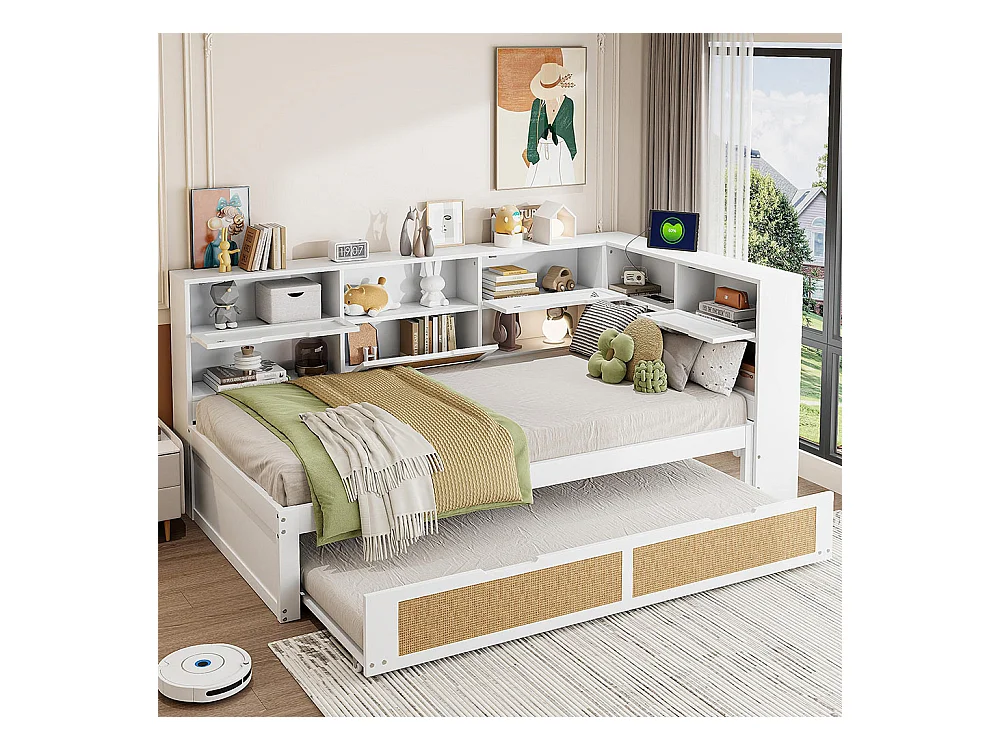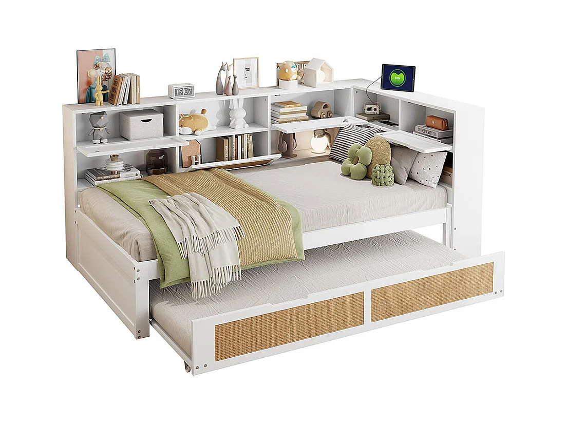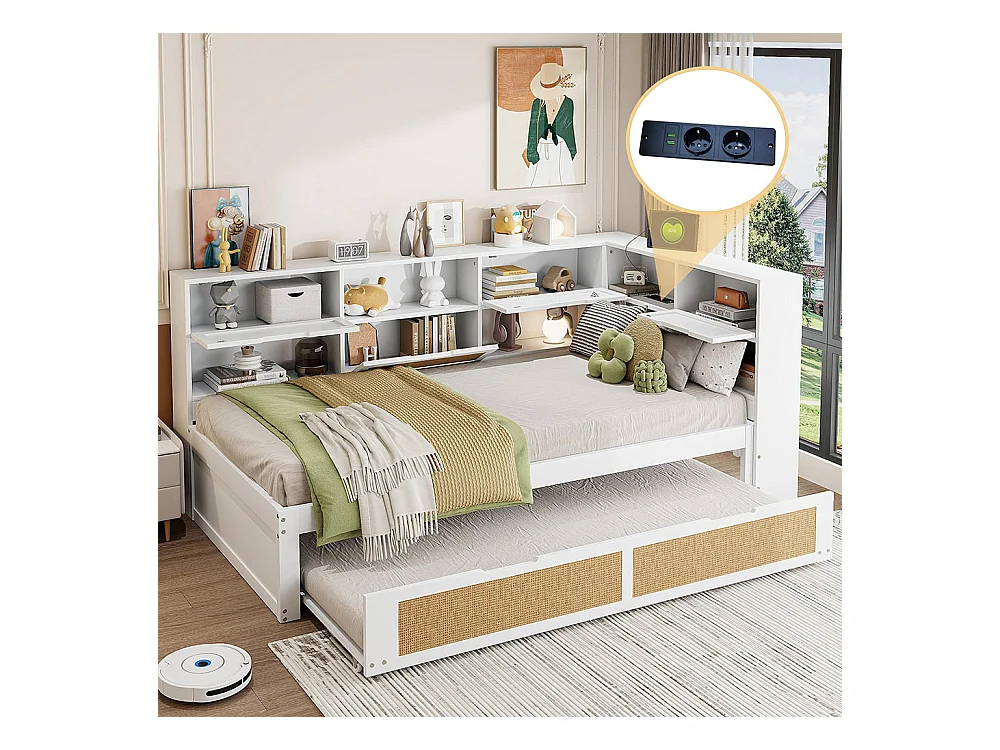 Lit combine en bois 90×200 avec lit gigogne lit enfant multifonctionnel avec de nombreux compartiments de rangement et une connexion de chargement blanc