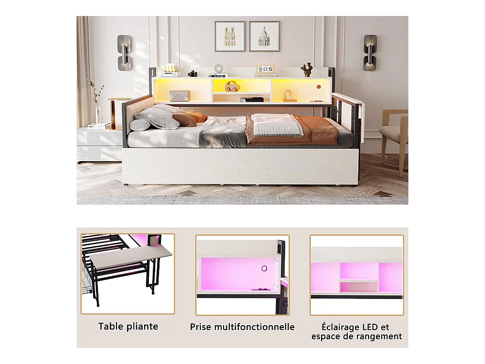 Lit combiné en fer 90x200 cm avec LED rangement tiroirs prise multifonctionnelle bureau rabattable dossier moelleux blanc