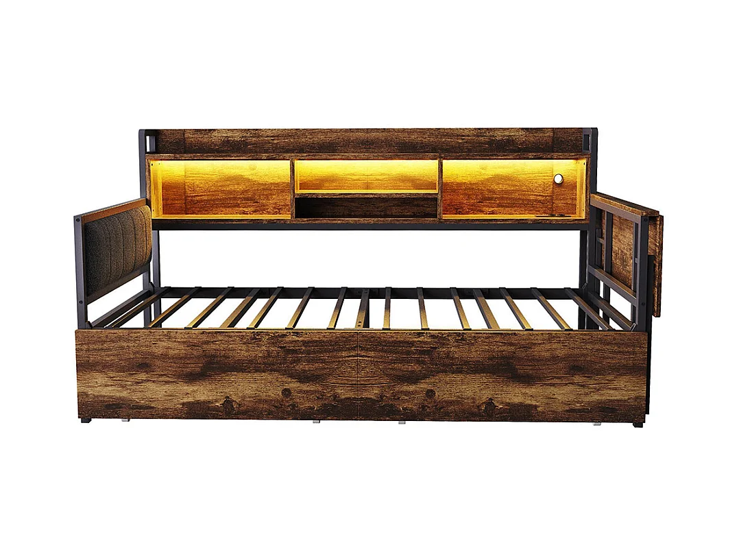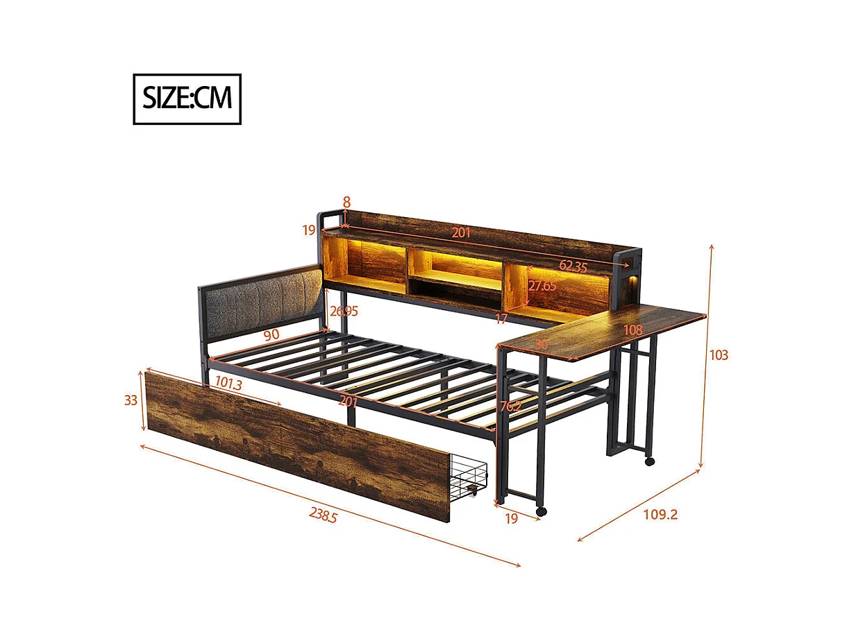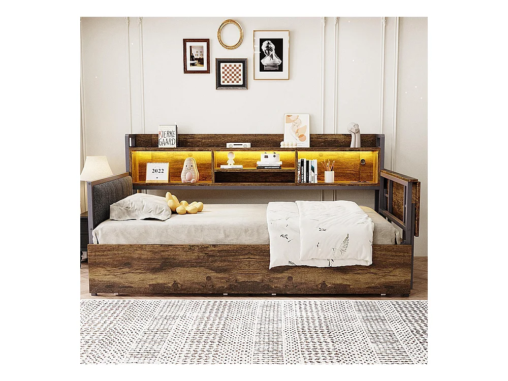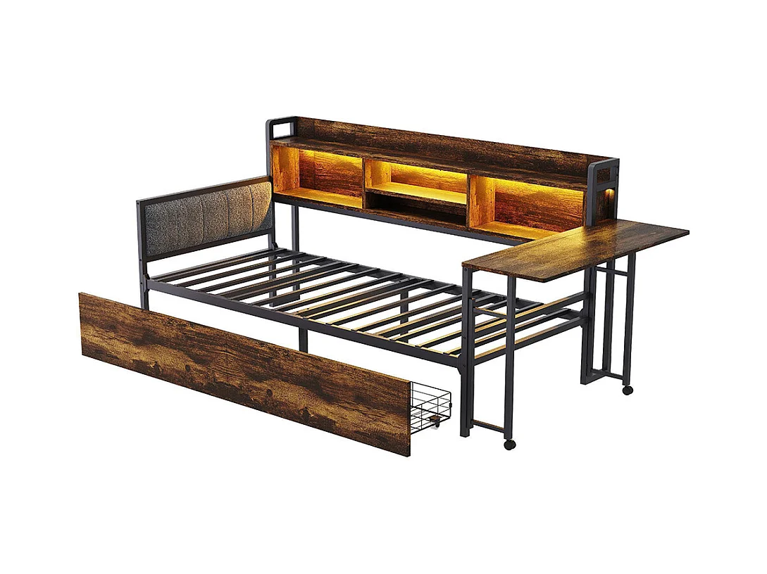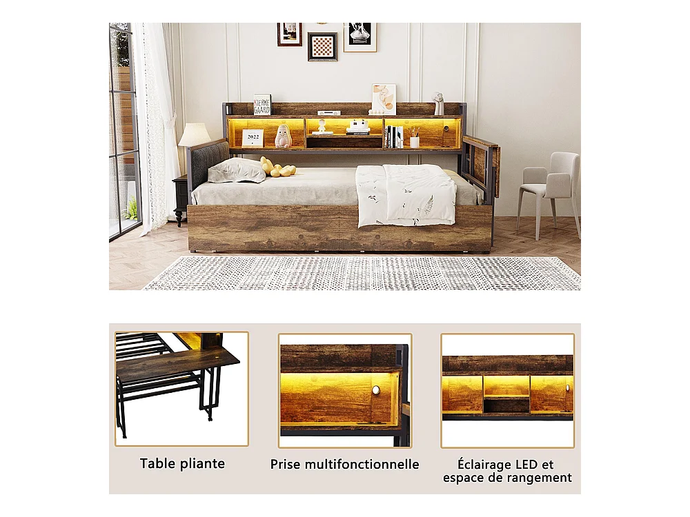 Lit combiné en fer 90x200 cm avec LED rangement tiroirs prise multifonctionnelle bureau rabattable dossier moelleux couleur bois