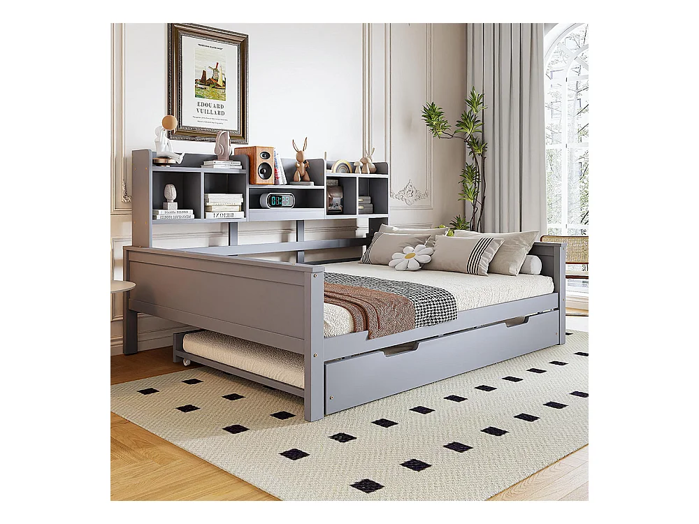 Lit combine extensible 140×200 en bois massif lit extensible 90×190 avec compartiment de rangement et sommier à lattes pin gris