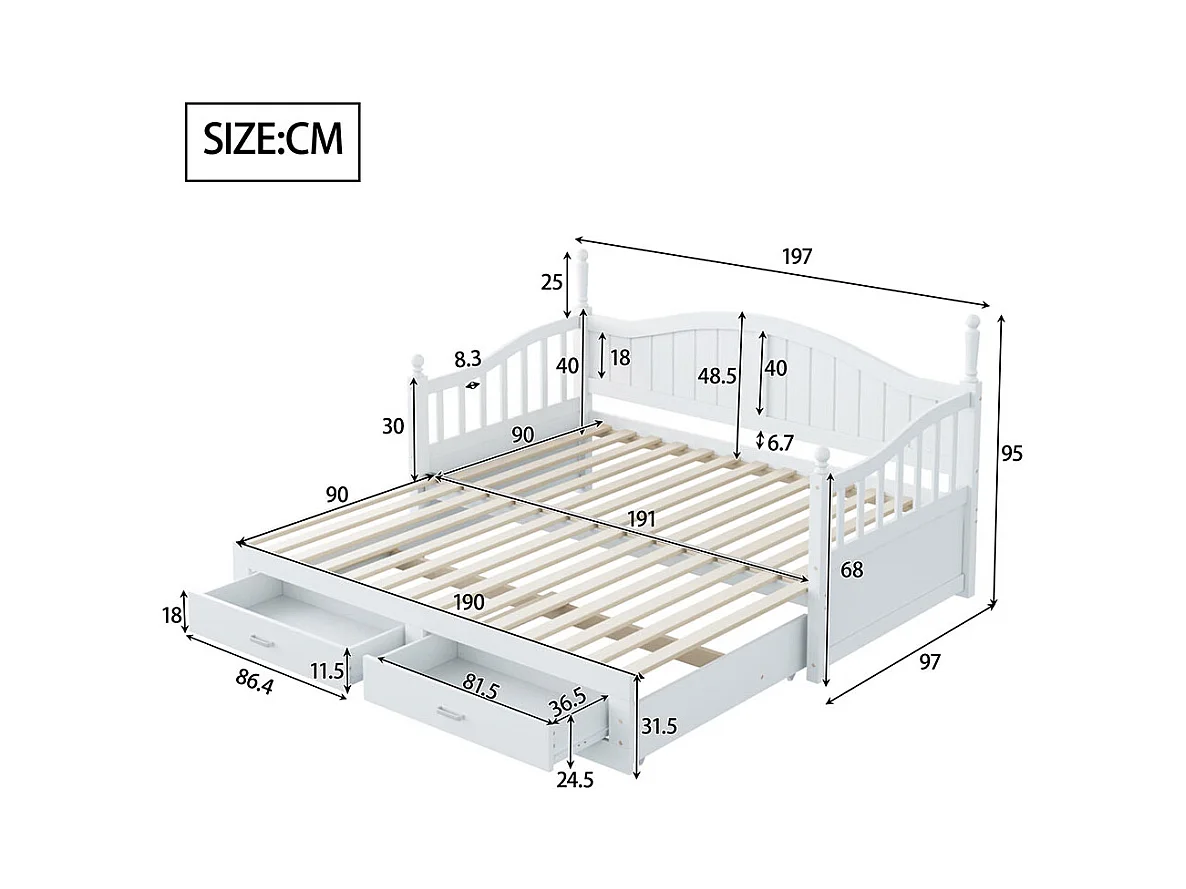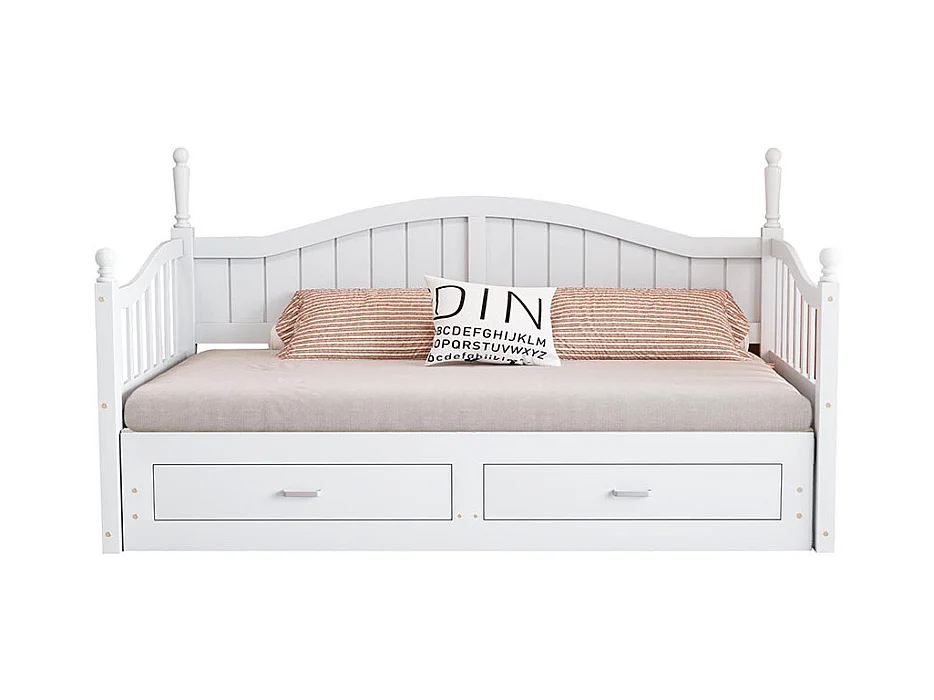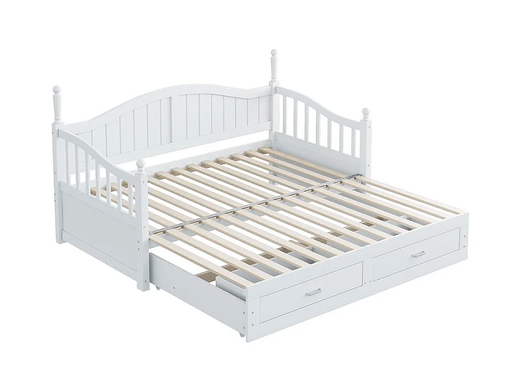 Lit combine extensible En bois massif 90/180×190 avec colonnes romaines dossier incurvé et accoudoirs avec tiroirs et sommier à lattes lit en pin blanc