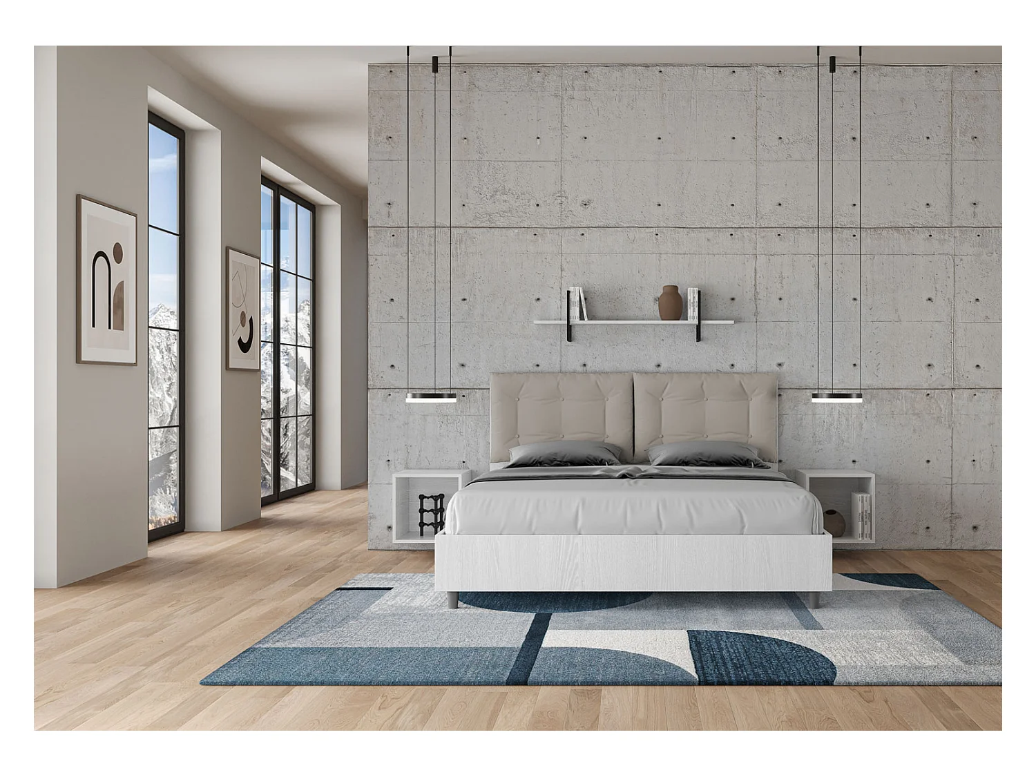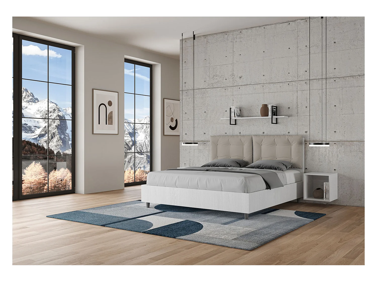 Lit double avec rangement, double relevable, 160x200 cm, bois de frêne blanc, coussins en simili cuir gris tourterelle, Egos Annalisa
