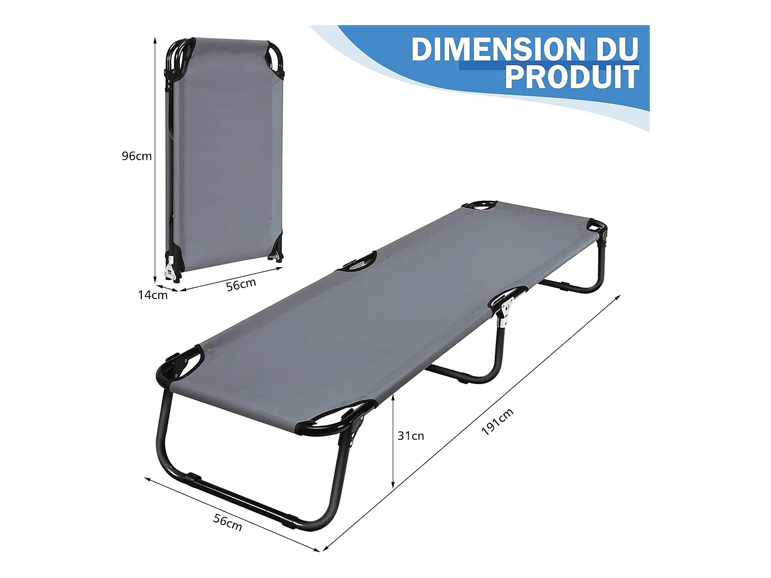 Lit de Camping Pliable en Tissu et velours Oxford avec Tubes Métalliques Épaissis, Compatible Sac de Couchage, 190x56x30 cm,Gris, 150kg