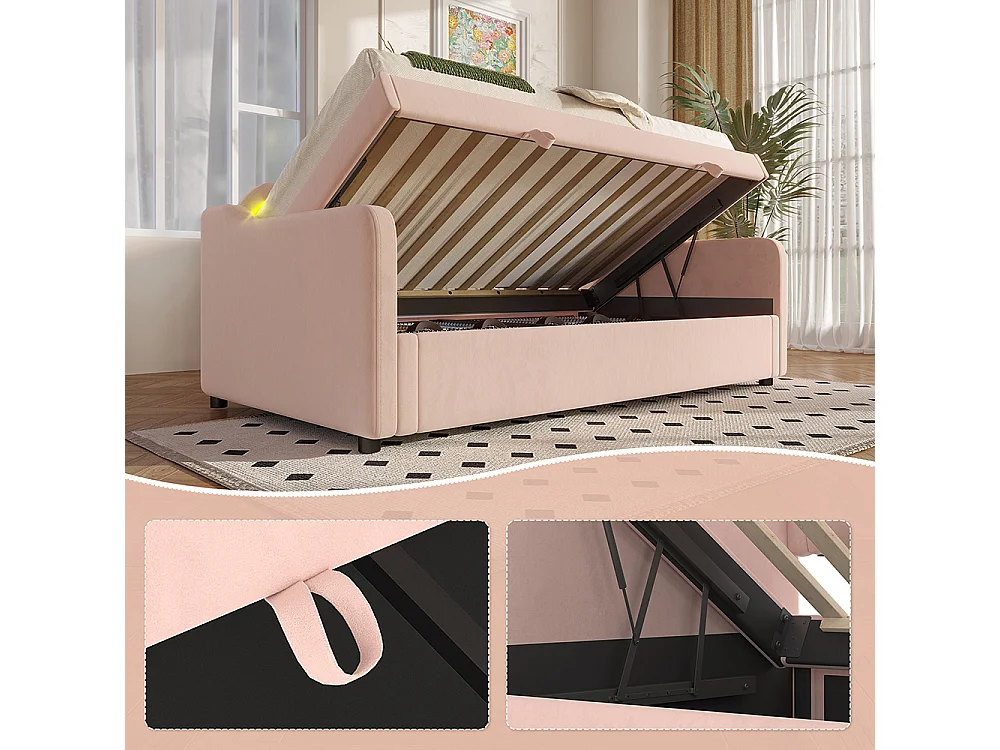 Lit de jour 90x200cm, canapé-lit, lit hydraulique, avec espace de rangement, bande led à couleur changeante, lit simple (sans matelas), velours, rose