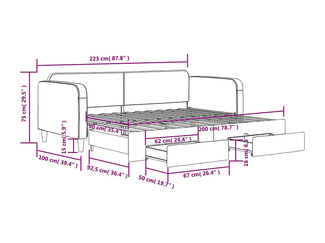 Lit de jour avec gigogne et tiroirs sans matelas taupe 90x200cm