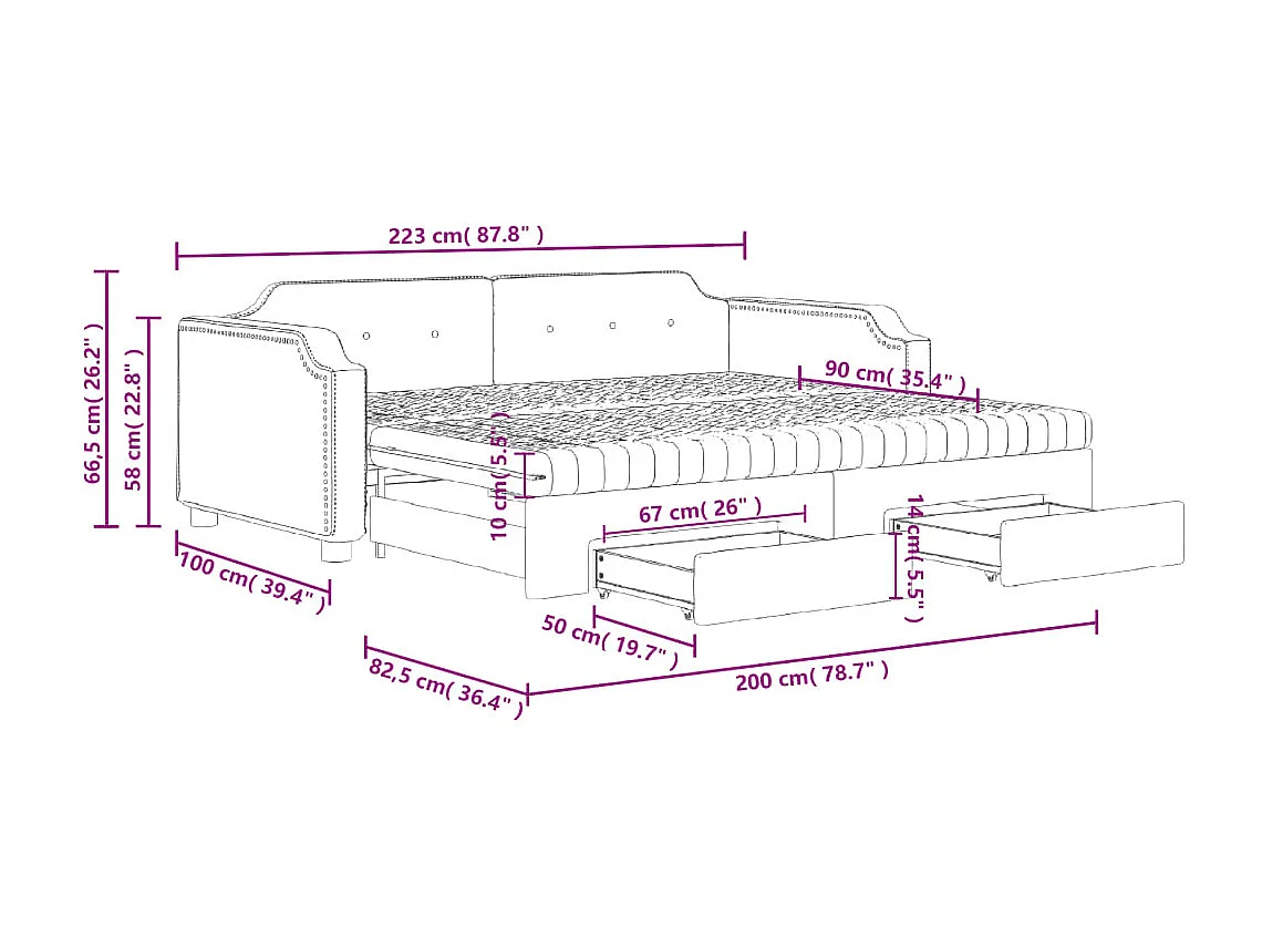 Lit de jour avec gigogne et tiroirs taupe 90x200 cm tissu