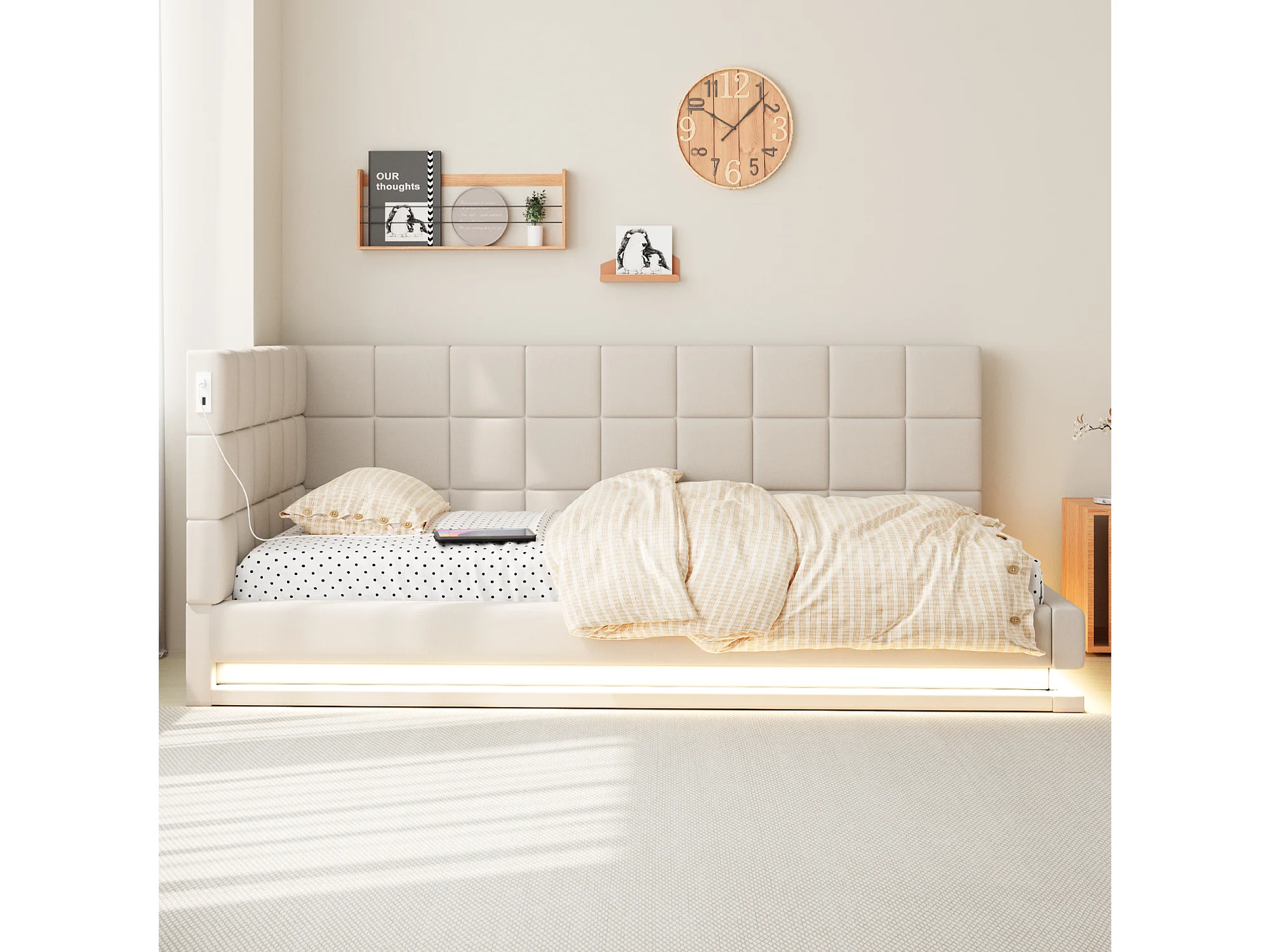 Lit de relaxation 90×200 cm en lin beige avec éclairage LED et prise USB, sommier à lattes robuste
